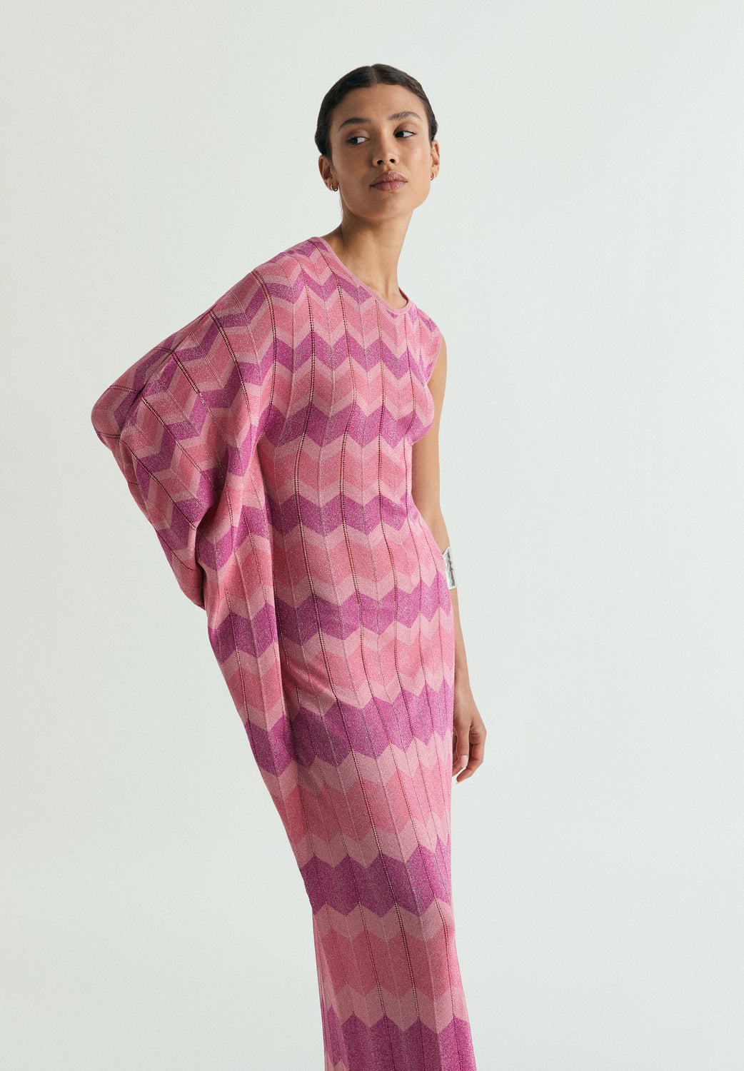 Vestido midi confeccionado en punto calado con hilo metalizado. Escote redondo y mangas asimétricas aportando amplitud al cuerpo. Estampado en zigzag a contraste. Abertura lateral en el bajo.