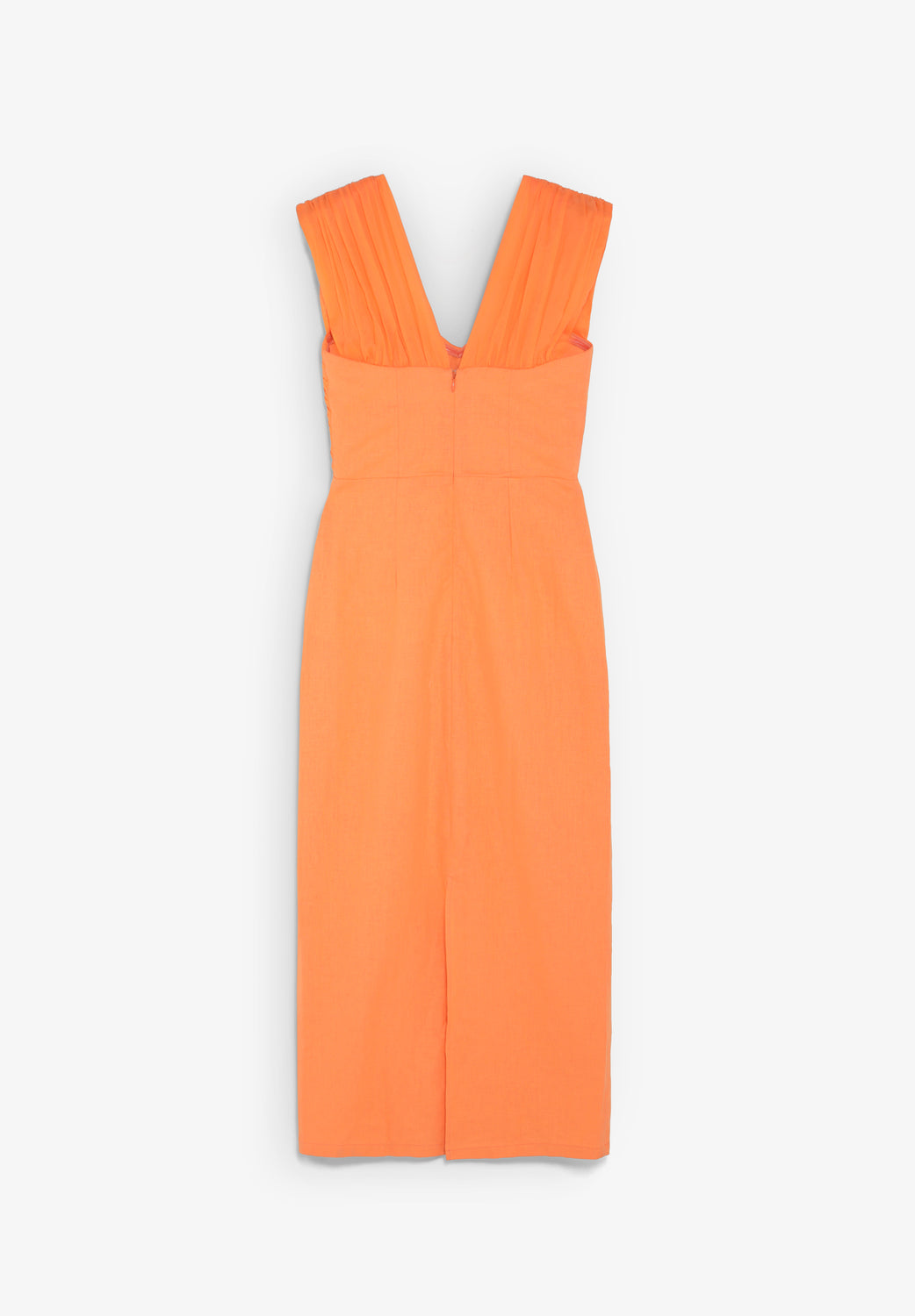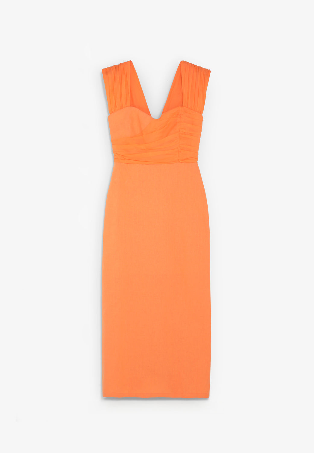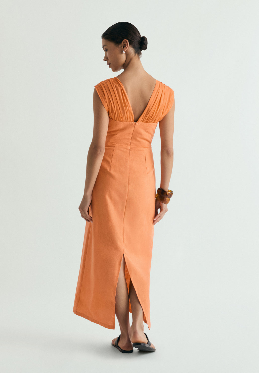 Vestido midi confeccionado en lino. Escote en forma de corazón con tirantes anchos creando un drapeado en el pecho. Cintura entallada y falda de caída recta. Cierre trasero con cremallera oculta y abertura en el bajo.