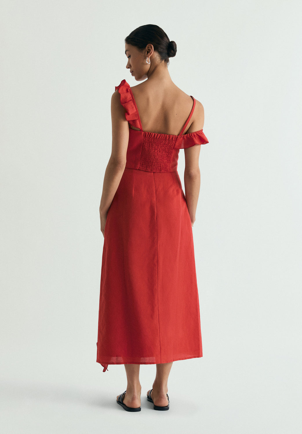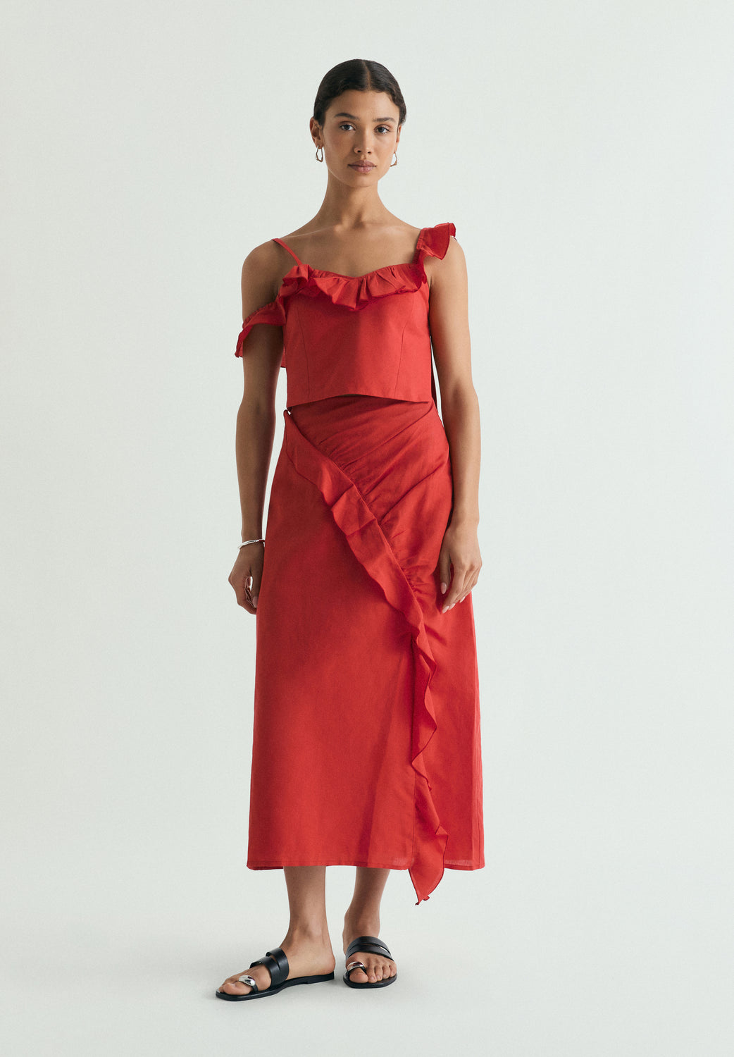 Falda midi confeccionada en lino. Corte recto. Volante diagonal en la parte delantera. Costura central trasera con cierre oculto.