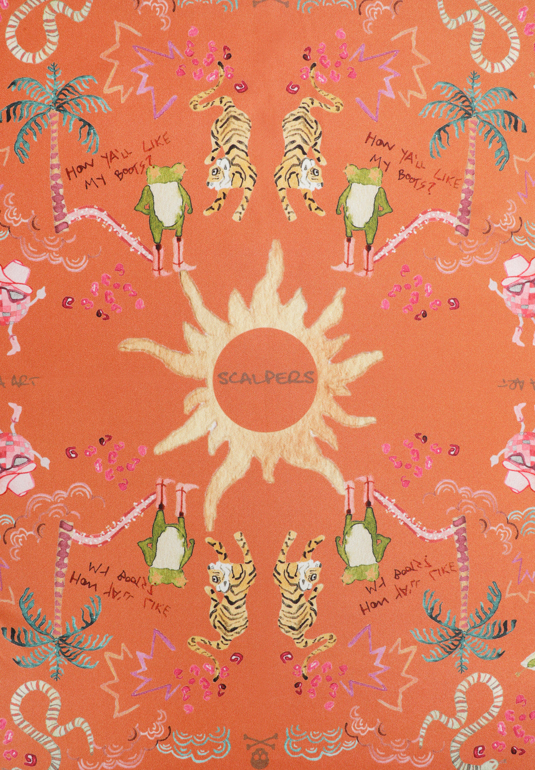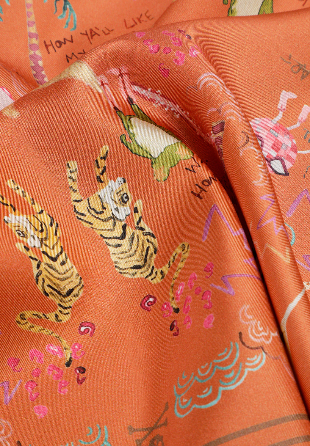 Pañuelo confeccionado en España en 100% seda con estampado motivos dibujos especiales.