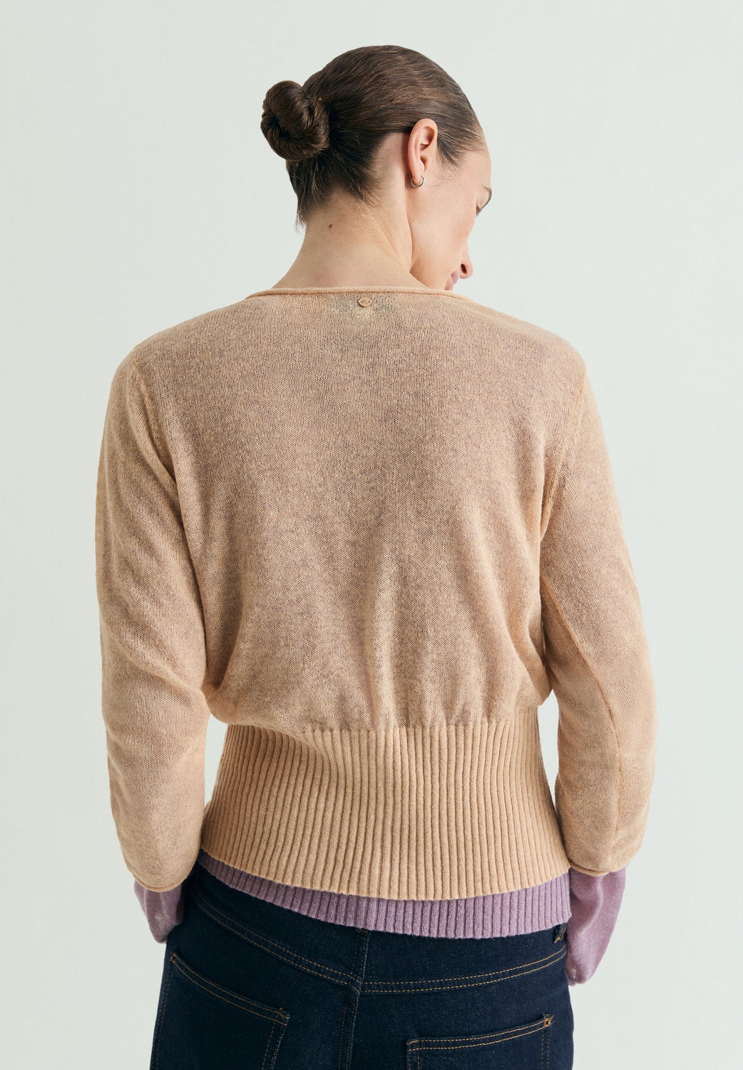 Cárdigan confeccionado en mezcla de lana. Detalle de lazada en el cuello. Manga larga. Cinturilla ceñida en canalé. Cierre mediante botones frontales.
