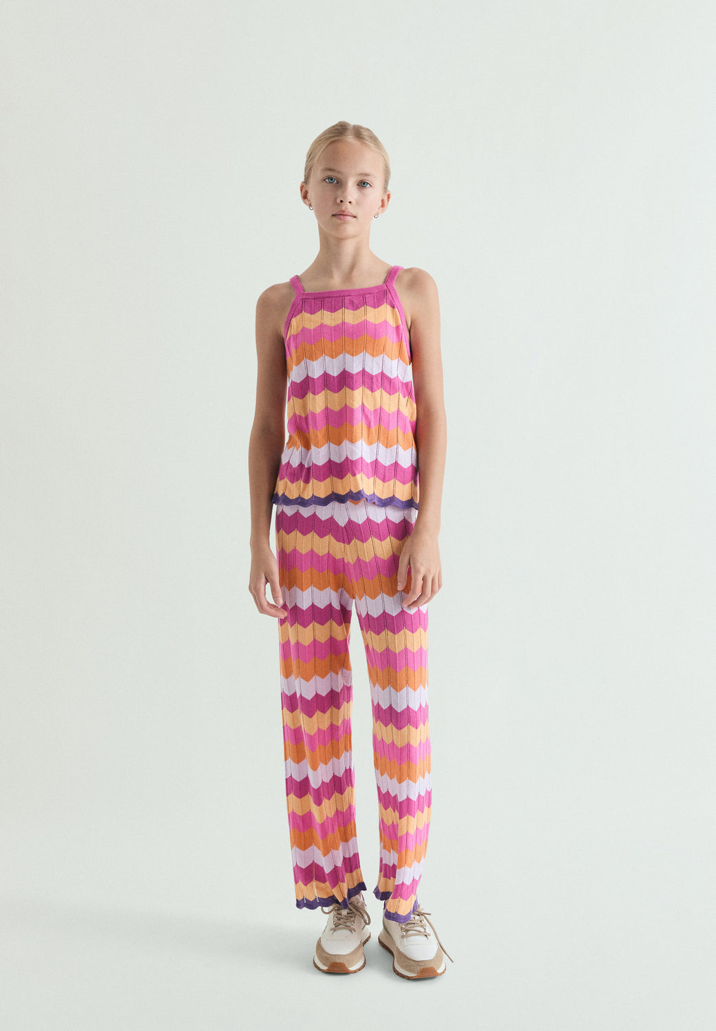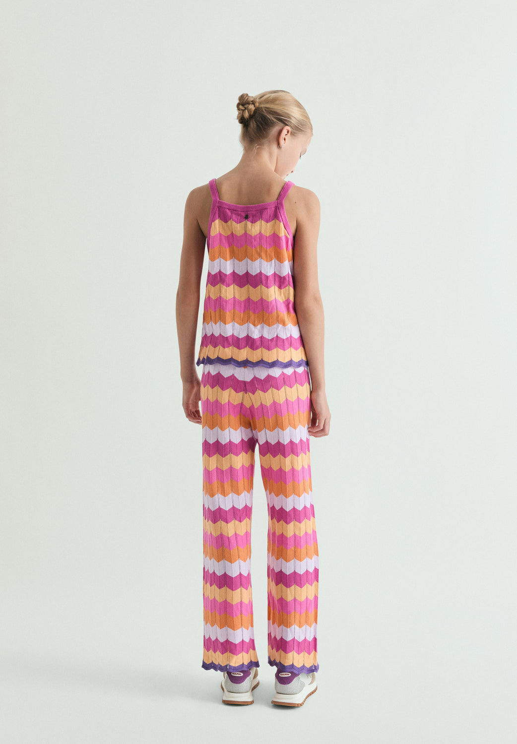 Pantalón confeccionado en punto calado. Wide leg. Cinturilla elástica. Tejido multicolor en zigzag.