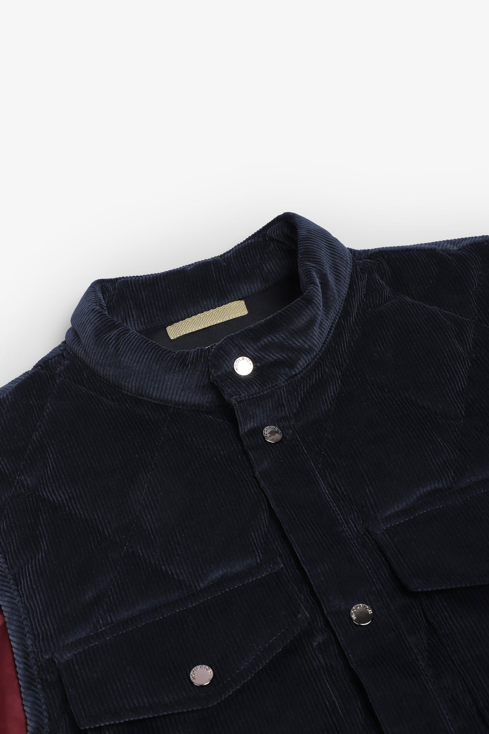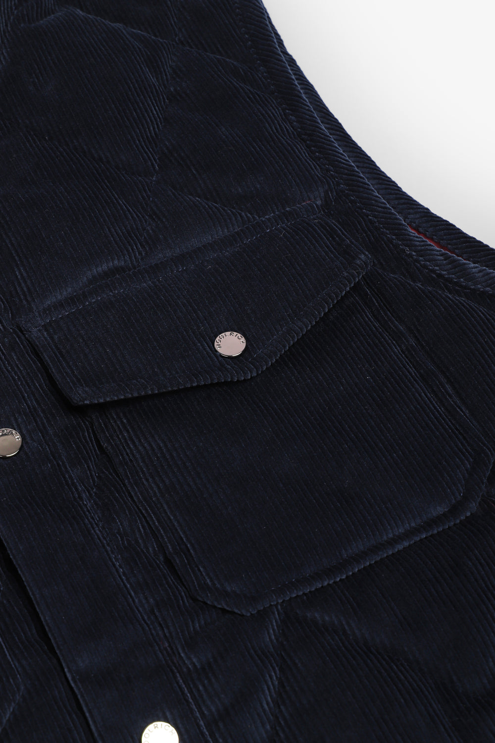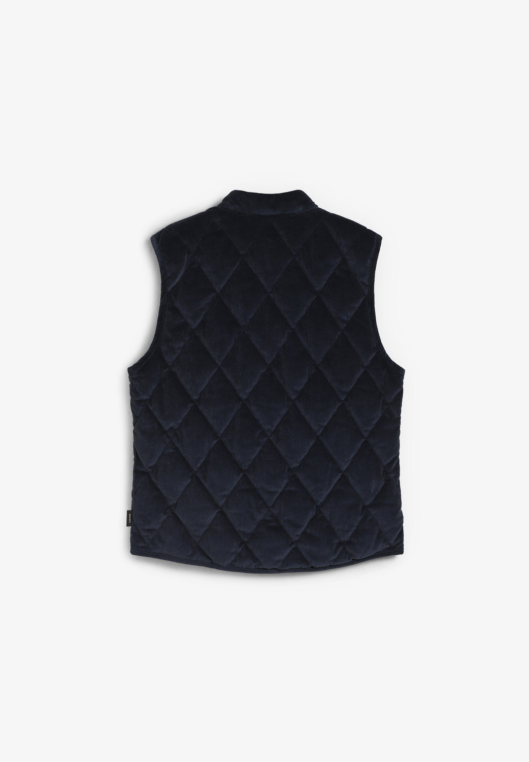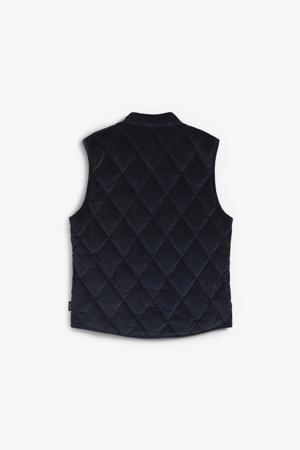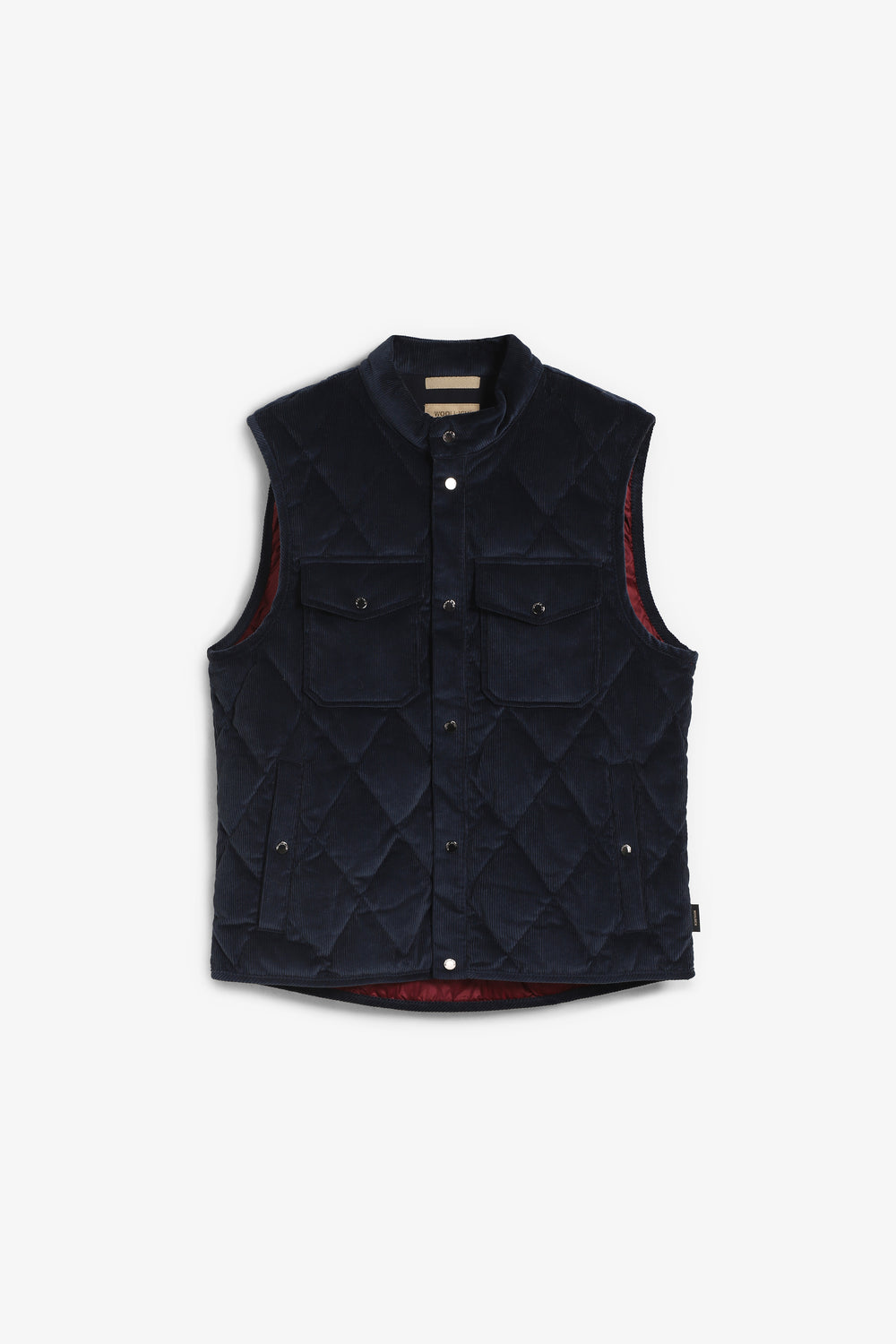 Chaleco Woolrich confeccionado en pana y relleno de plumón de pato 80/20. Cuenta con un forro en contraste, acolchado de rombos, cuello alto, cierre con botones a presión, bolsillos de parche con solapa y botones a presión en el pecho y bolsillos ribeteados con botones a presión. Detalle etiqueta lateral.