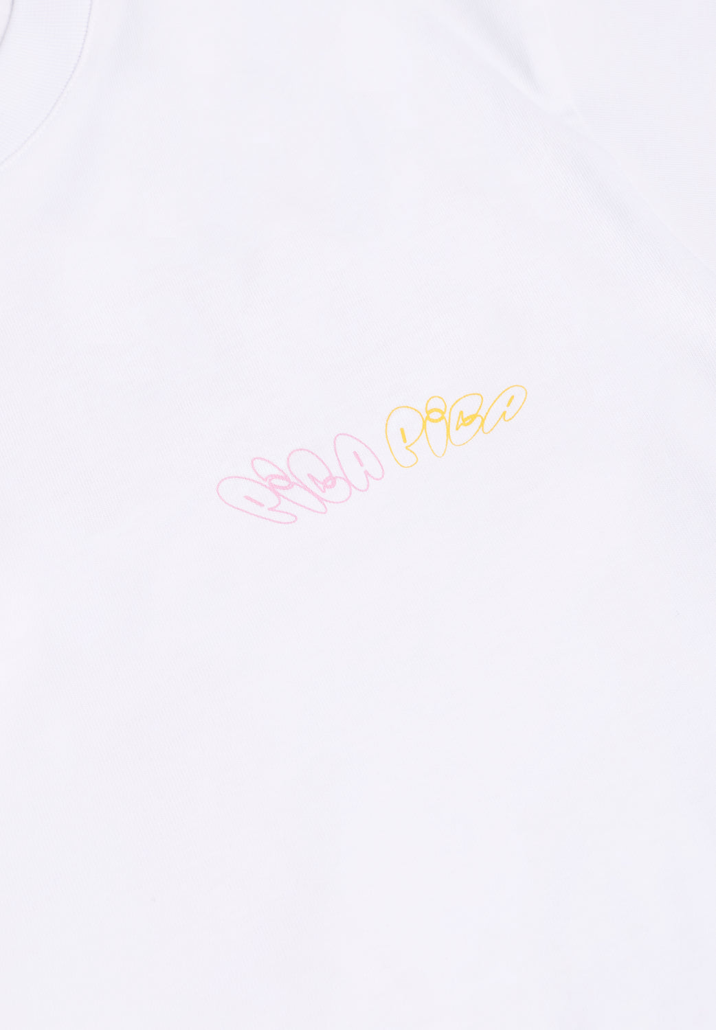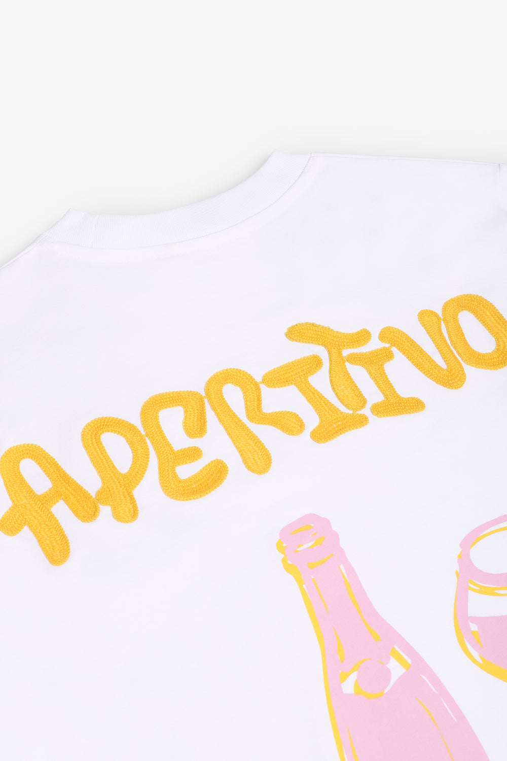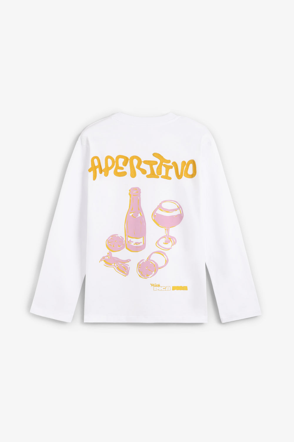 Camiseta Pica Pica confeccionada en 100% algodón. Cuenta con un atrevido estampado en la espalda de clásicos snacks y spritz, celebra el ritual de la celebración. Delicado logotipo frontal y corte regular.