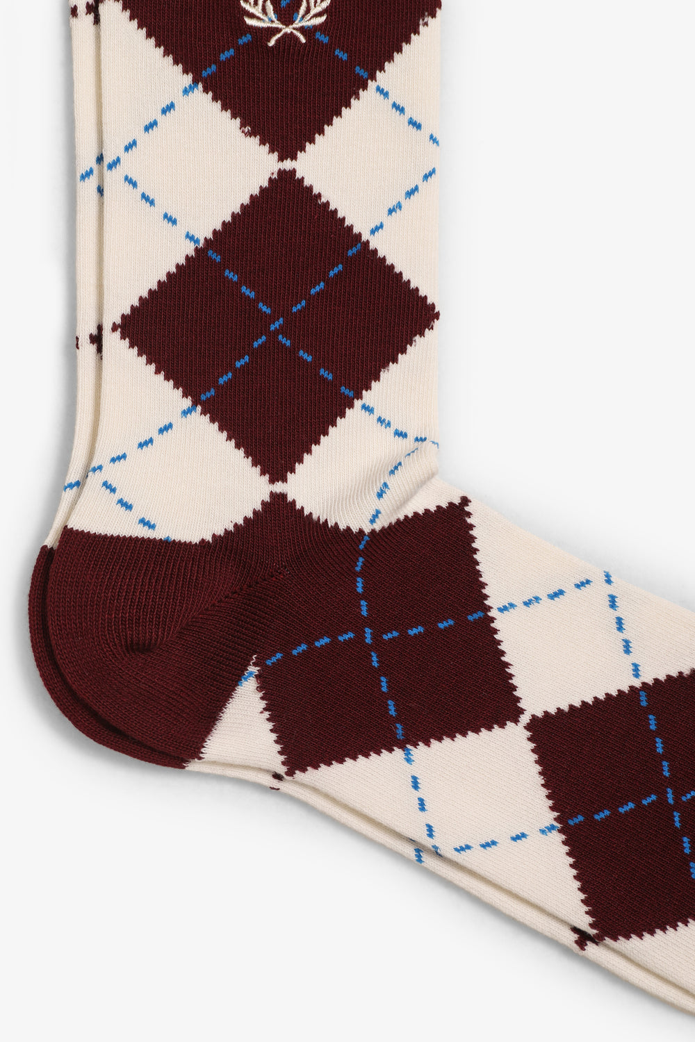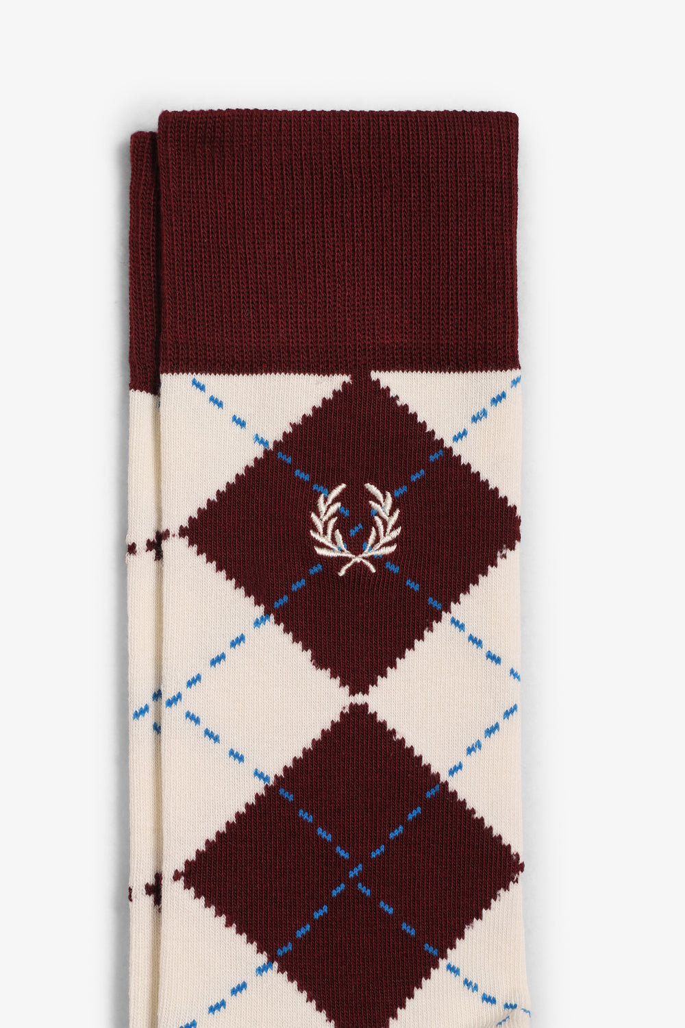 Calcetines Fred Perry confeccionados en mezcla de algodón de primera calidad. Presentan un diseño de rombos Argyle en jacquard adornados con la corona de laurel bordada, caña y puntera con bloques de color.