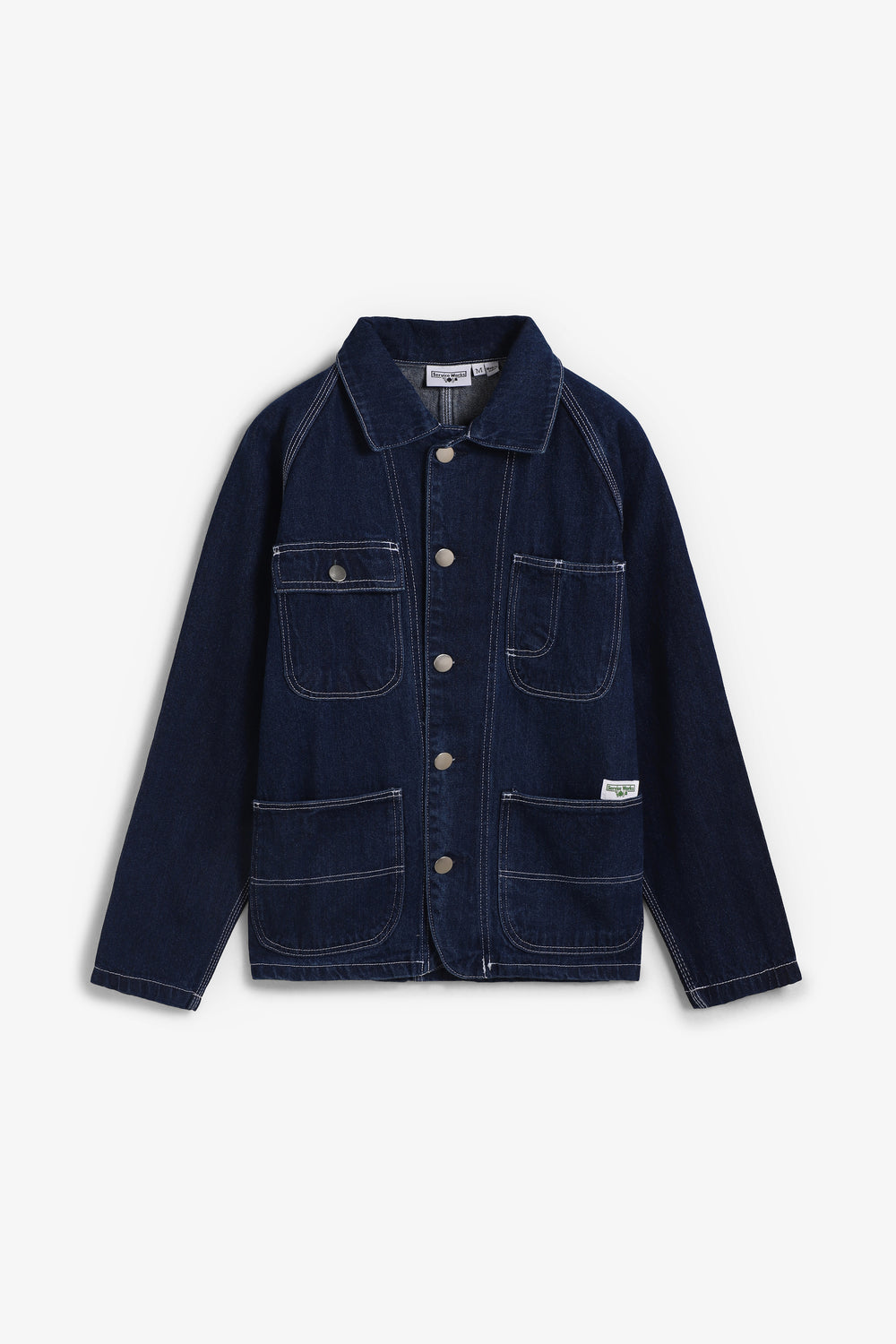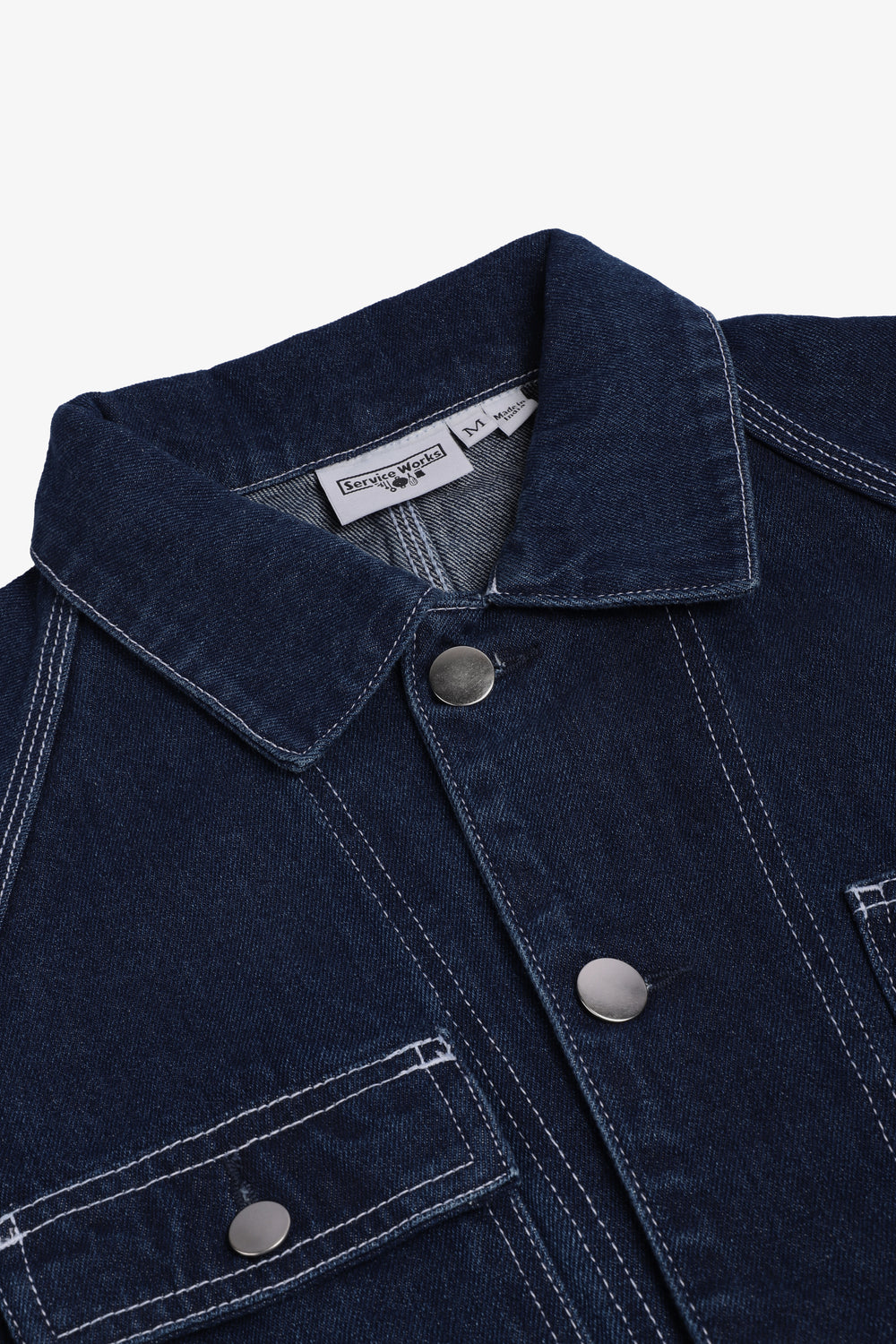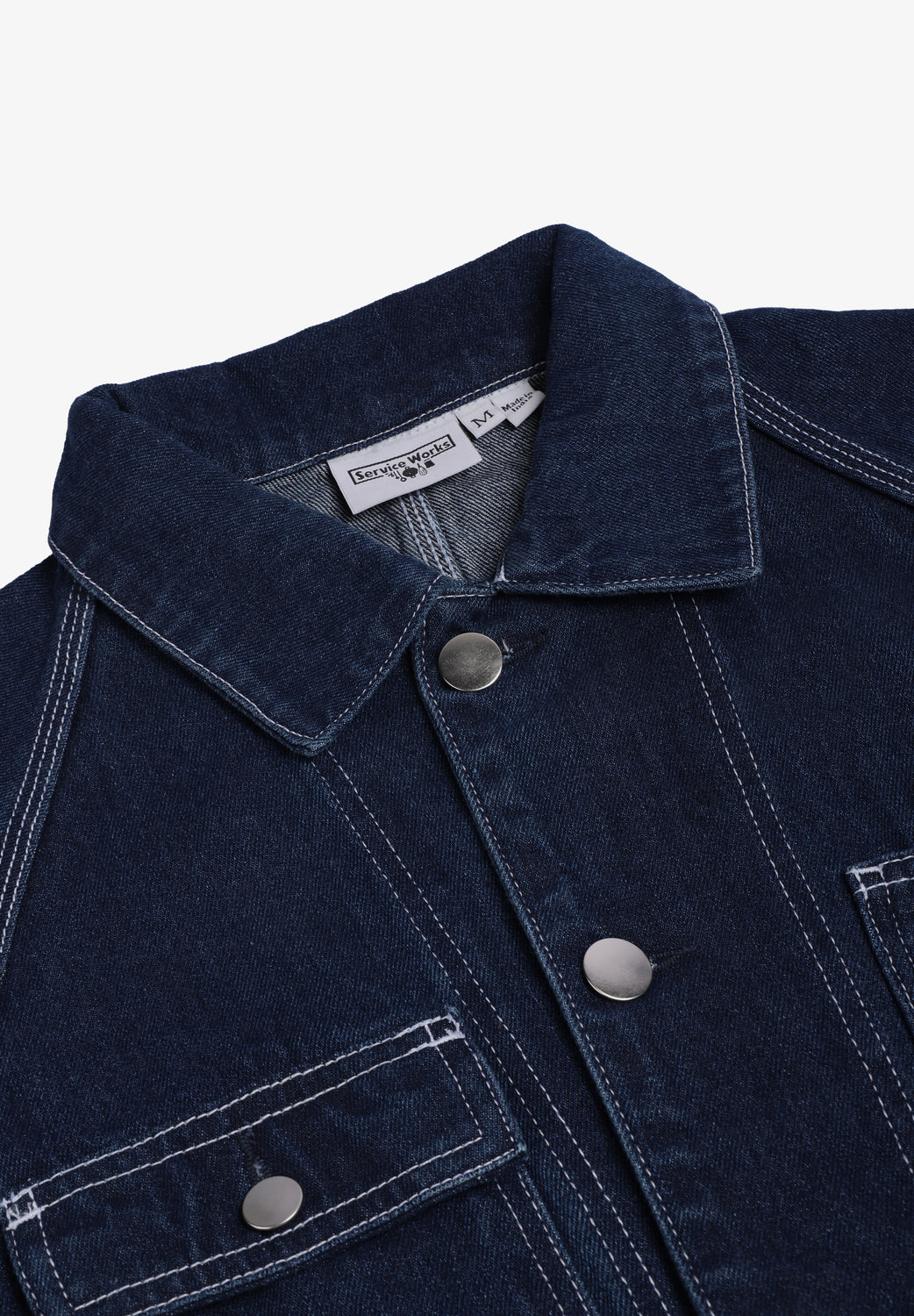Chaqueta vaquera Service Works confeccionada en mezcla de algodón orgánico GOTS y un ajuste regular. Presenta costuras triples en contraste, mangas raglán, construcción de cuatros bolsillos y cierre con botones. Detalle etiqueta tejida.