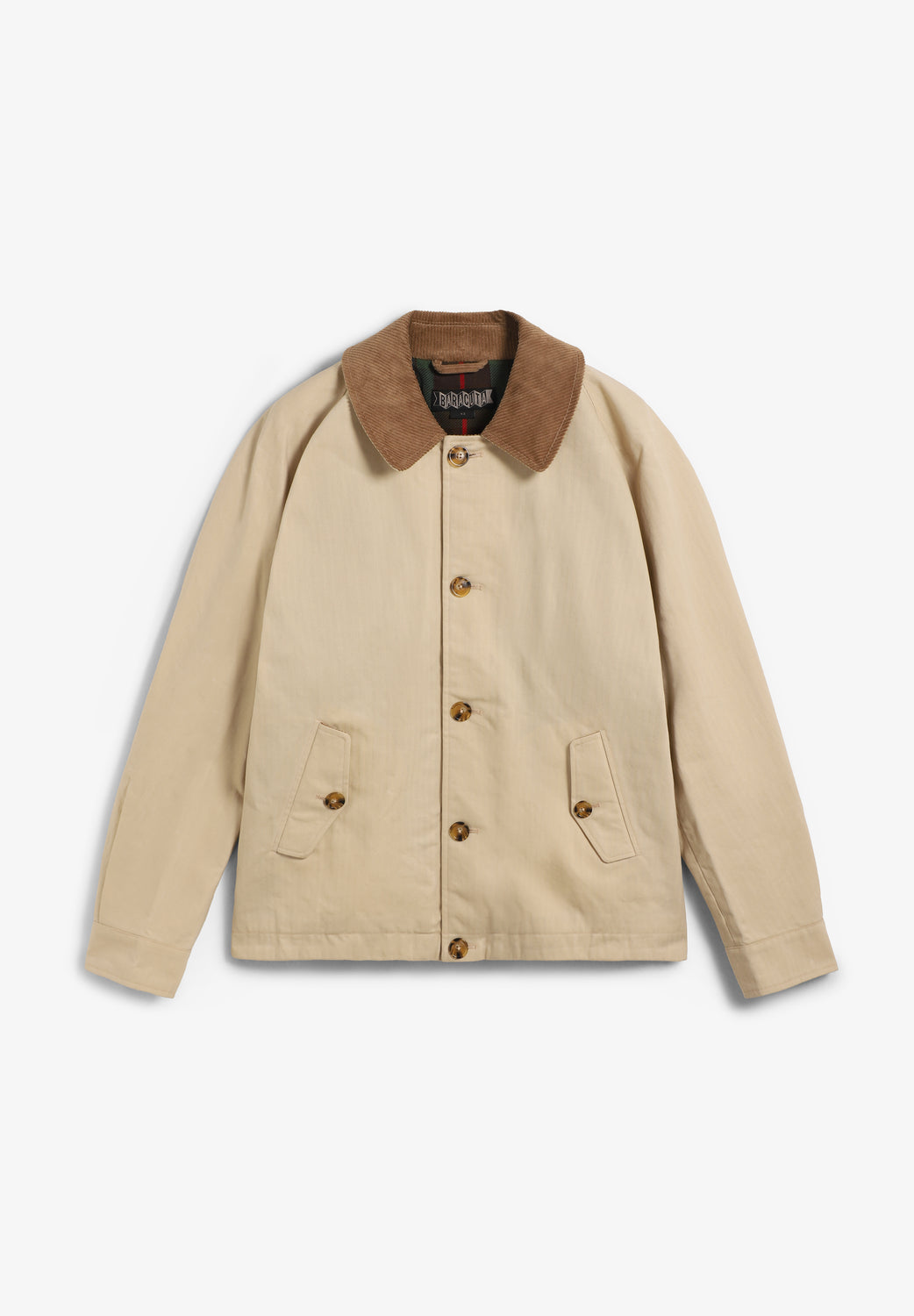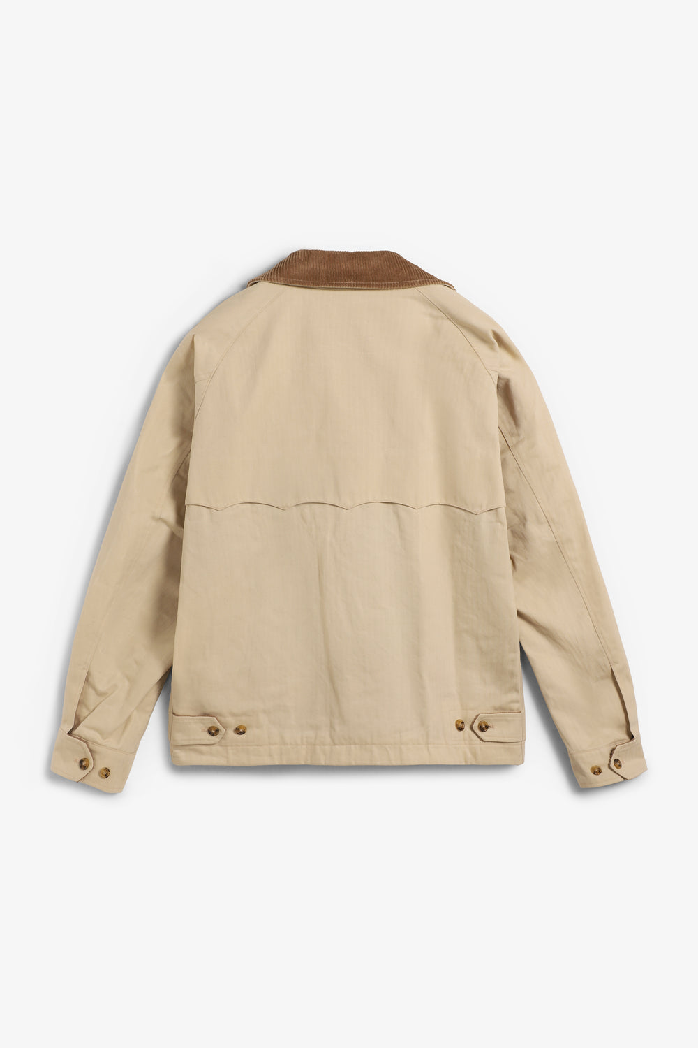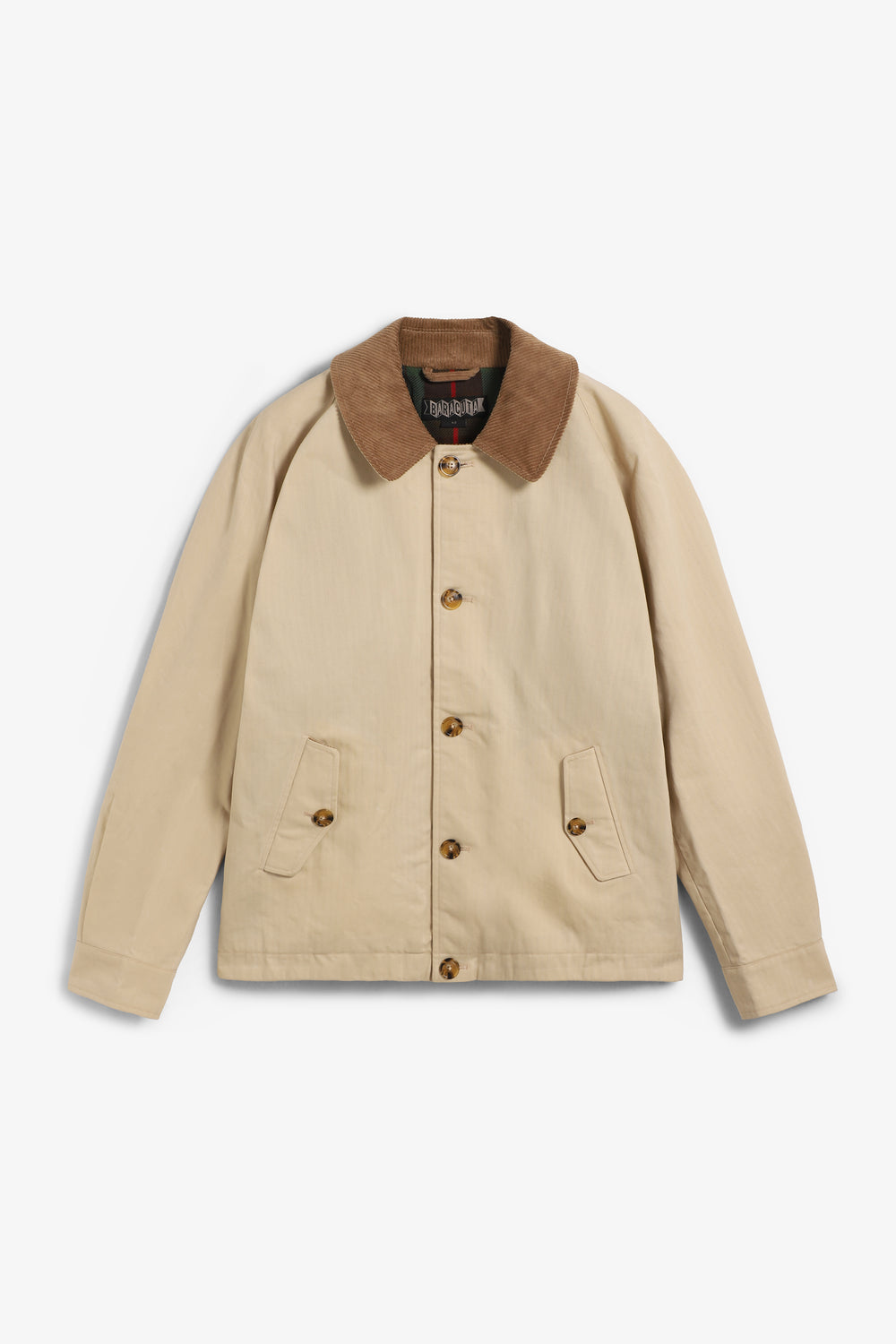 Chaqueta Baracuta confeccionada en 100% algodón y corte holgado. Presenta un acabado encerado que aporta un brillo sutil, detalles funcionales como los bolsillos y los puños ajustables y líneas limpias.