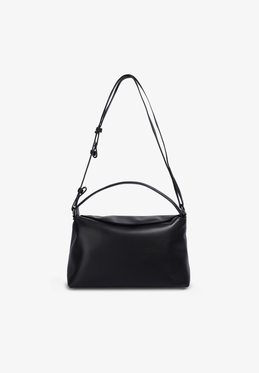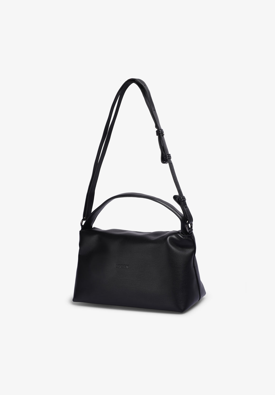 Bolso Hvisk confeccionado en mezcla de materiales: 40% poliéster reciclado, 37% poliuretano, 18% poliuretano reciclado y 5% de otros materiales convencionales. Cuenta con un amplio compartimento y un pequeño bolsillo interior con cremallera, solapa corta con dos botones magnéticos y correa ajustable.