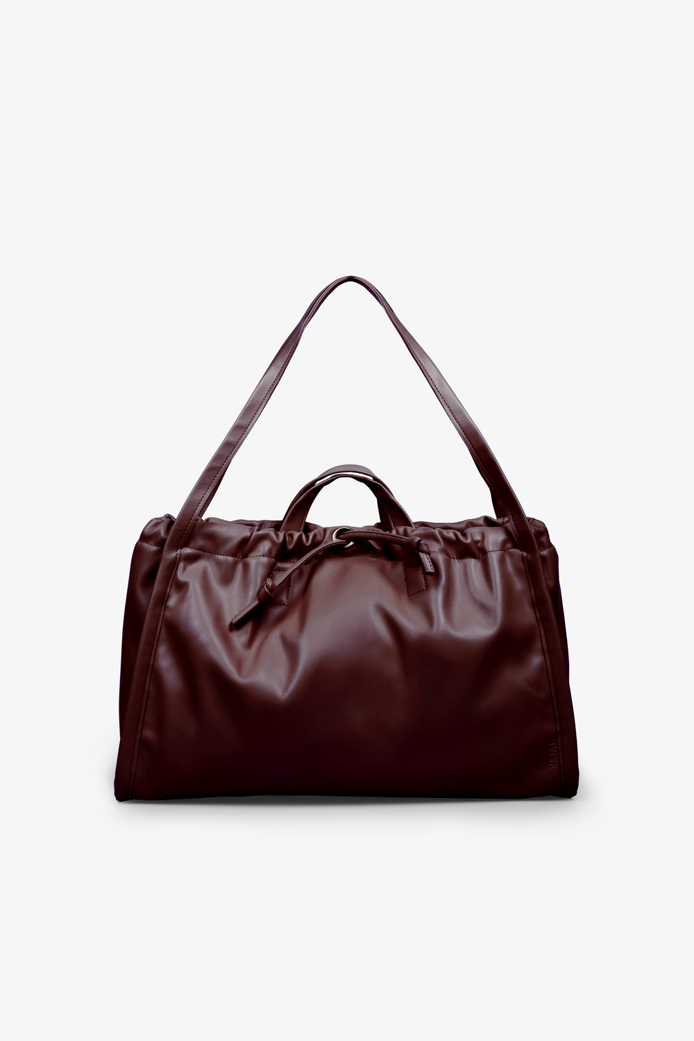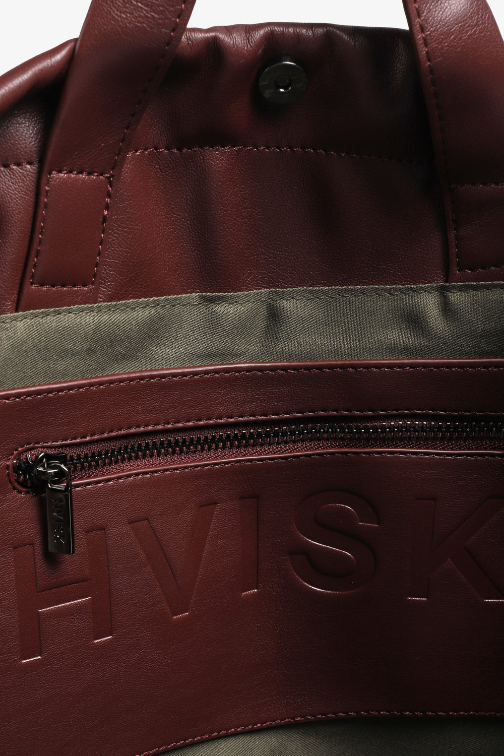 Bolso Hvisk confeccionado en mezcla de materiales: 40% poliéster reciclado, 18% poliuretano reciclado, 18% poliuretano, 14% carbonato de calcio, 10% madera. Cuenta con asas cortas y largas, un compartimento principal, bolsillo interior con cremallera y cierre de cordón y cierre magnético.