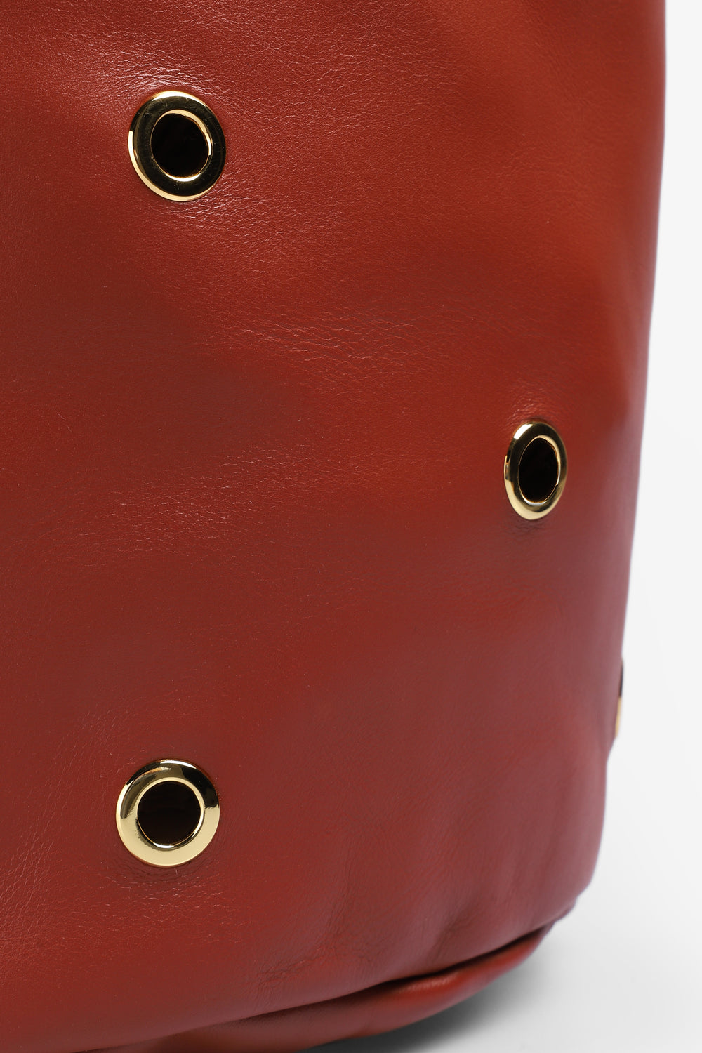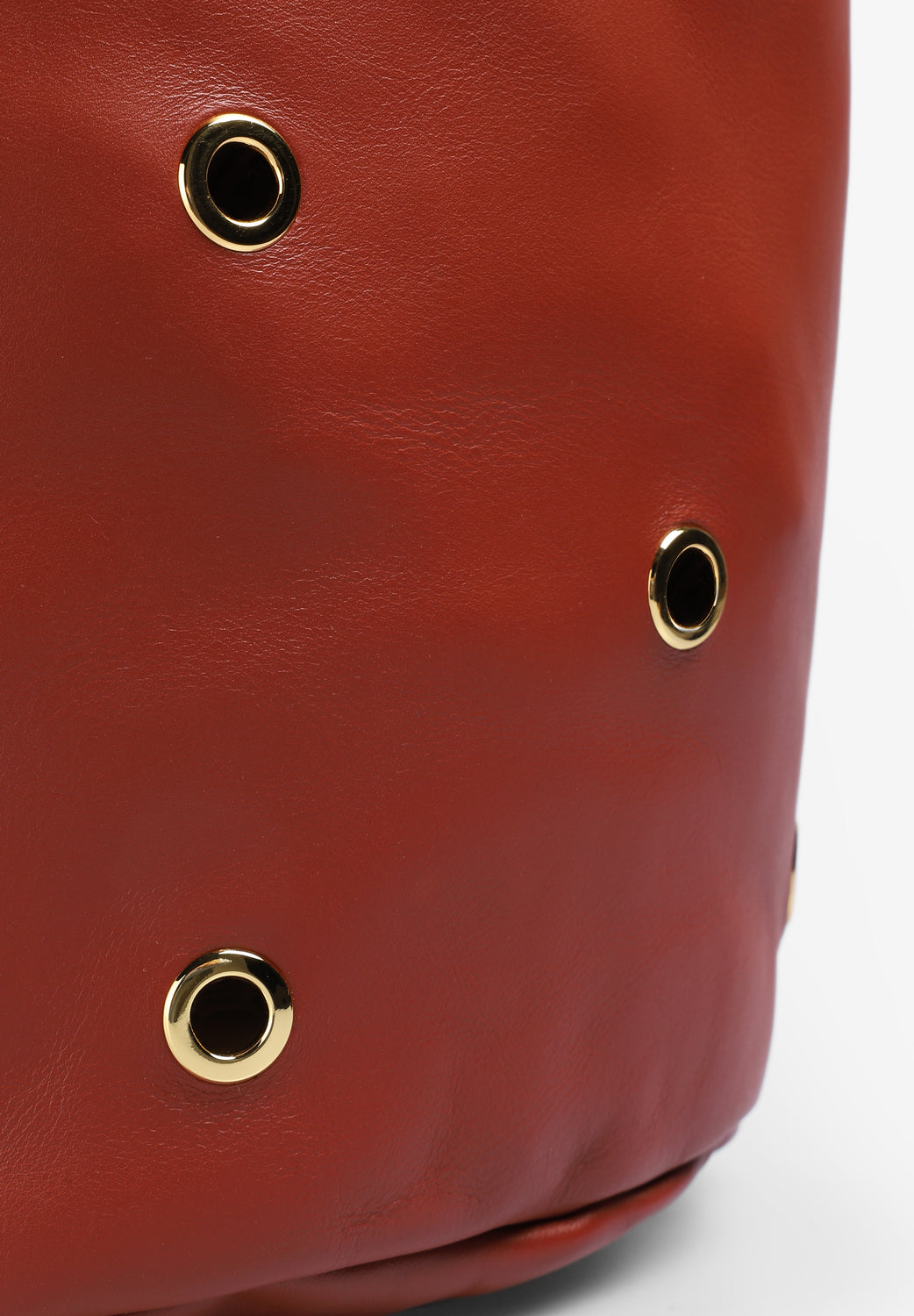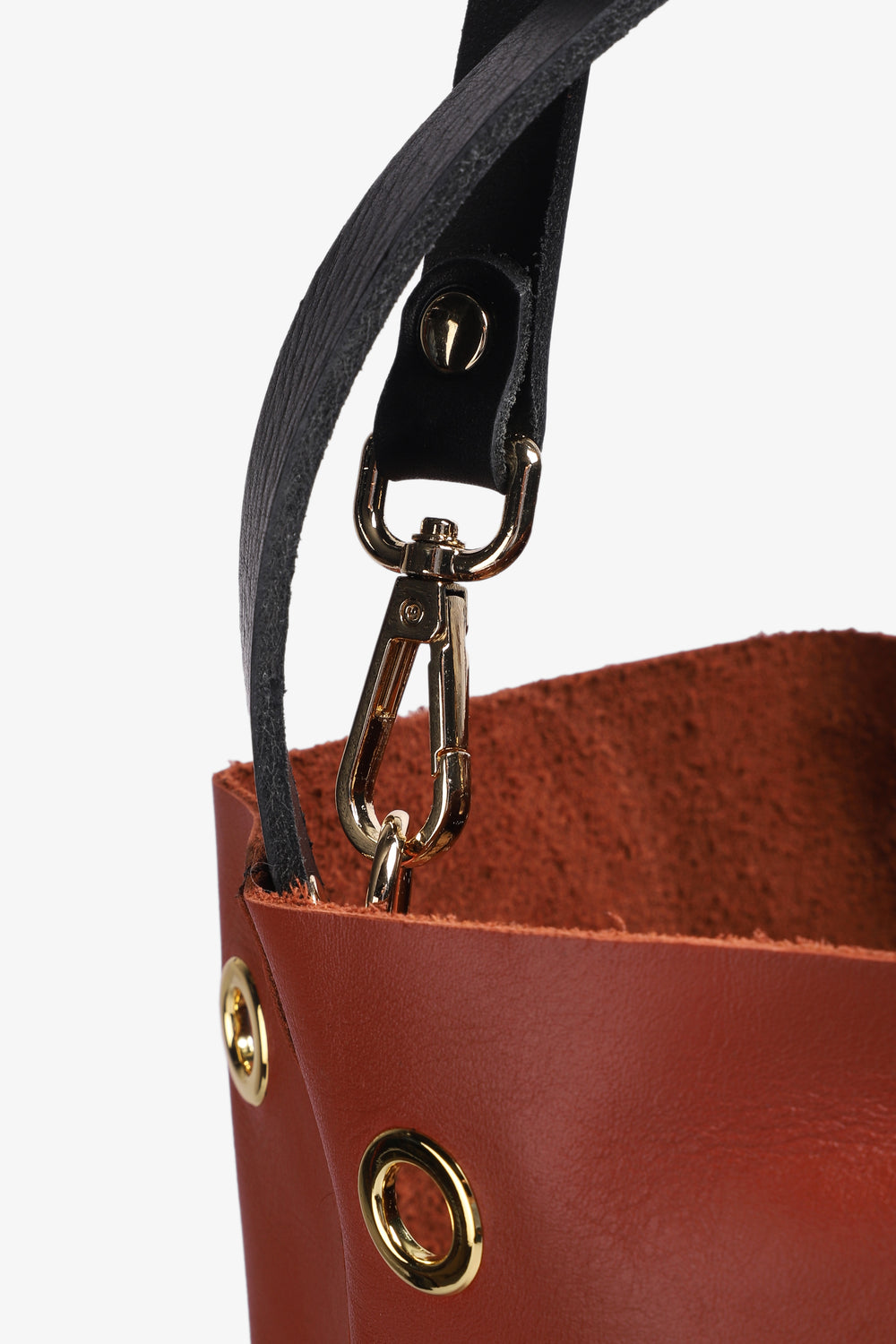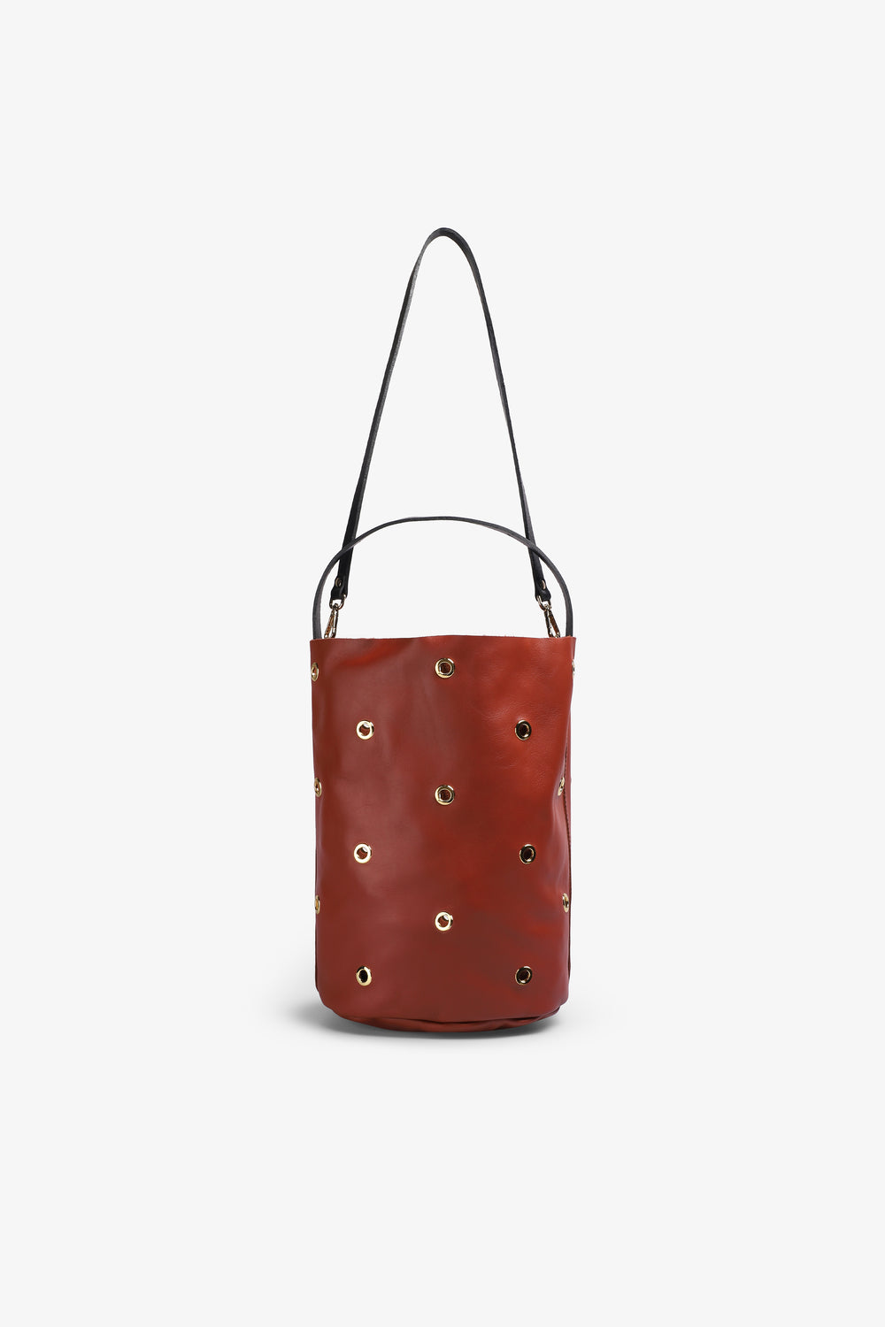 Bolso Mercules confeccionado en 100% piel y forma de cubo con ojales dorados por ambas caras. Cuenta con dos asas, una fija (38cm) para llevar al hombro y una más larga (80cm) desmontable para poder llevarlo cruzado o colgado. Sin forro interior.