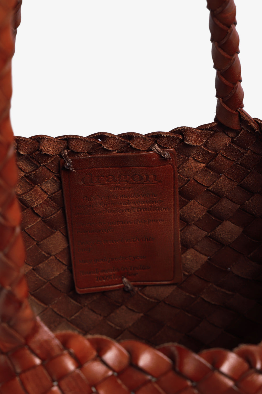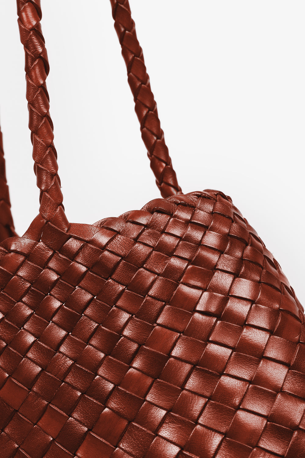 Bolso Dragon Diffusion tejido a mano en piel de becerro de búfalo. Está compuesto por tiras irregulares que se estrechan hacia el borde, creando una forma práctica y elegante. Fiel a las técnicas tradicionales de cestería, no tiene forro y tiene la parte superior abierta.
