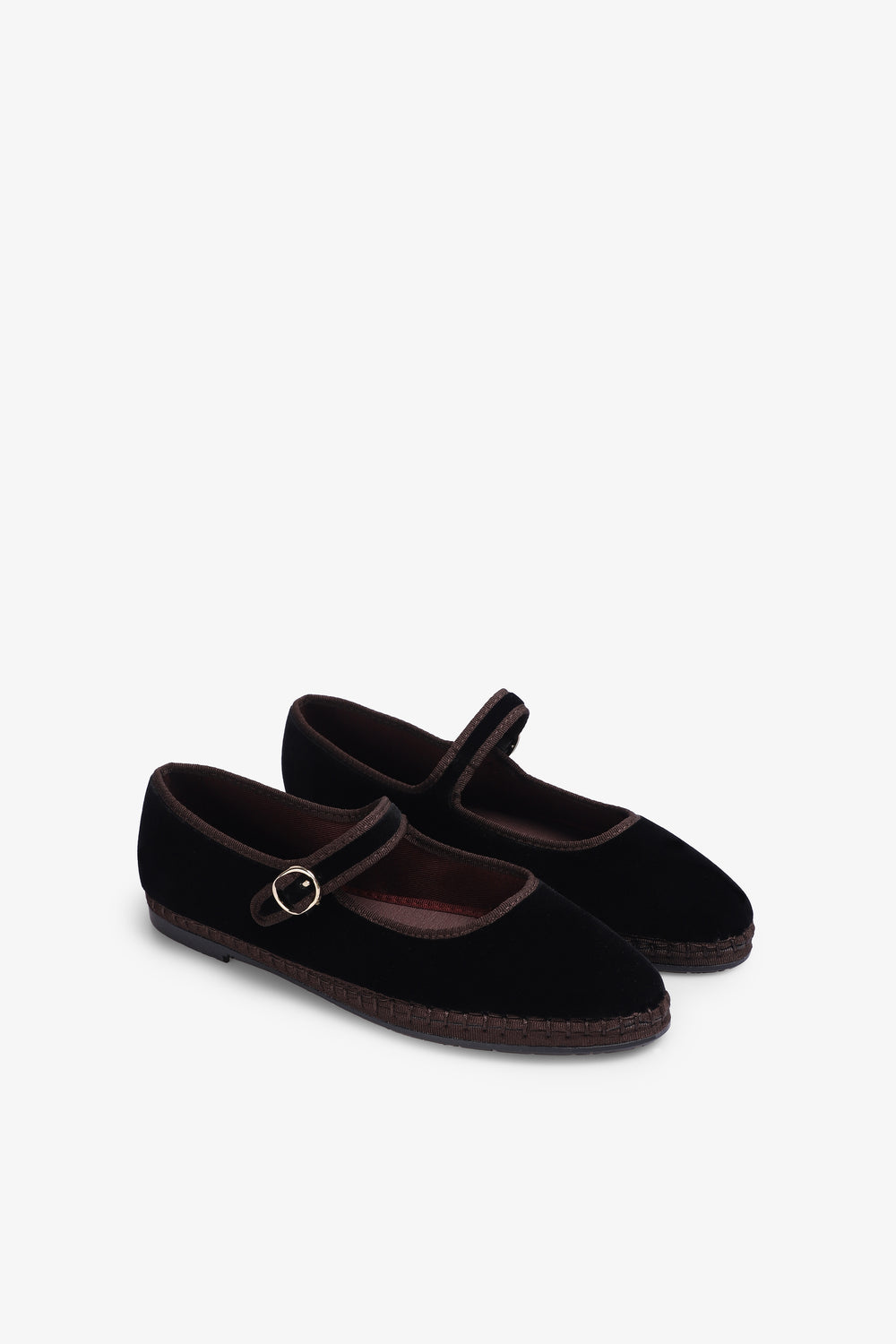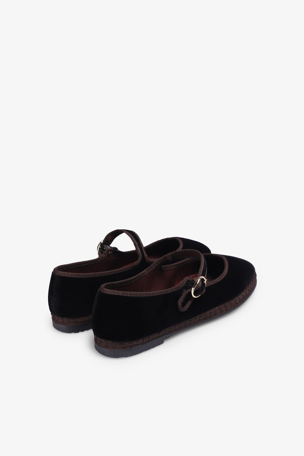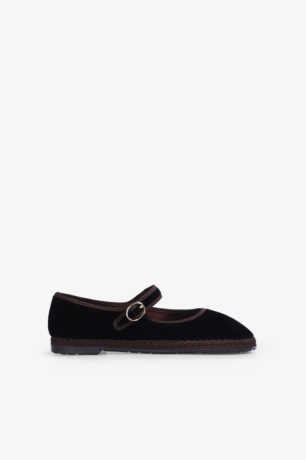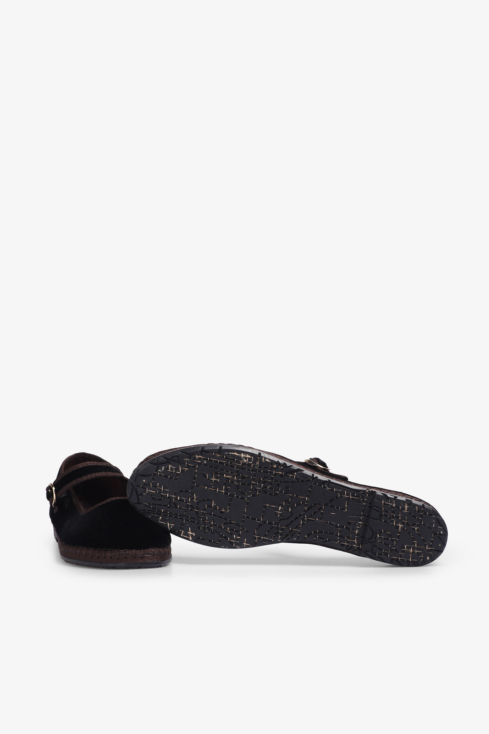 Slippers Flabelus de terciopelo en color negro con ribetes marrones y cierre de hebilla. El interior del zapato es 100% algodón orgánico con tratamiento antibacteriano y la suela está hecha de caucho reciclado.
