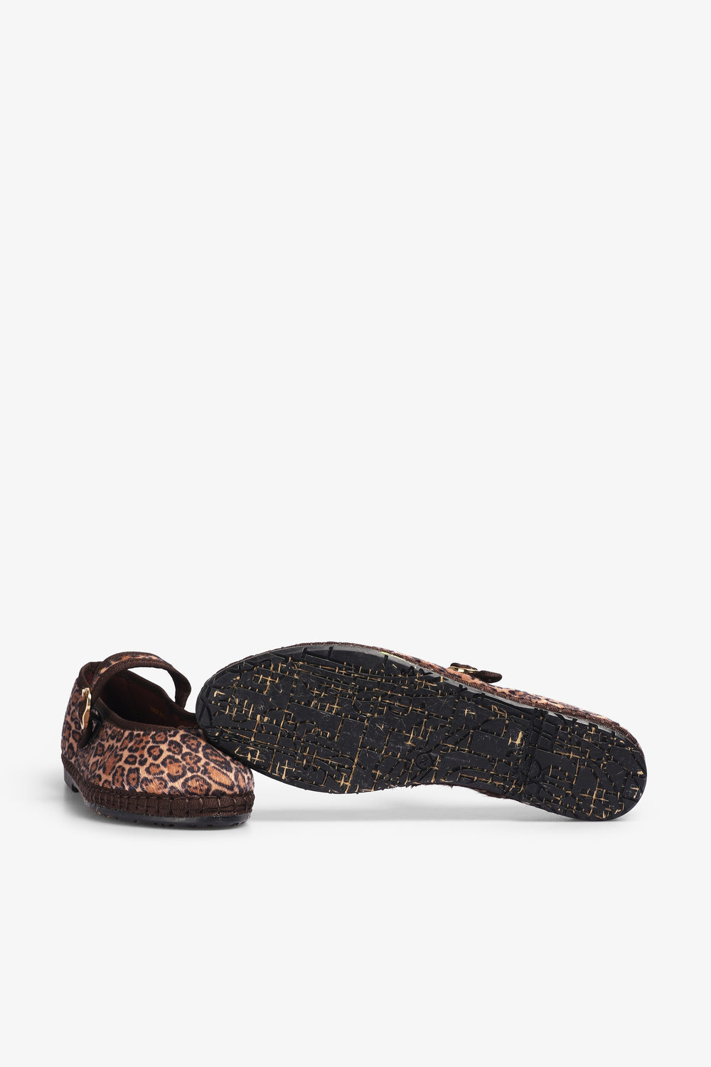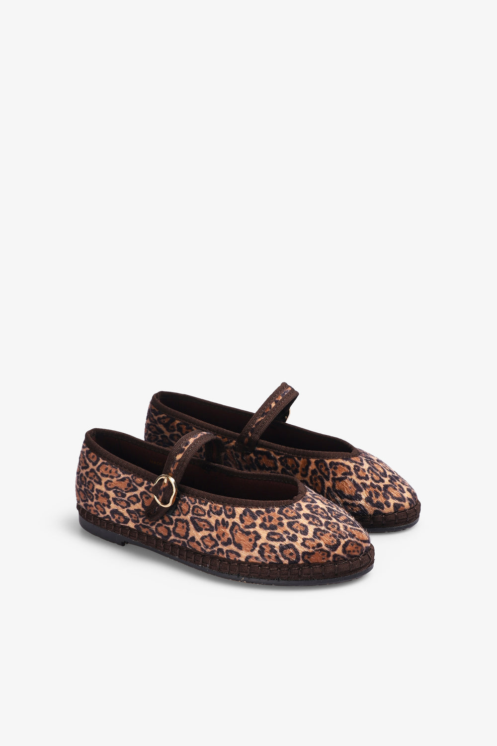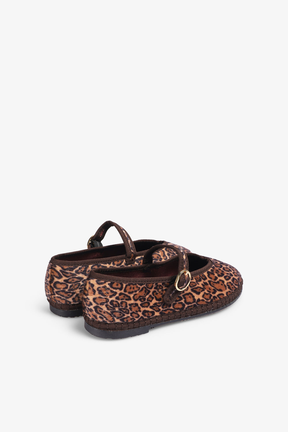 Slippers Flabelus de terciopelo con corte en V en estampado de leopardo con ribete marrón, tira estampada de leopardo y cierre de hebilla. El interior del zapato es 100% algodón orgánico con tratamiento antibacteriano y la suela está hecha de caucho reciclado.