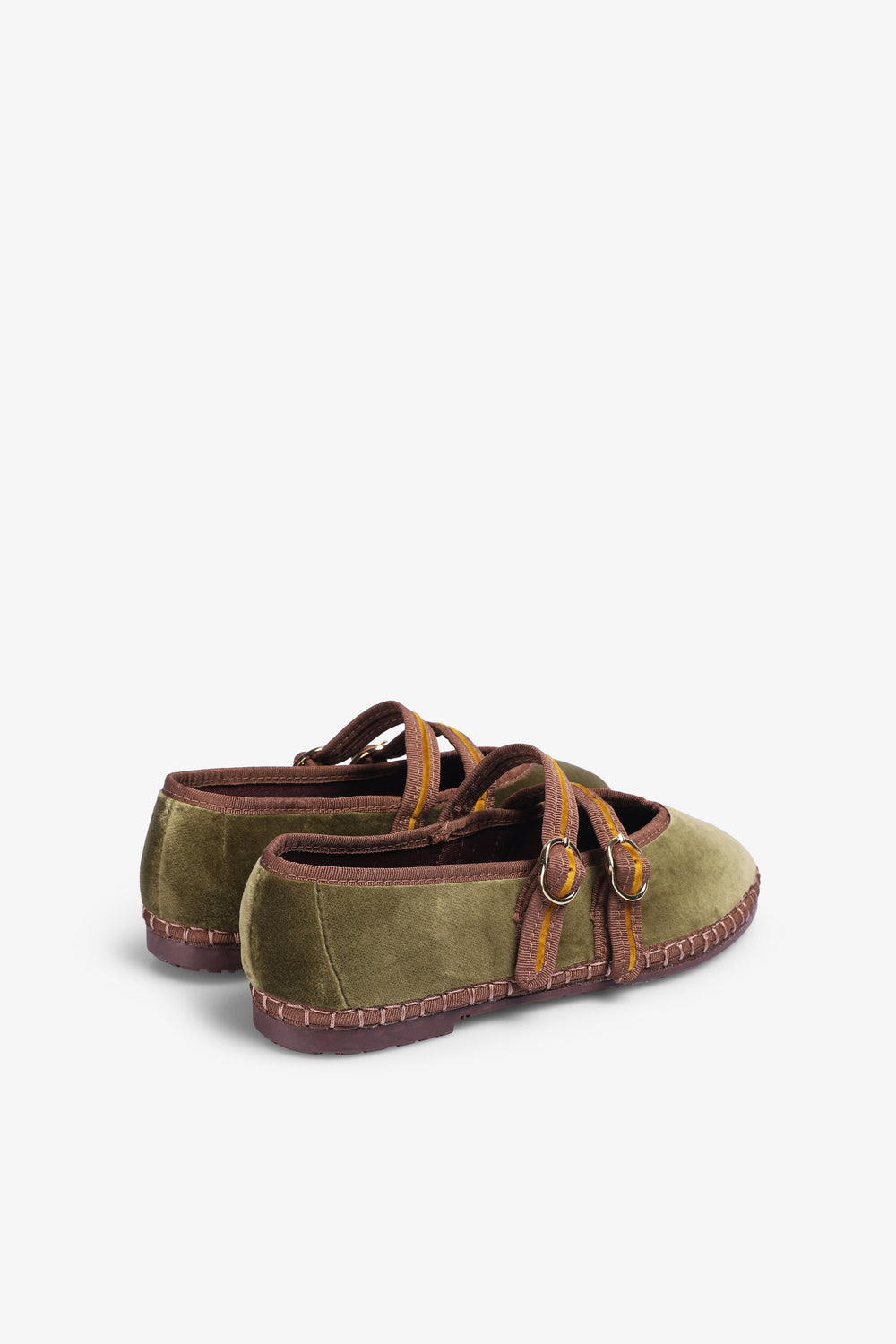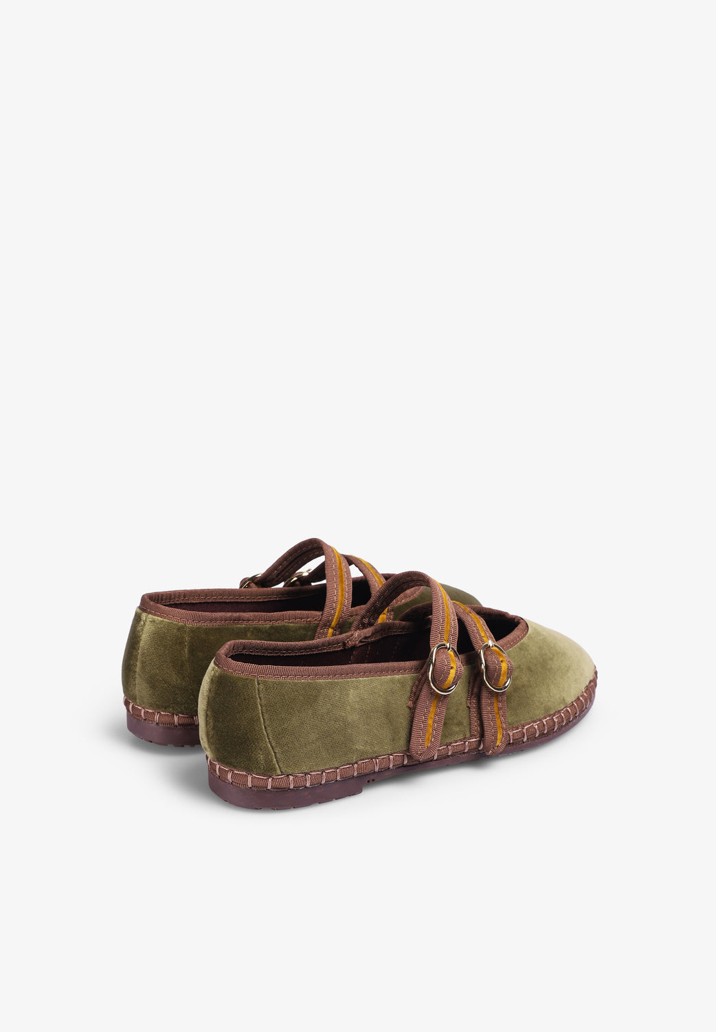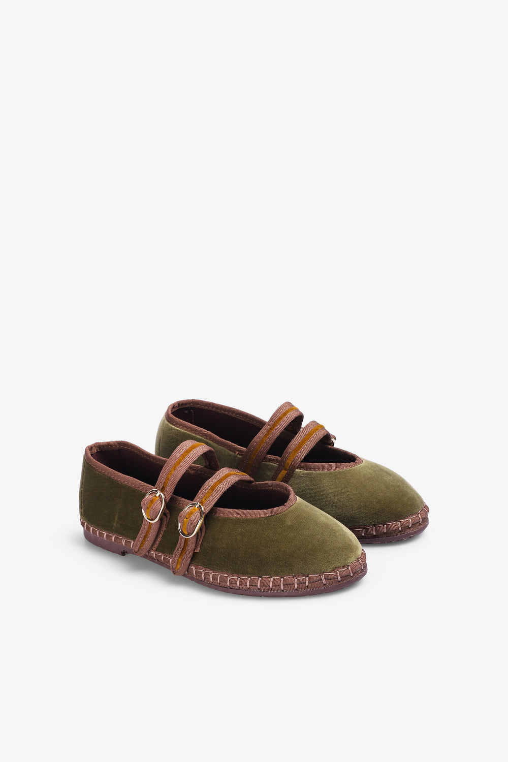 Slippers Flabelus de terciopelo en mostaza con ribete beige oscuro y doble tira de terciopelo marrón con cierre de hebilla. El interior del zapato es 100% algodón orgánico con tratamiento antibacteriano y la suela está hecha de caucho reciclado.