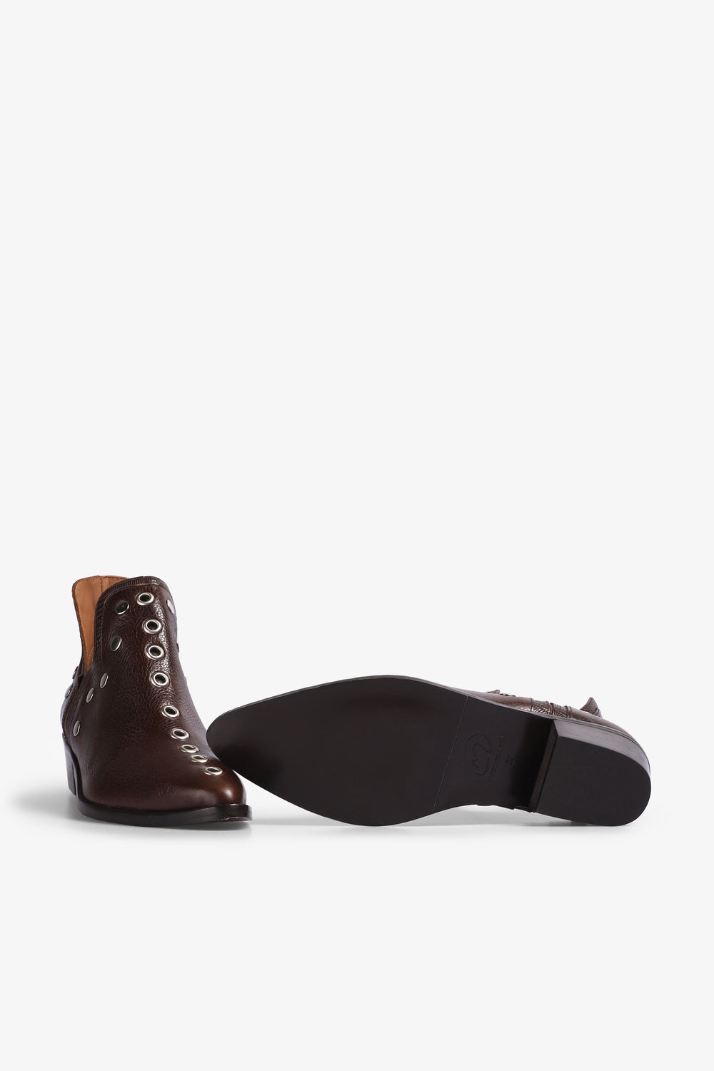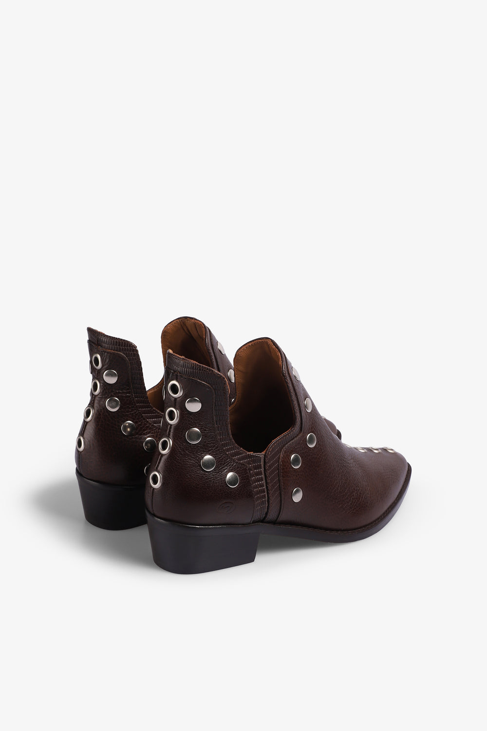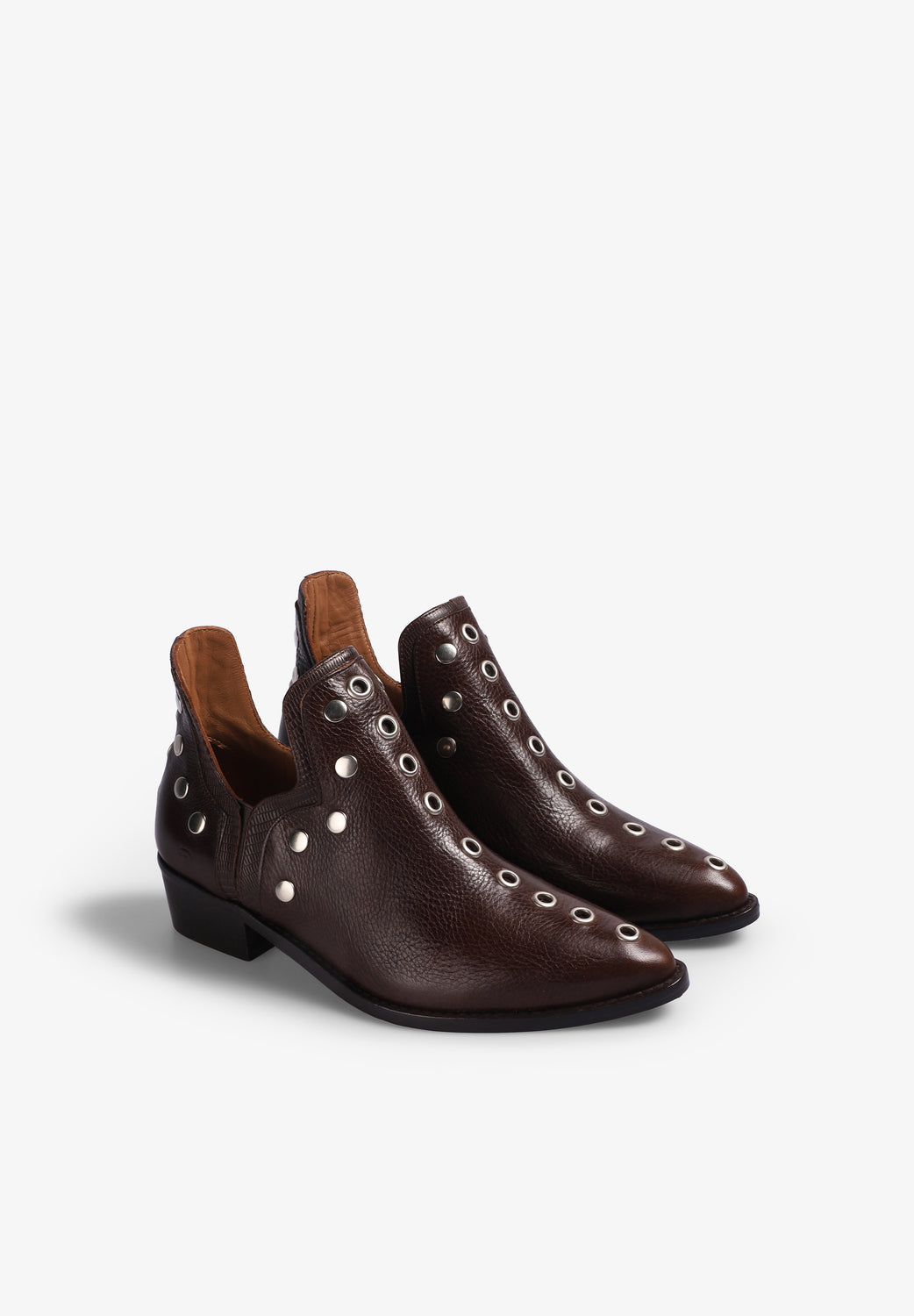 Botas Micuir confeccionadas en piel vacuno chocolate. Silueta abierta en el tobillo rematada con ribete de piel grabada a tono. Detalles de tachas metálicas hipoalérgicas en tono plata, un tacón de 4 cm de altura con plantilla de microgel  para un mayor confort. Forro y plantilla de piel mestizo de cabra a tono y planta con certificado ''handmade in Spain'' con logo grabado a fuego. Incluye una bolsa de algodón.