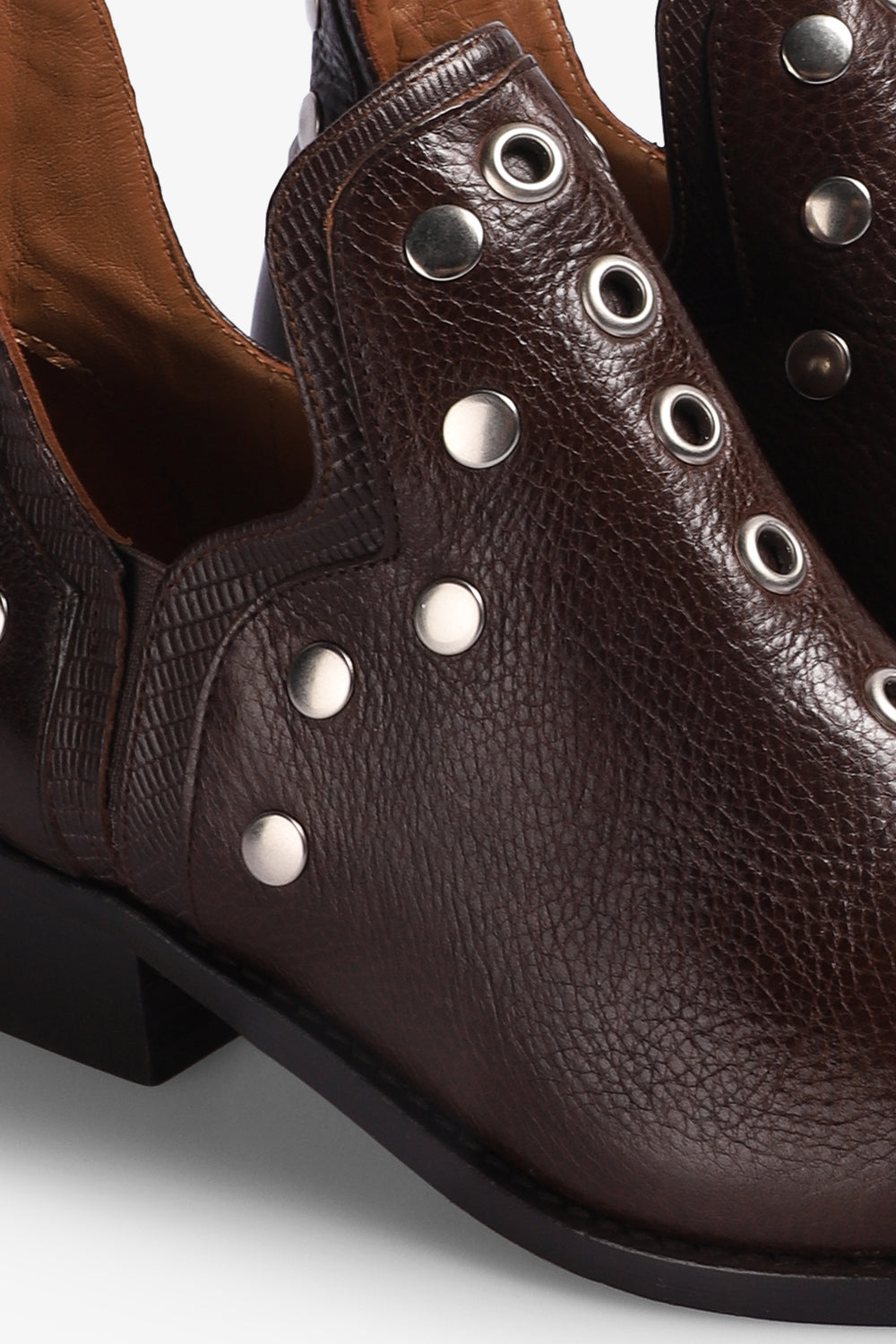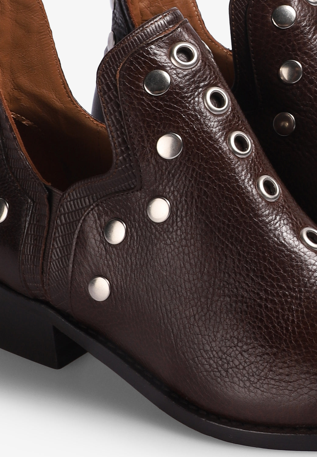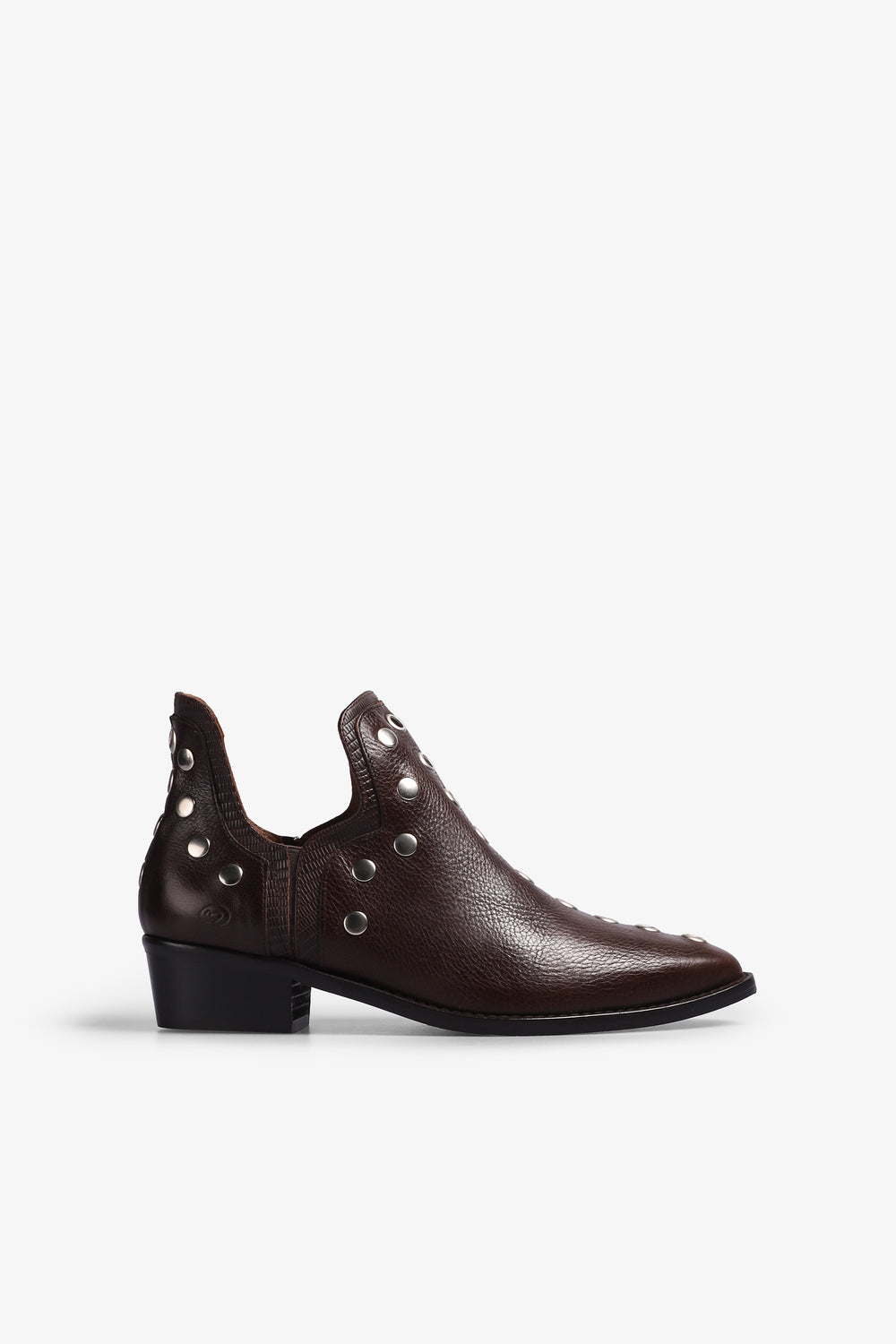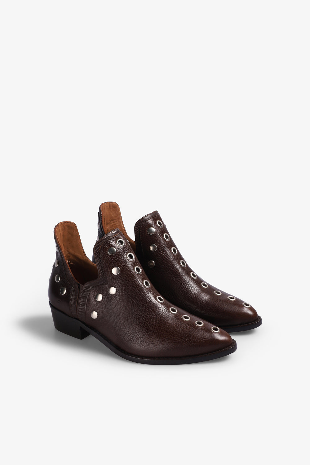 Botas Micuir confeccionadas en piel vacuno chocolate. Silueta abierta en el tobillo rematada con ribete de piel grabada a tono. Detalles de tachas metálicas hipoalérgicas en tono plata, un tacón de 4 cm de altura con plantilla de microgel  para un mayor confort. Forro y plantilla de piel mestizo de cabra a tono y planta con certificado ''handmade in Spain'' con logo grabado a fuego. Incluye una bolsa de algodón.