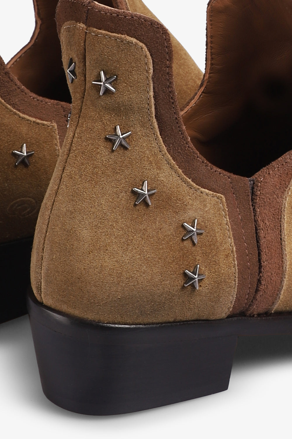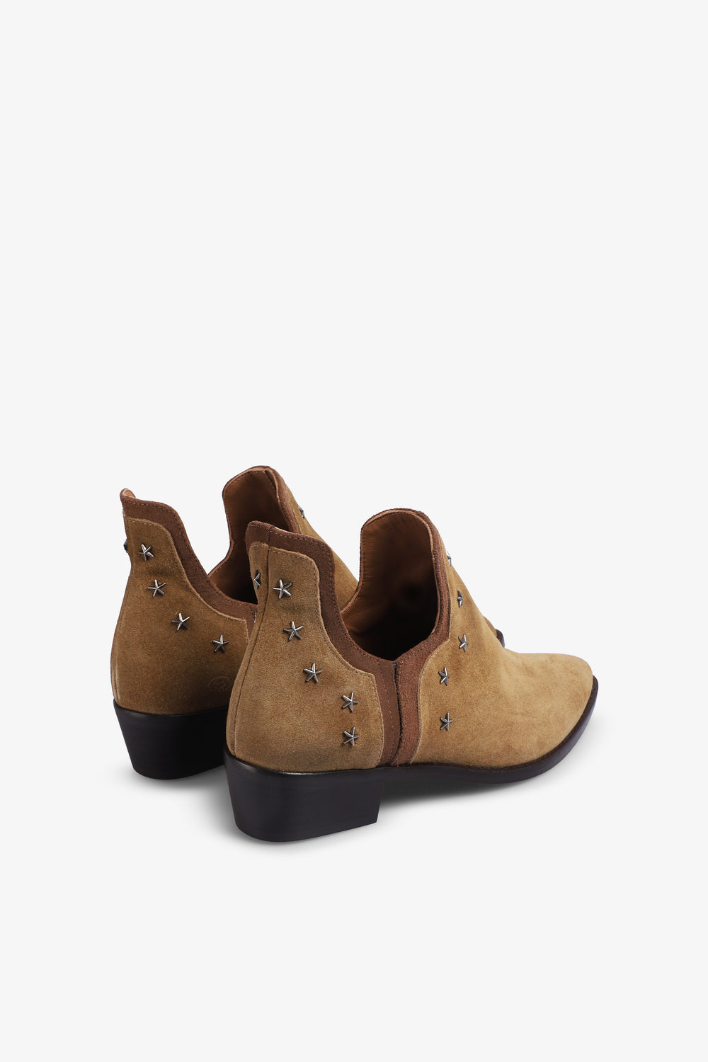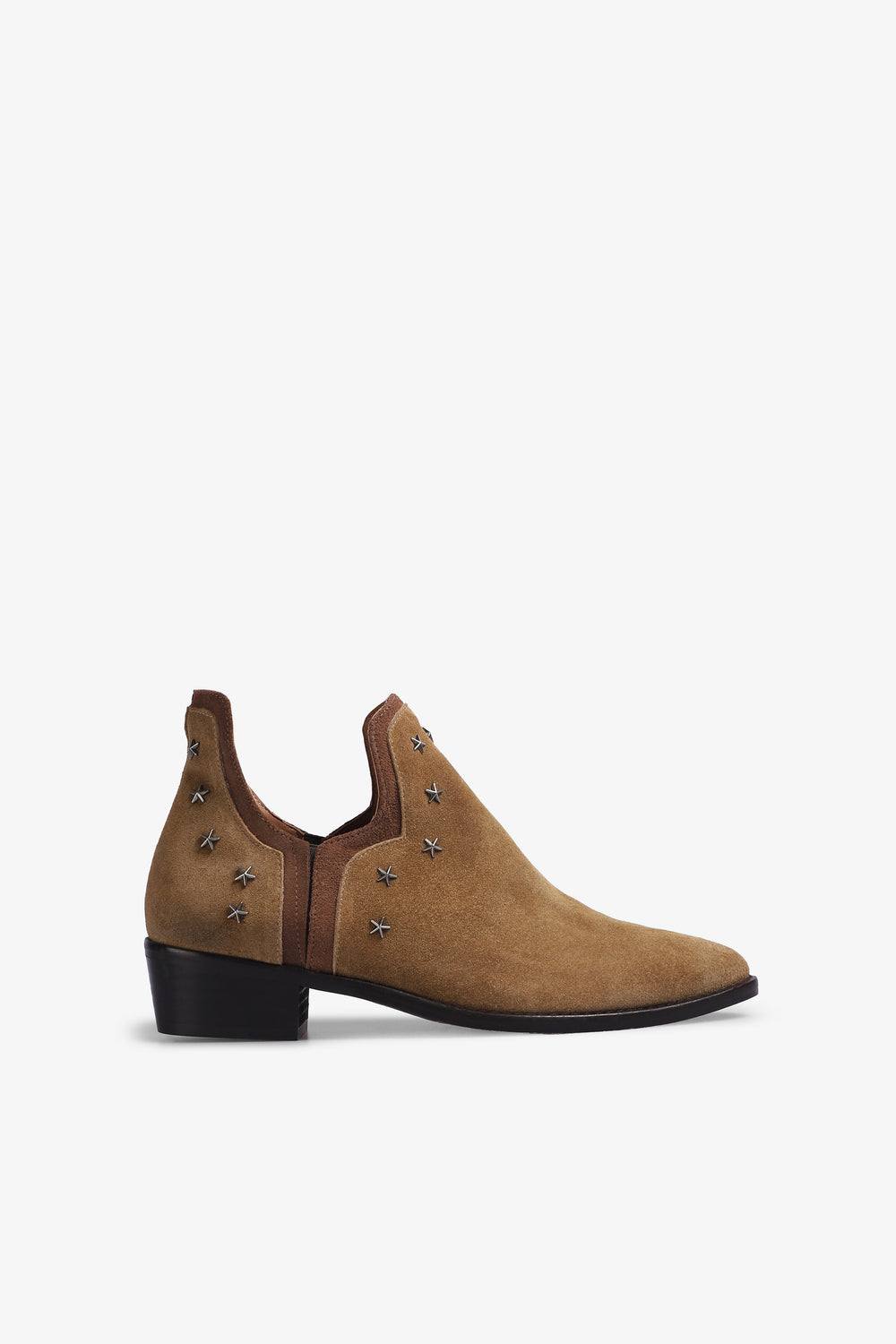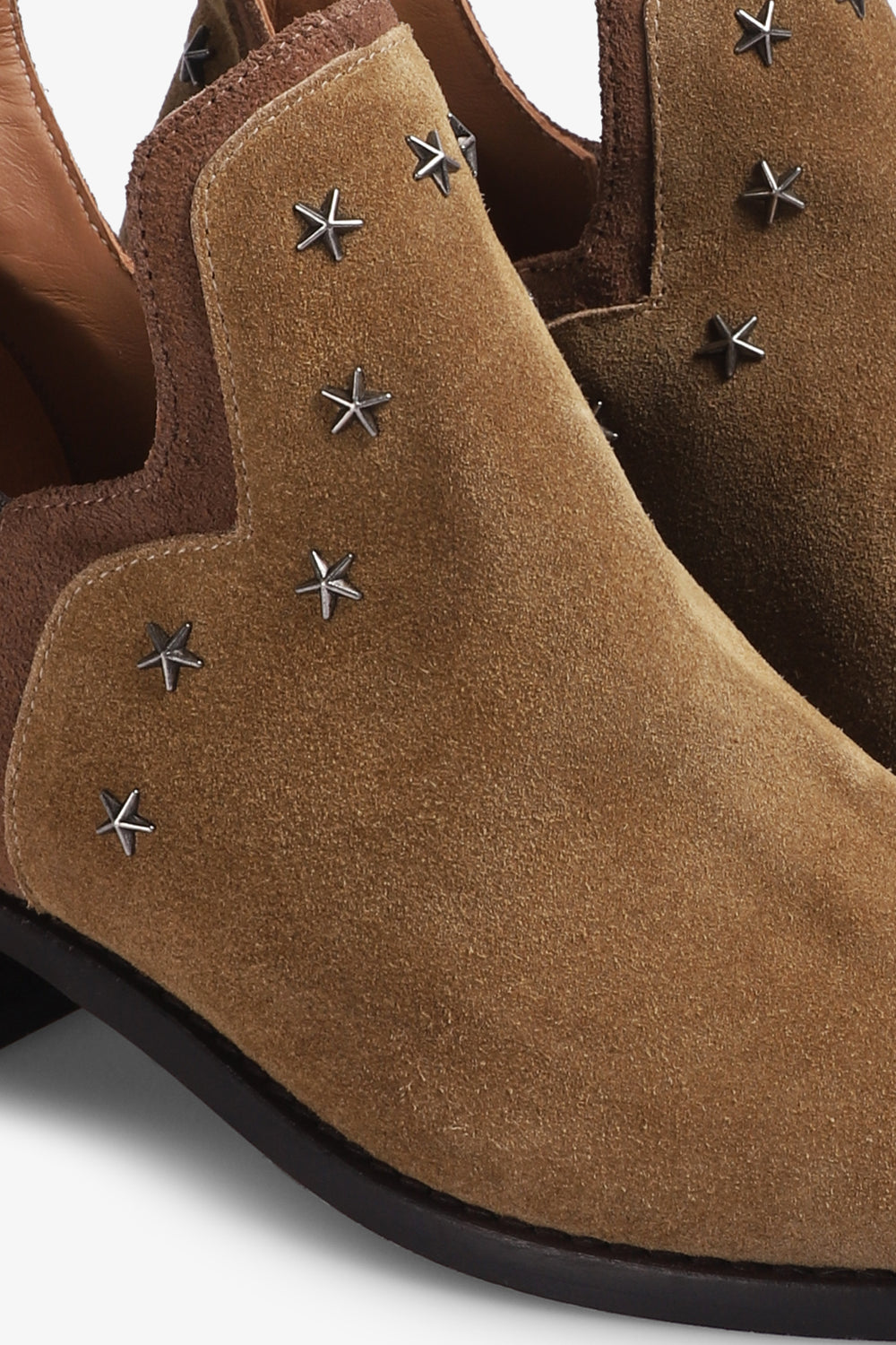 Botas Micuir confeccionadas en piel seraje en tostado. Silueta abierta en el tobillo rematada con ribete de ante a tono. Detalles de tachas metálicas de estrellas hipoalérgicas en tono plata, un tacón de 4 cm de altura con plantilla de microgel para un mayor confort. Forro y plantilla de piel mestizo de cabra a tono y planta con certificado ''handmade in Spain'' con logo grabado a fuego. Incluye una bolsa de algodón.