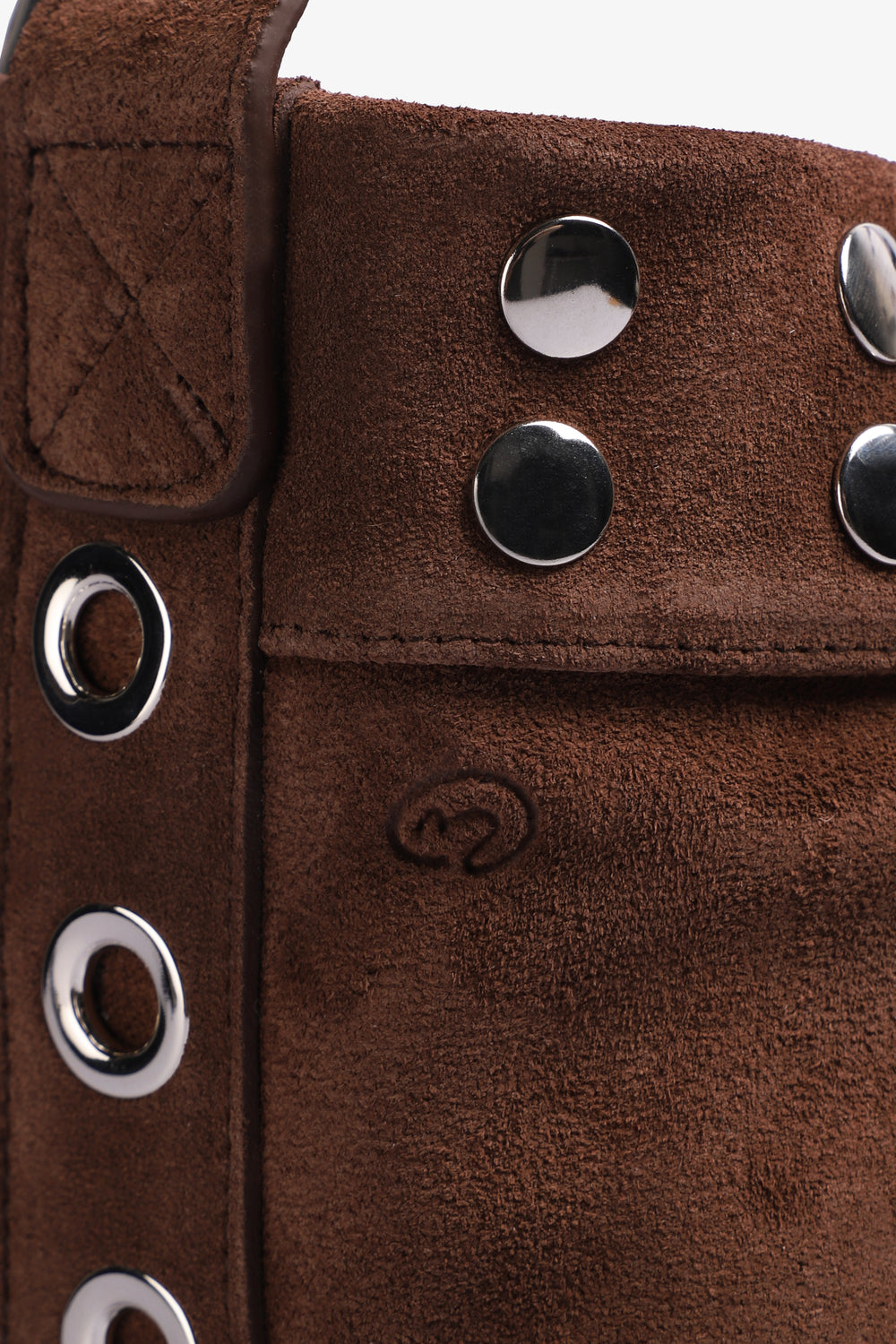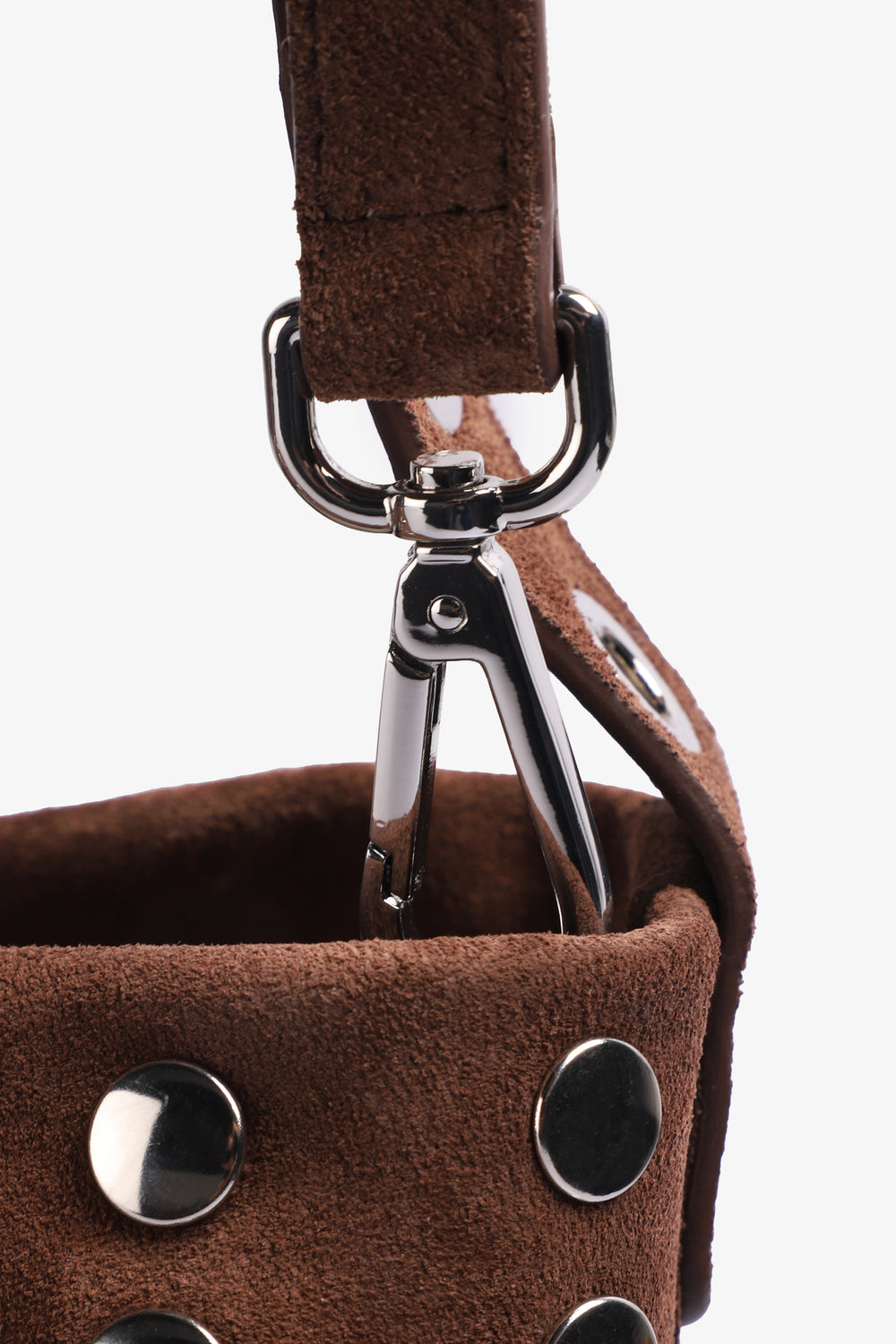 Bolso Micuir elaborado artesanalmente en España con serraje marrón y detalles de tachas plateadas. Cuena con un cierre de clip en la parte superior y dos bolsillos interiores, uno de ellos con cremallera. Su versatilidad se destaca por las dos opciones de asa: una corta y otra ajustable para llevar al hombro.