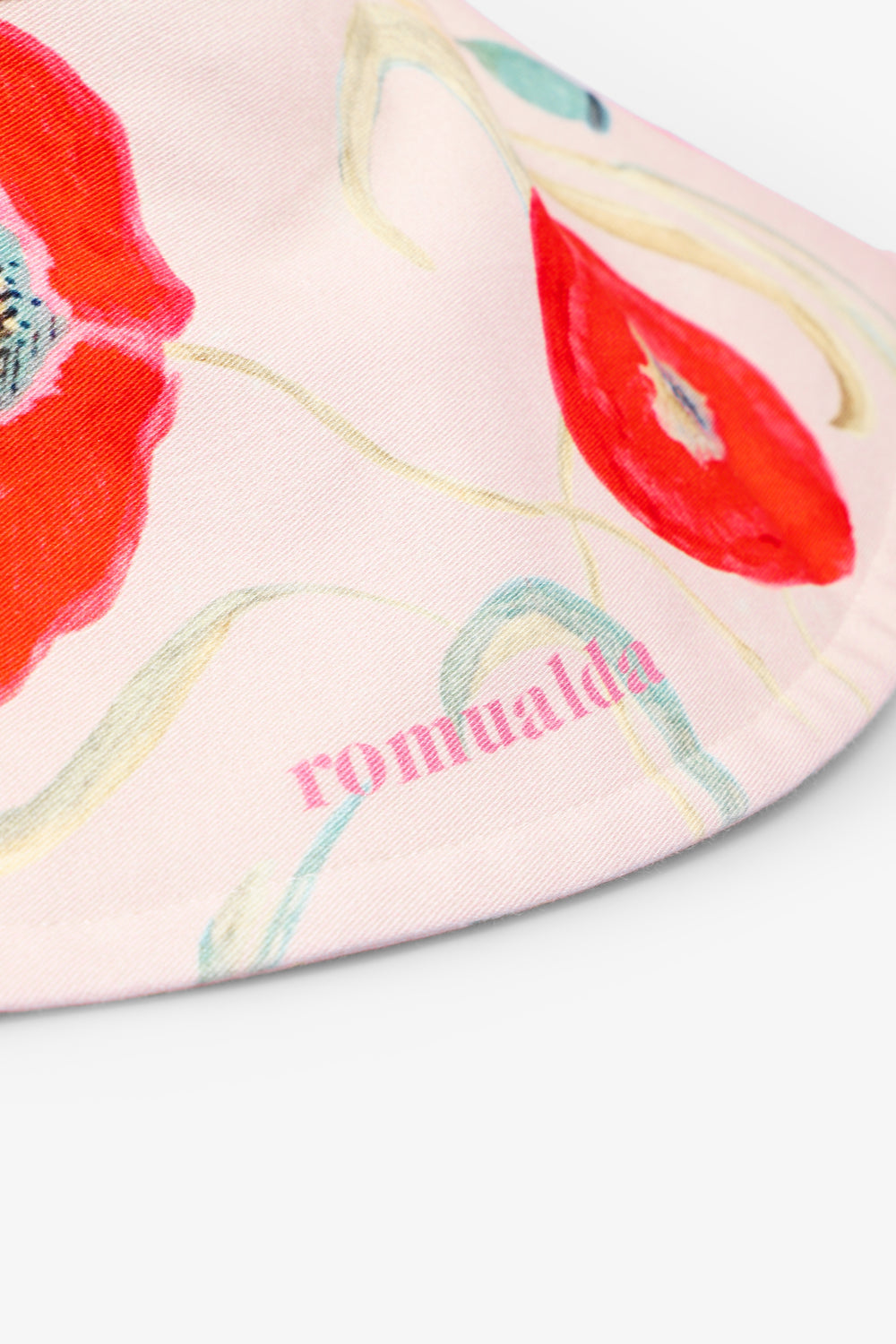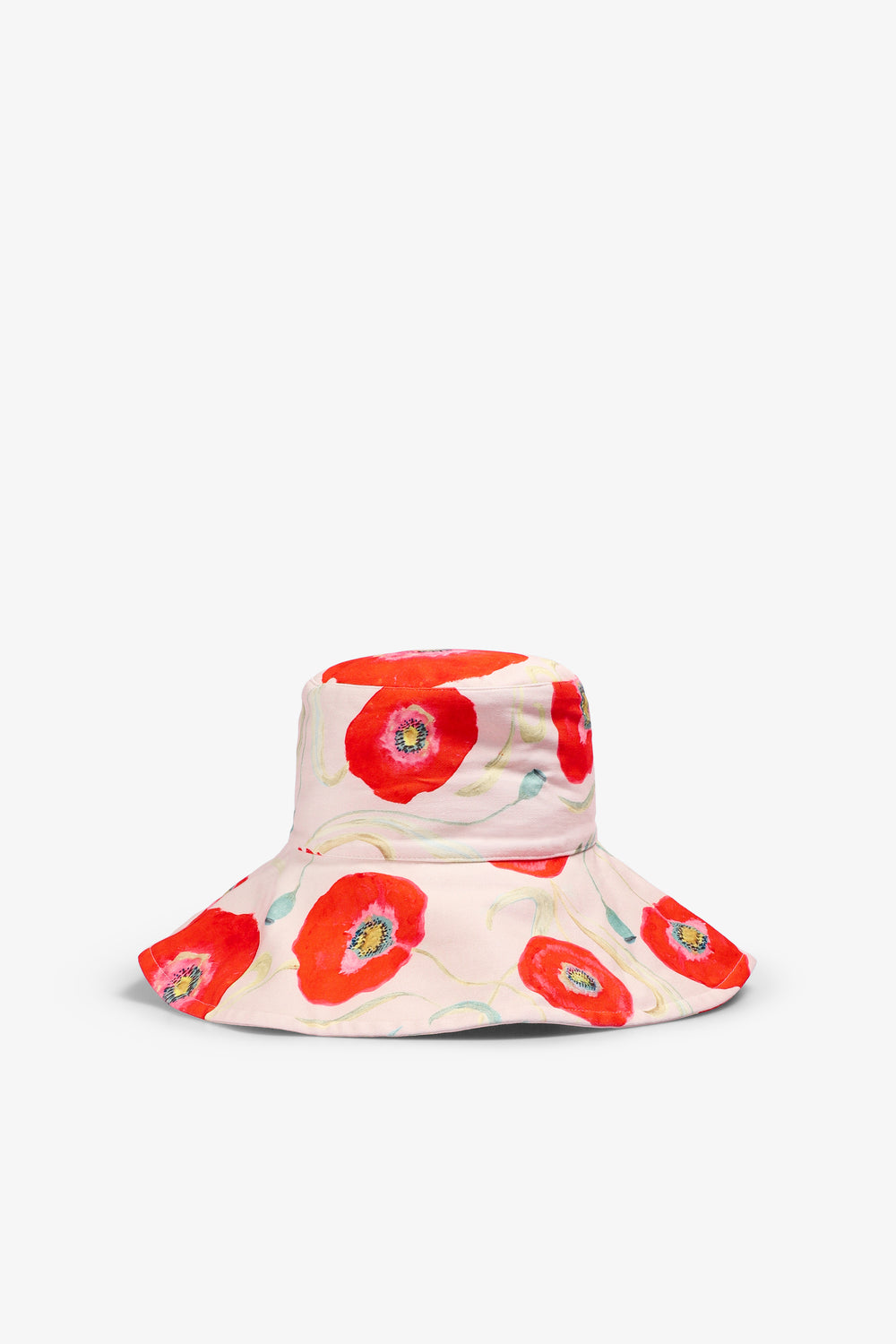 Sombrero Romualda confeccionado en 97% algodón y 3% elastano. Se trata de un sombrero reversible con un ala de 13cm en un estampado de amapolas sobre un fondo color crema.