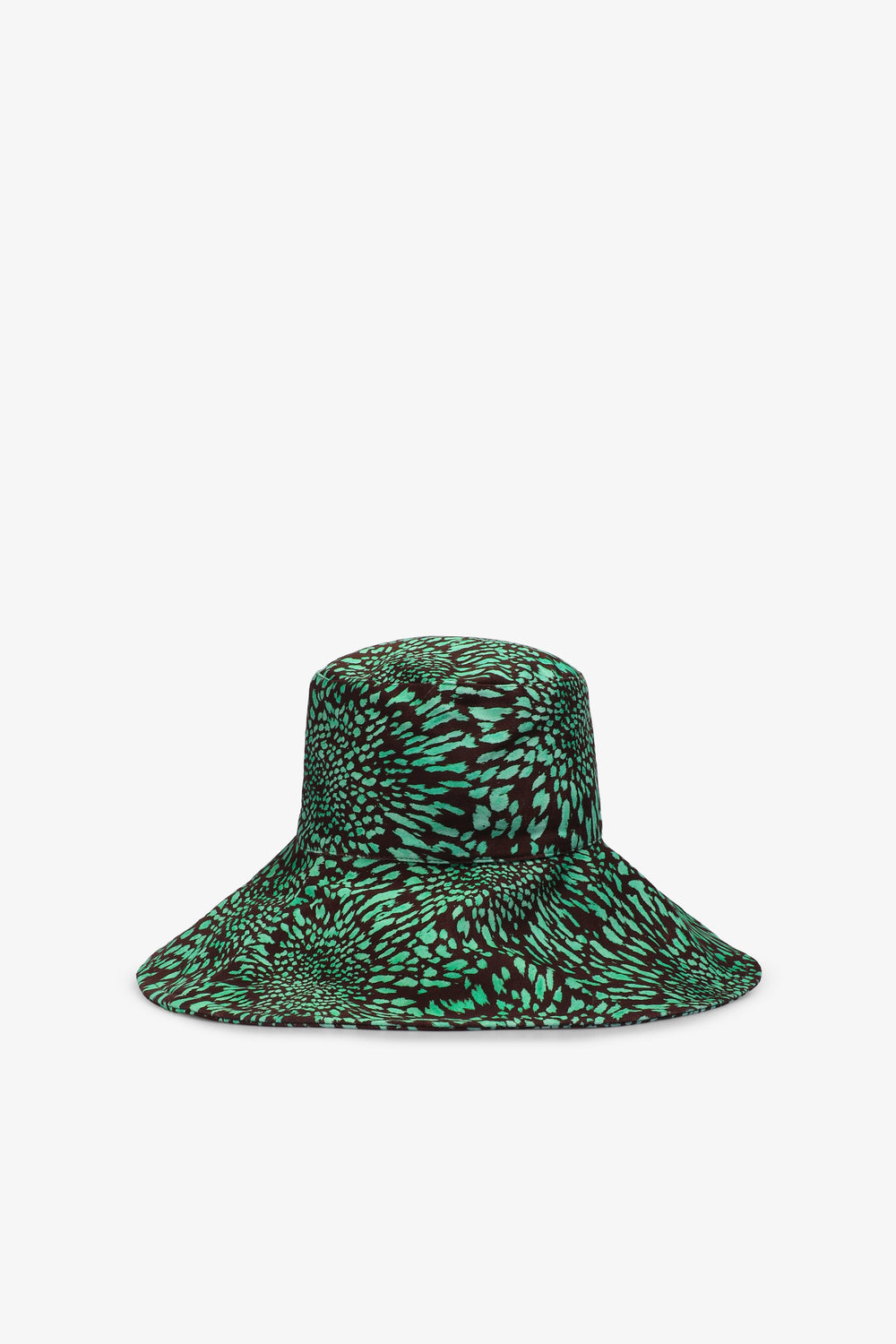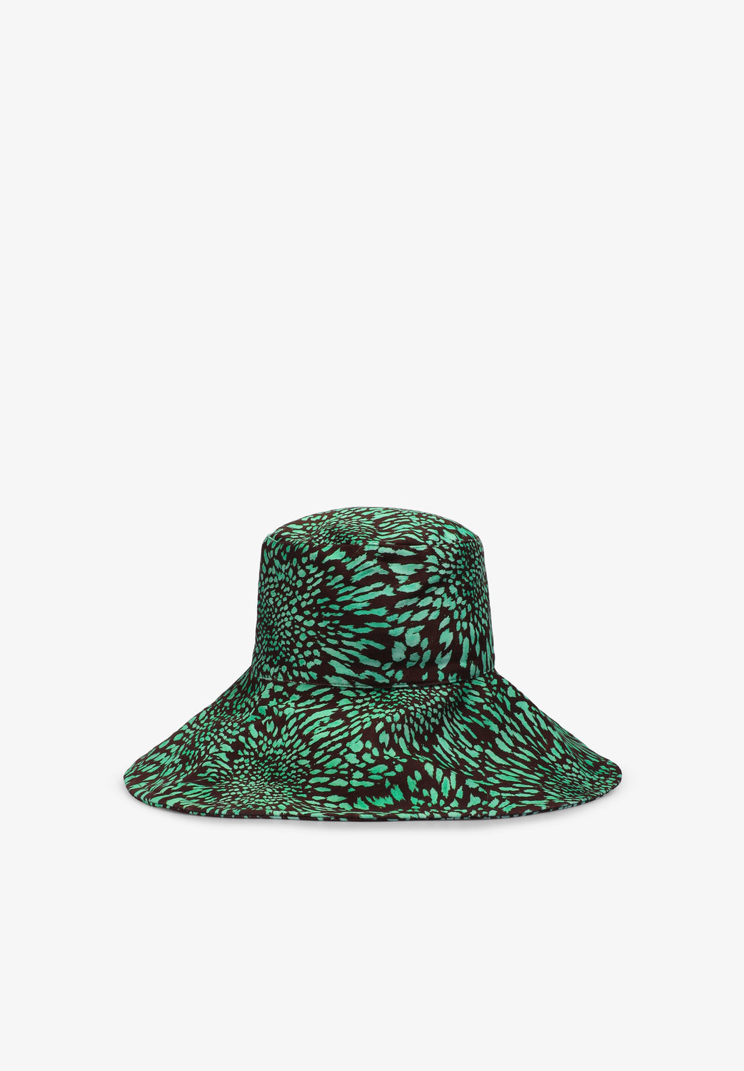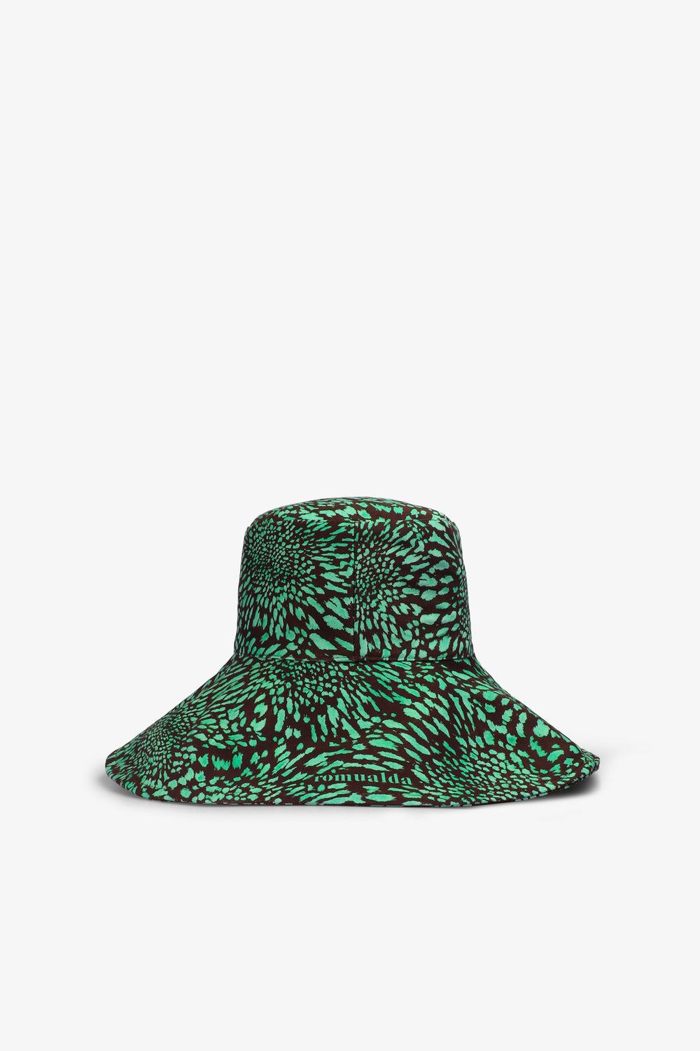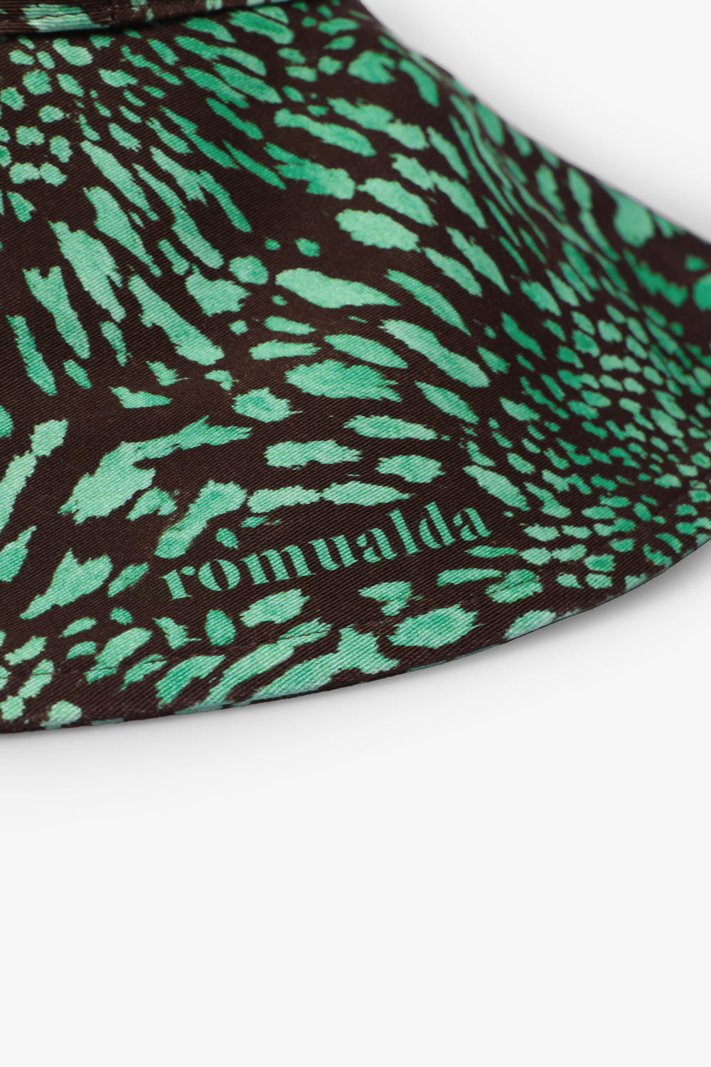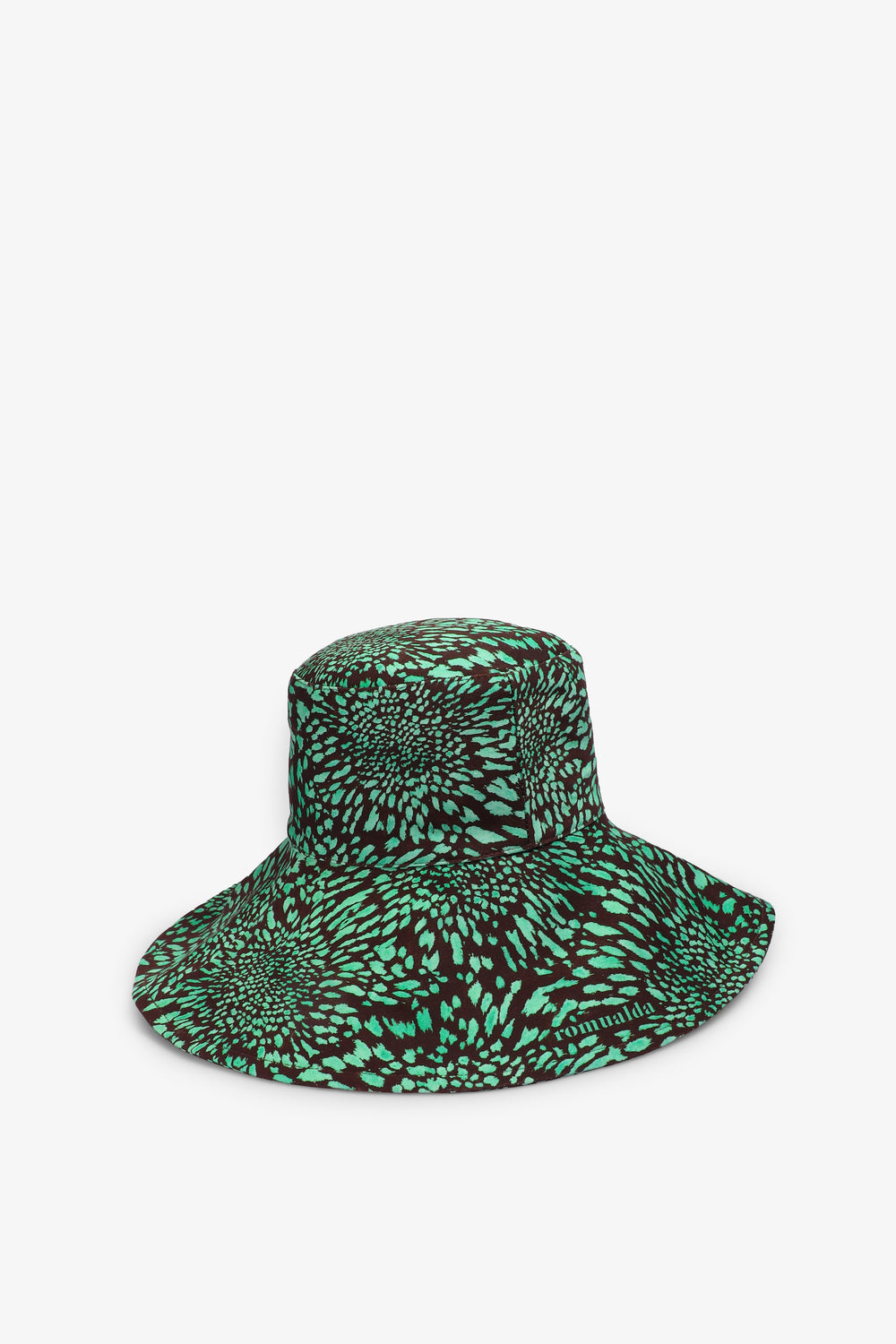 Gorro Romualda confeccionado en 98% algodón y 2% elastano. Se trata de un sombrero reversible con ala de 13cm y un estampado único de motas florales verde menta sobre fondo chocolate.