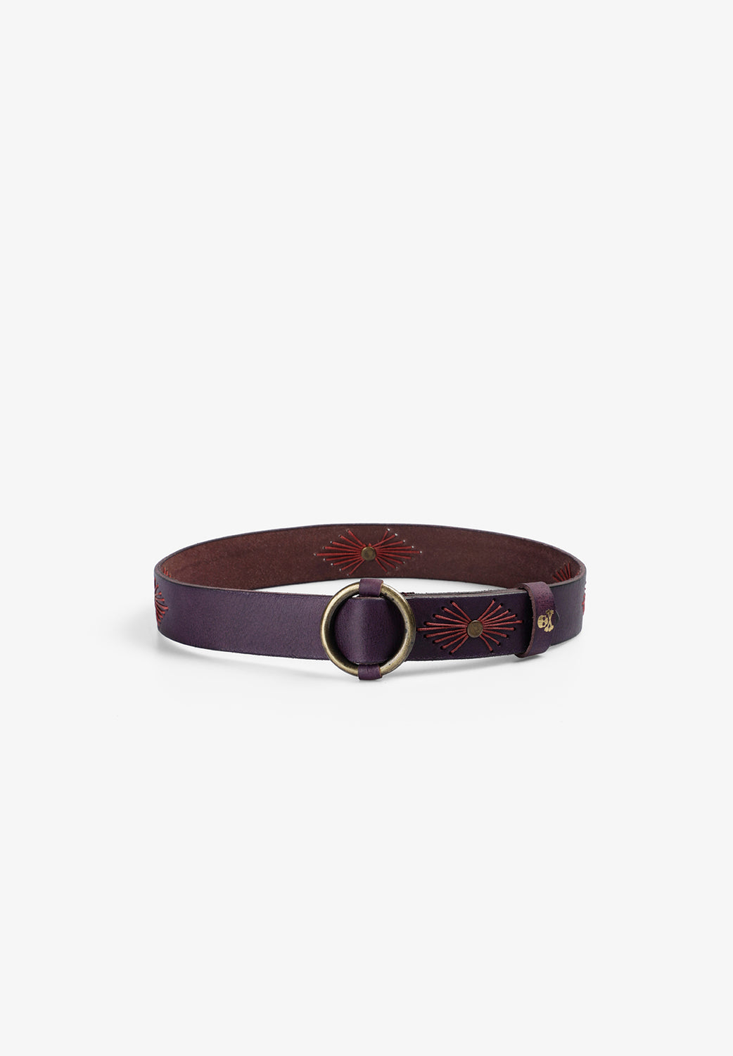 Cinturón confeccionado en 100% piel con hebilla metálica redonda. Detalle costuras decorativas.