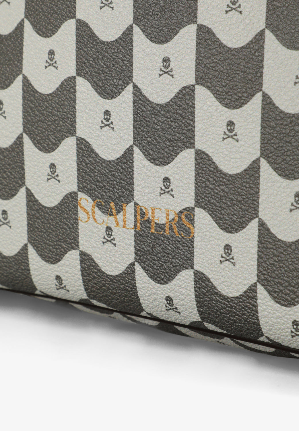 Bolso shopper confeccionado en 100% piel. Fabricado en España. Cartera a juego con cierre de cremallera. Estampado bicolor con calaveras y logo en frontal. Opción personalización.
