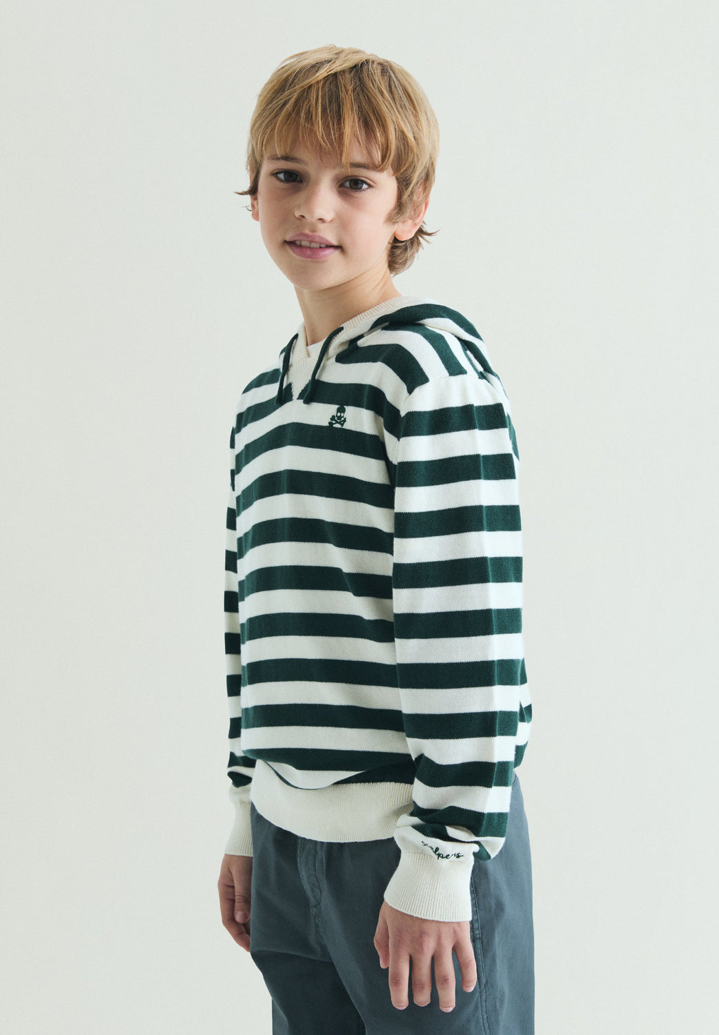 Jersey con capucha de manga larga confeccionada en 100% algodón . Diseño de rayas en contraste y acabados en rib. Detalle de logo bordado en el pecho.