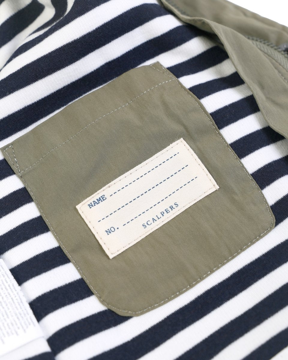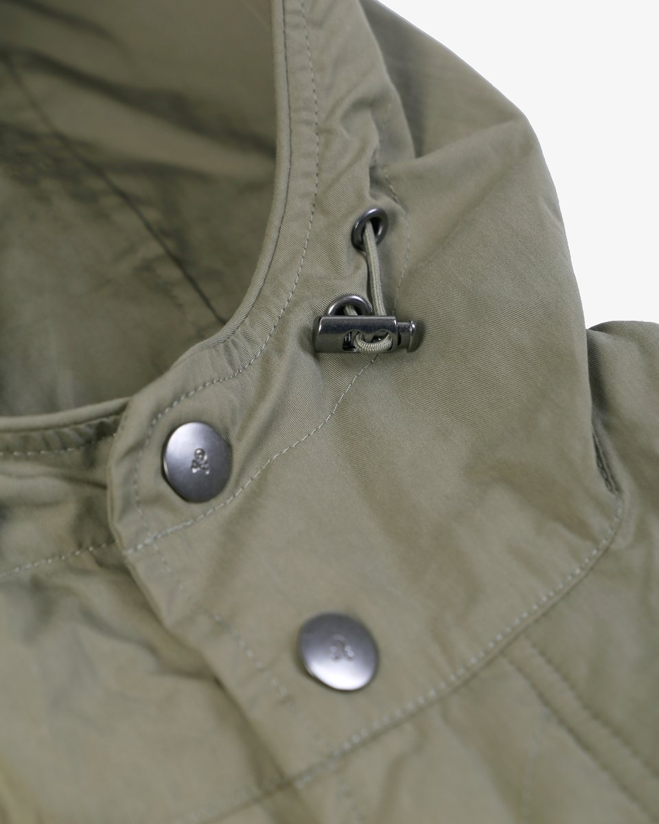 Chaqueta de largo medio confeccionada en algodón. Corte recto ajustable en cintura con cordón, cuello con capucha y visera, y cierre con cremallera y botones de strap ocultos por tapeta. Bolsillos de ojal con solapa, manga larga y parte trasera acabada en pico y trabillas. Forro interior de rayas desmontable. Disponible en dos colores.