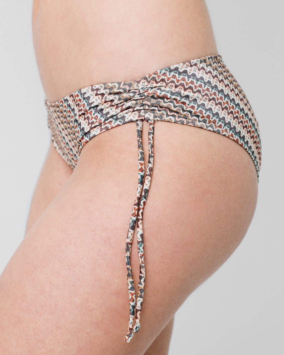 Bikini con estampado étnico con forma de bandeau con tirantas. Braguita con detalle de frunces laterales.