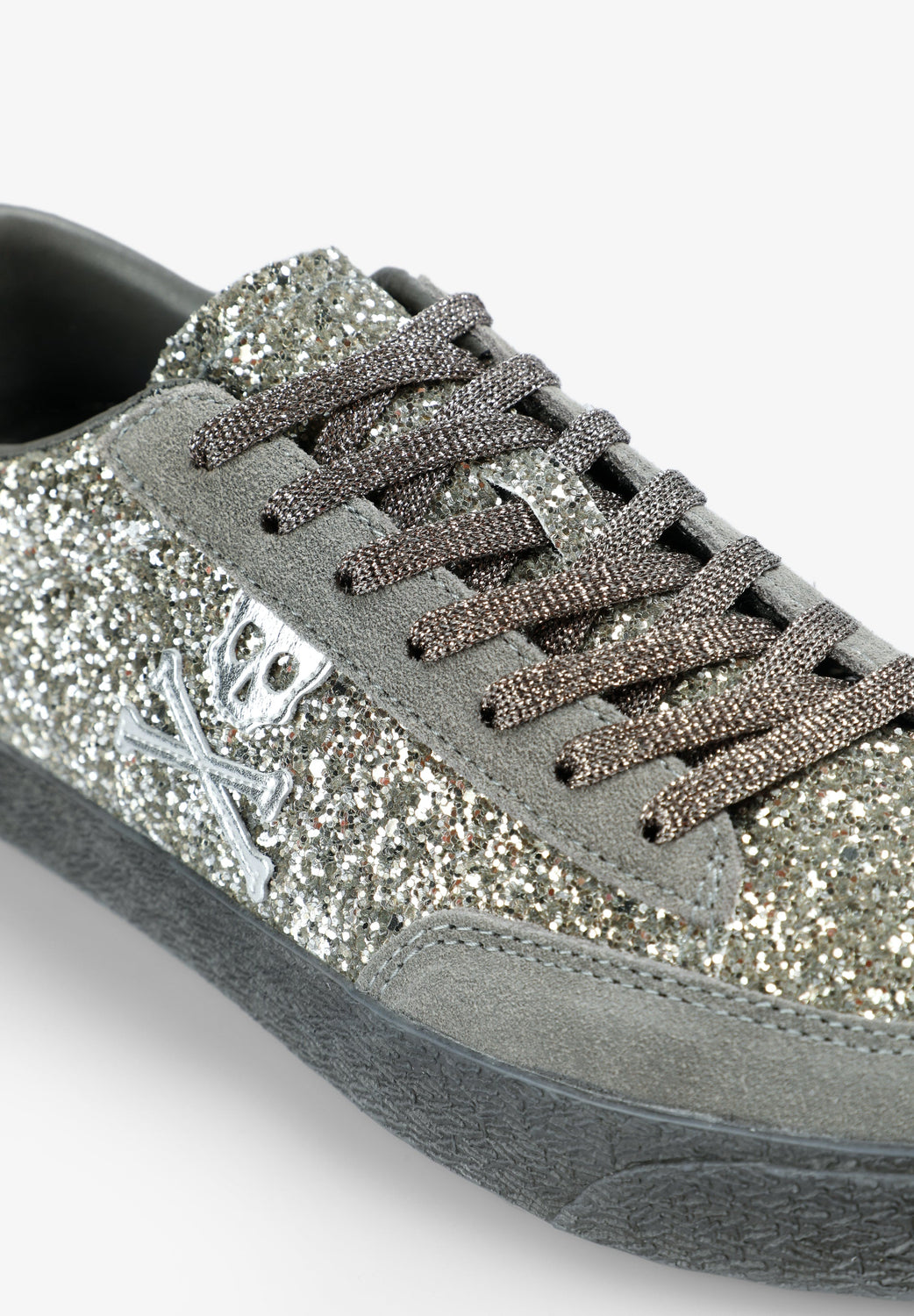 Sneakers confeccionadas en ante. Glitter. Calavera lateral bordada a contraste. Cierre con cordones. Talón a contraste con detalle de logo bordado a tono. Suela de caucho a contraste.