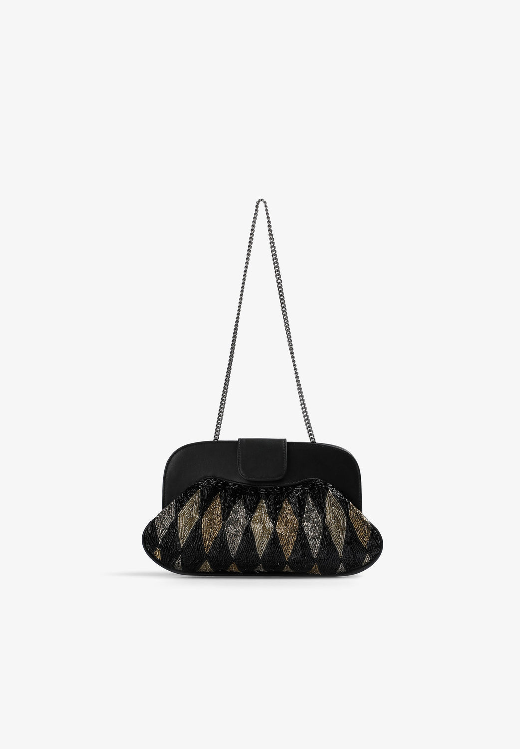 Bolso de mano confeccionado en algodón. Detalle de cuentas. Correa metálica extraíble en posición de bandolera. Cierre imantado. Detalle de logo bordado en el interior.