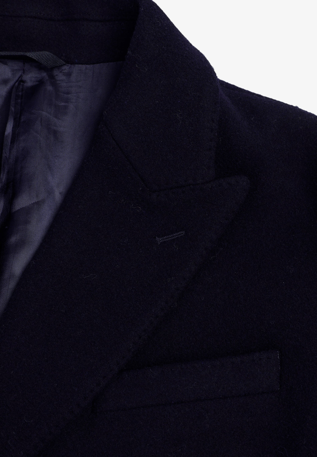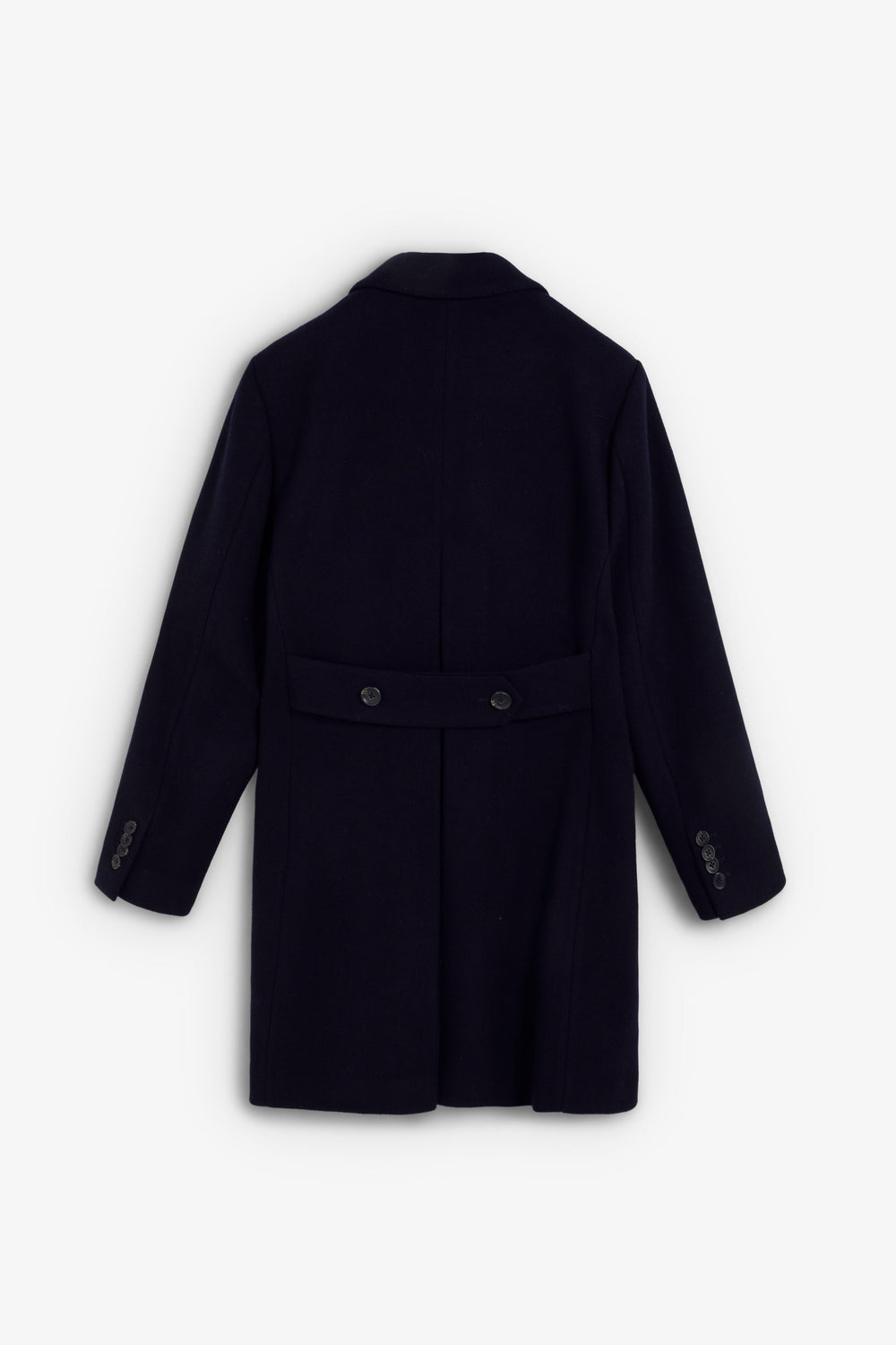 Abrigo confeccionado en tejido con lana. Cuello con solapas de pico y manga larga. Botones en puño personalizados. Bolsillos de solapa en frontal. Bajo con pliegue en centro espalda. Cierre frontal con botonadura cruzada.