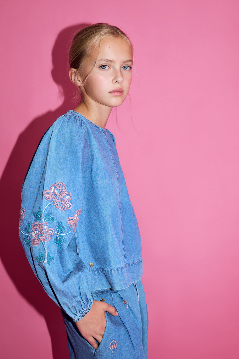 Blusa confeccionada 100% en algodón BCI. Manga larga abullonada y acabada en goma. Cuello redondo y detalle de flores bordadas en las mangas. Cierre con botón en espalda.