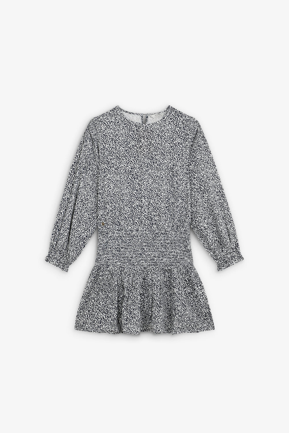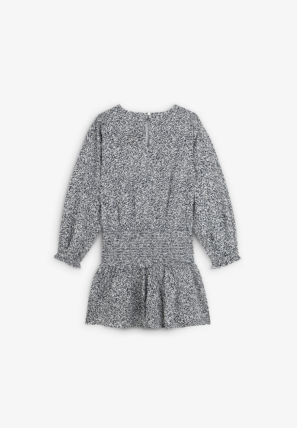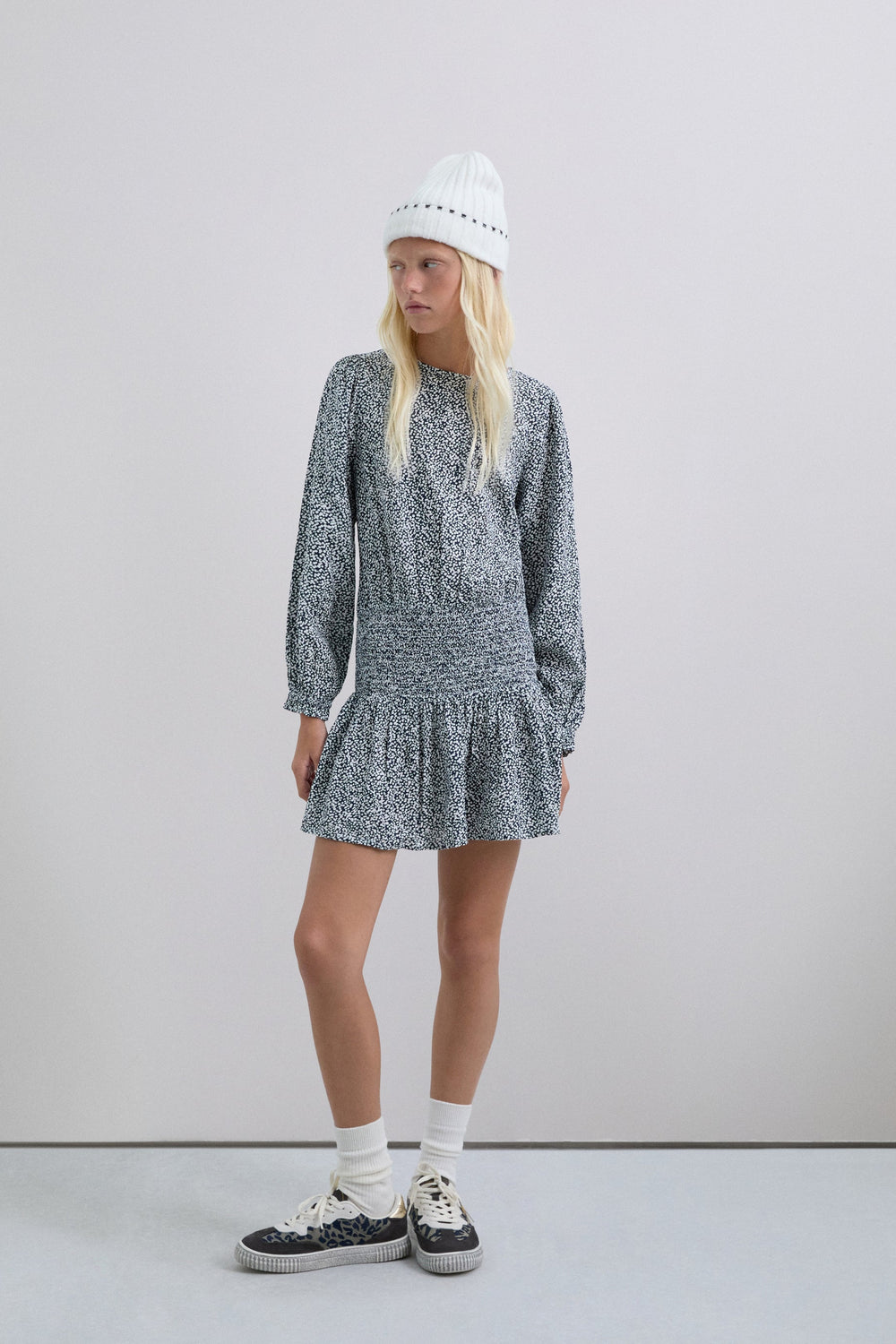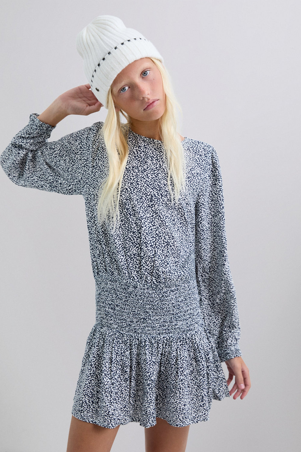 Vestido mini. Regular fit. Cuello redondo. Mangas largas ligeramente abullonadas y terminadas en frunce. Detalle nido de abeja y calavera en cintura. Cierre trasero con botón.