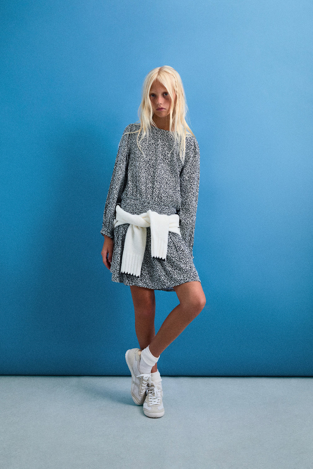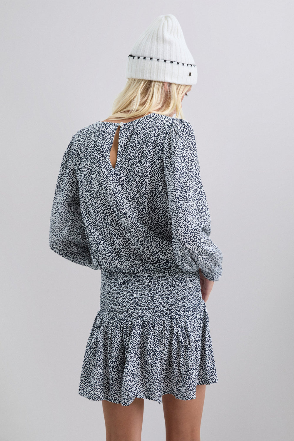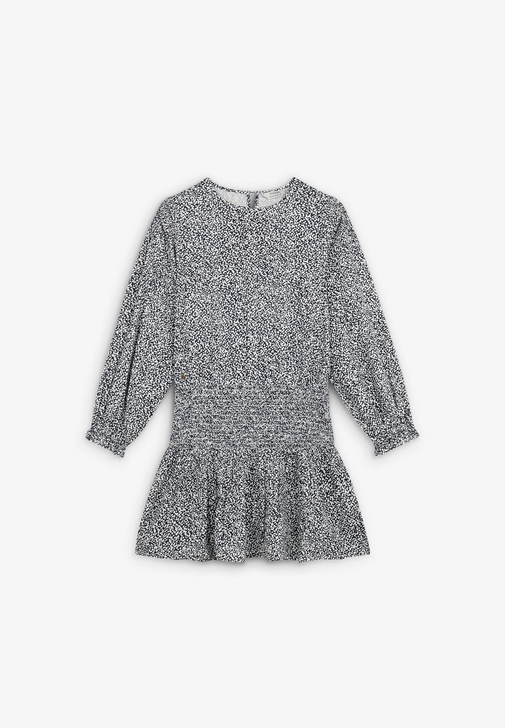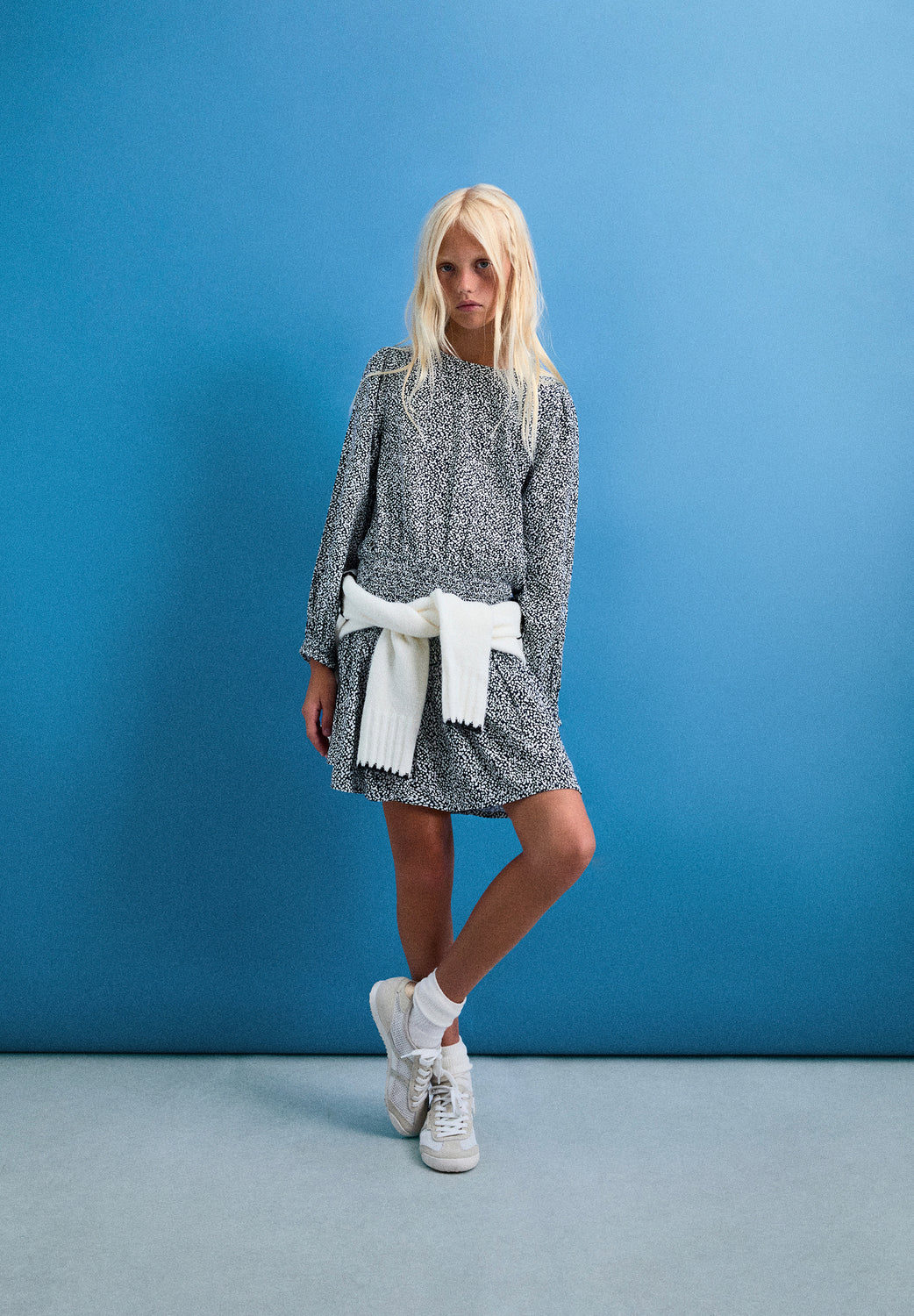 Vestido mini. Regular fit. Cuello redondo. Mangas largas ligeramente abullonadas y terminadas en frunce. Detalle nido de abeja y calavera en cintura. Cierre trasero con botón.