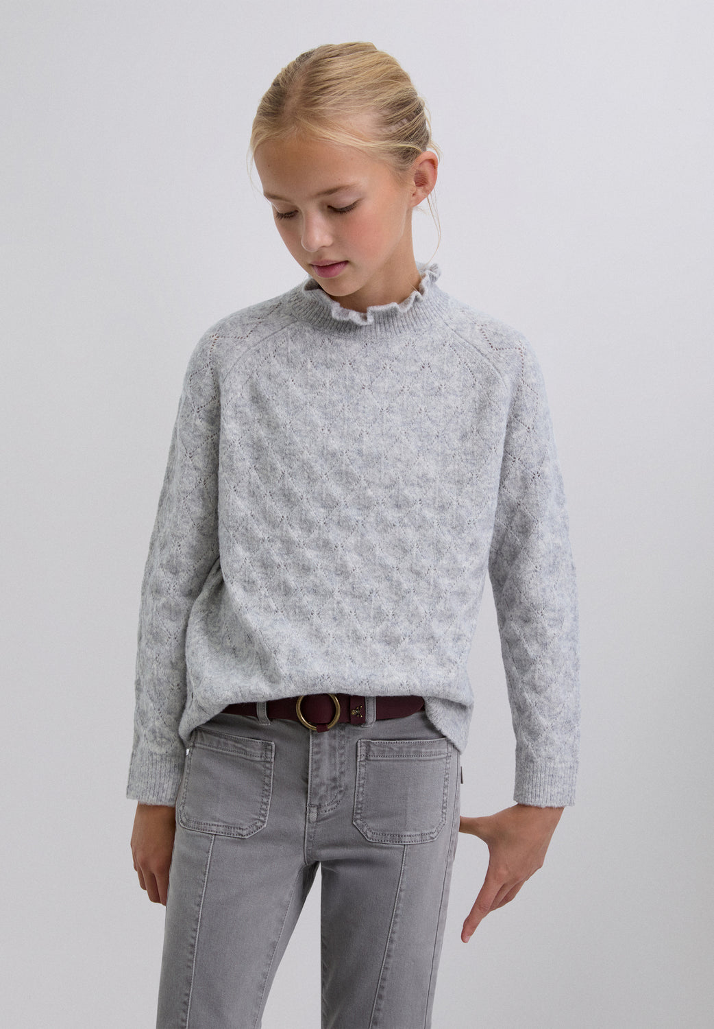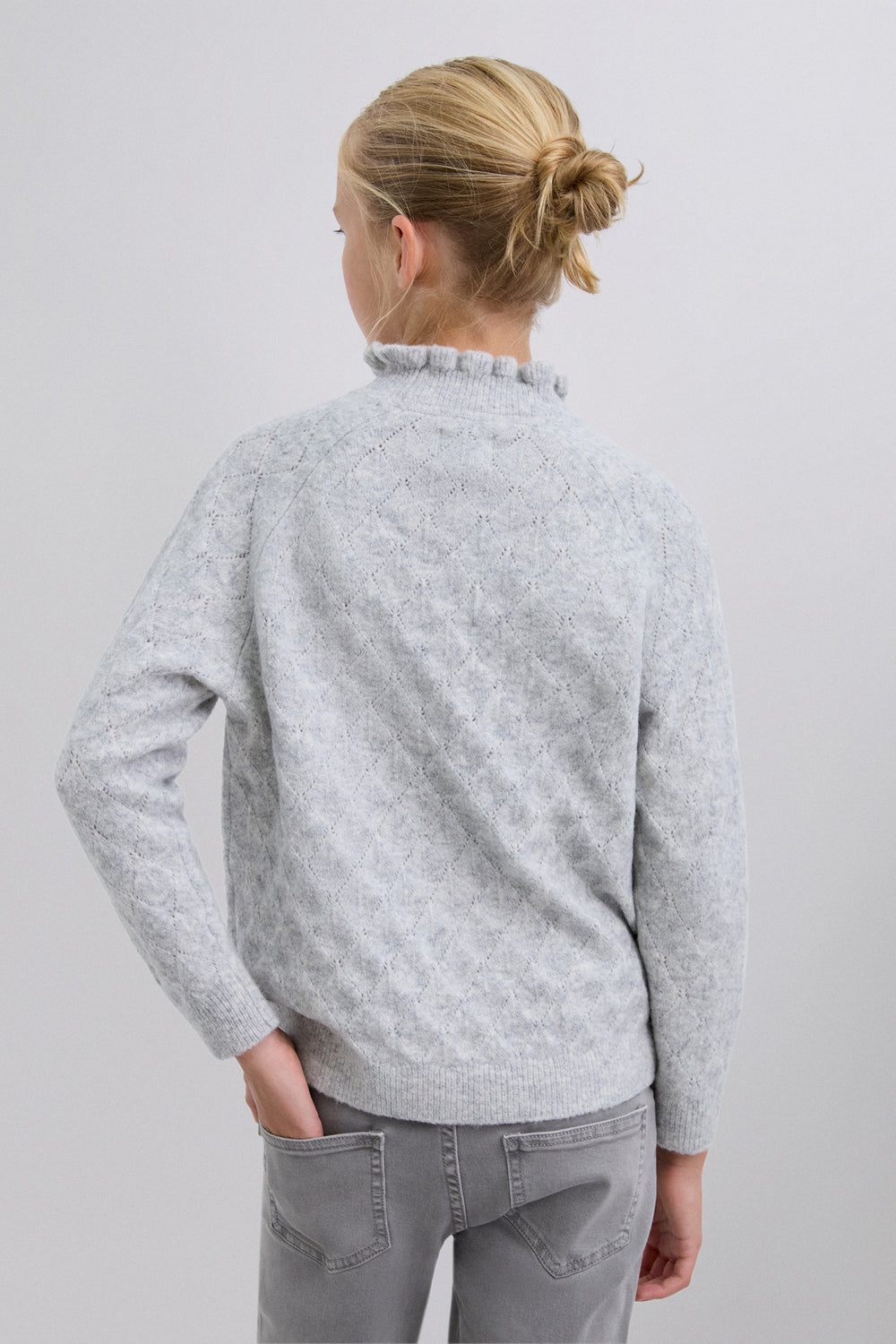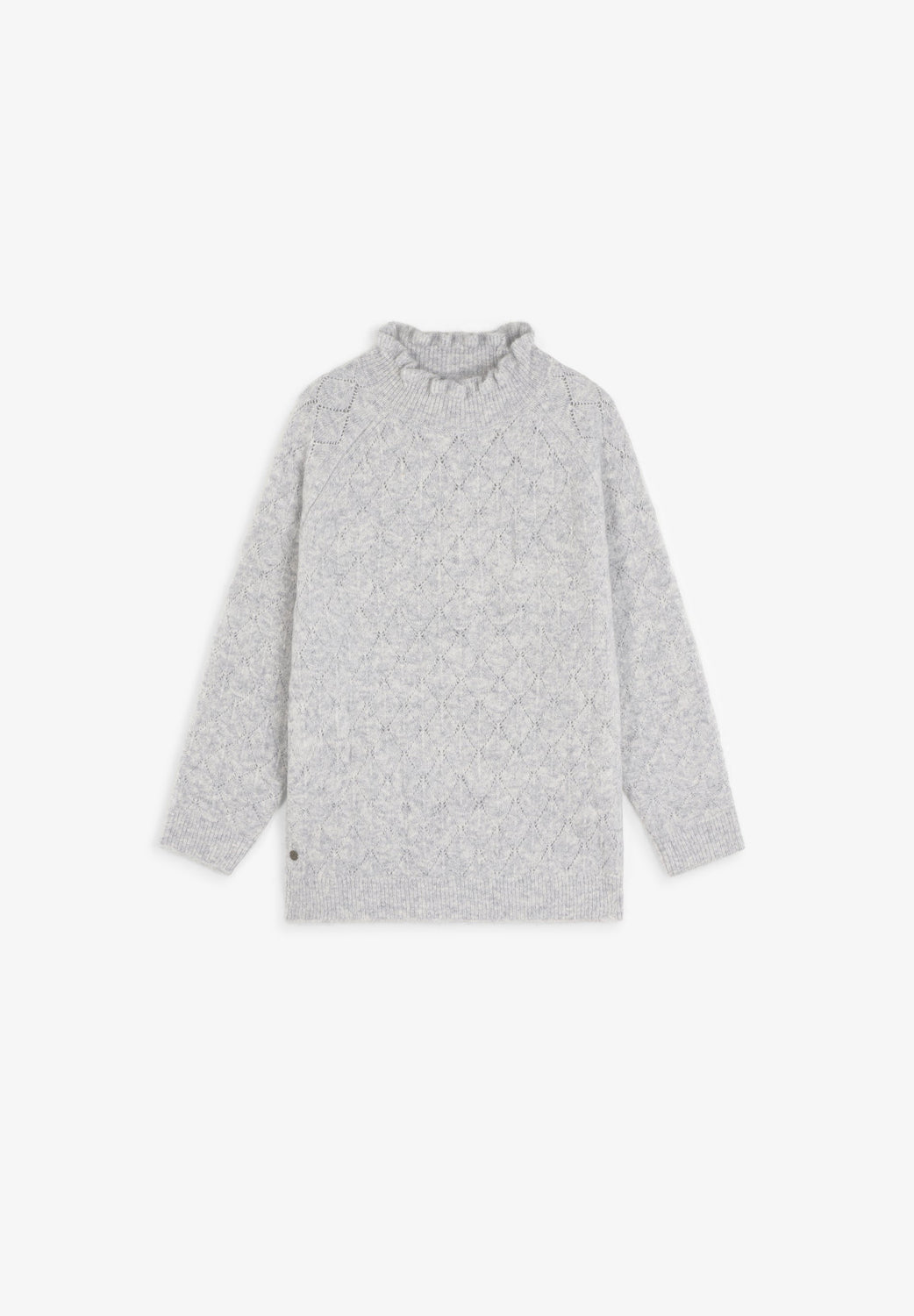Jersey de punto confeccionado en mezcla de lana merino. Cuello perkins con volantes. Manga larga con acabados acanalados. Motivo perforado de rombos.