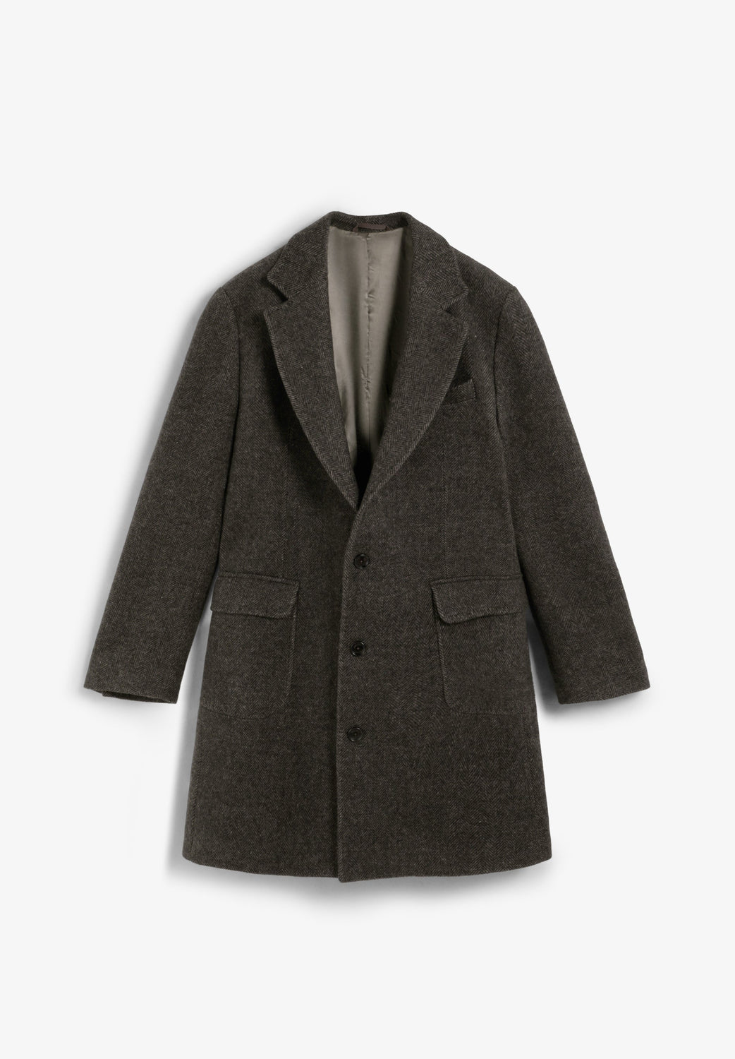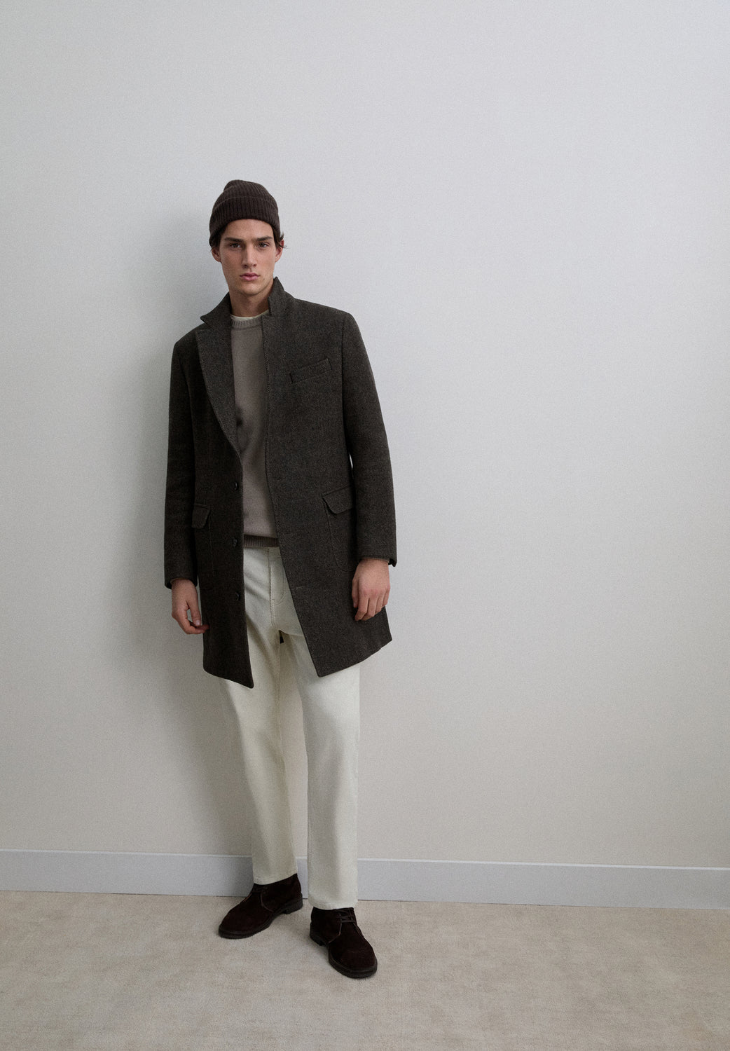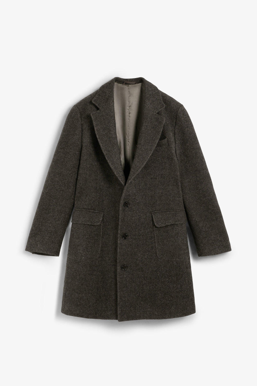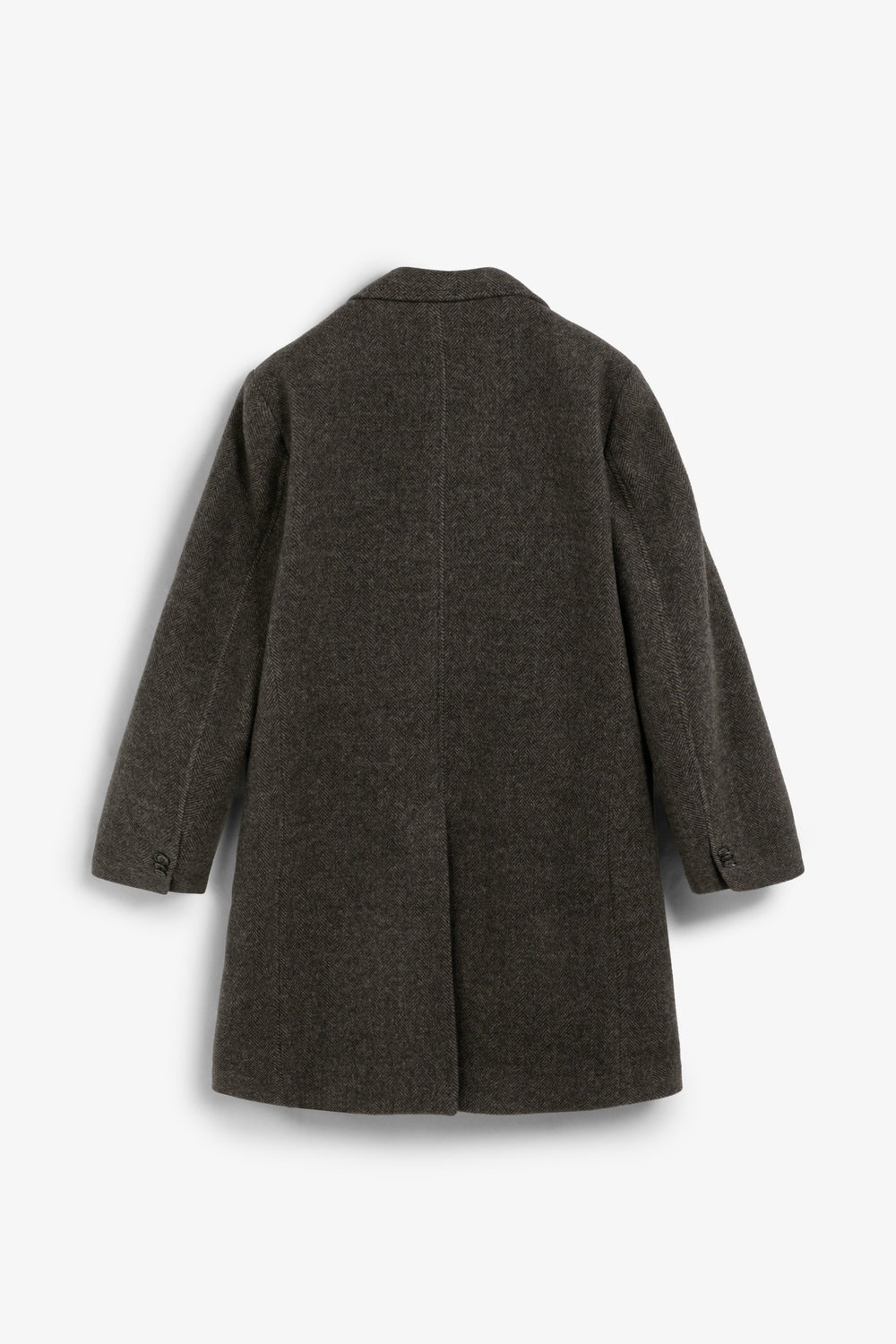 Abrigo de tejido espiga en tonos marrones. Cuello con solapa. Bolsillos con doble tapa, cierre frontal con botones. Tacto cepillado.