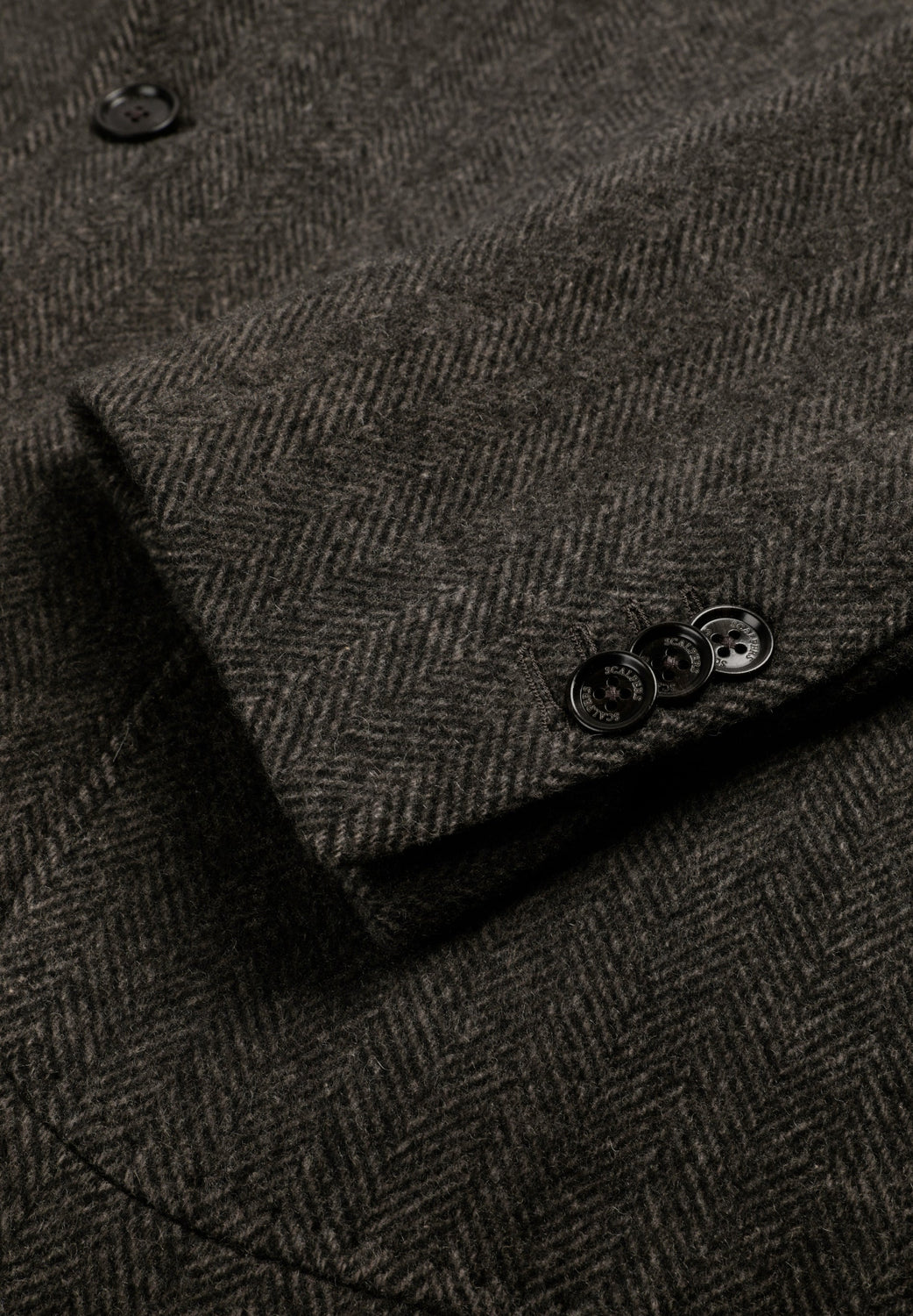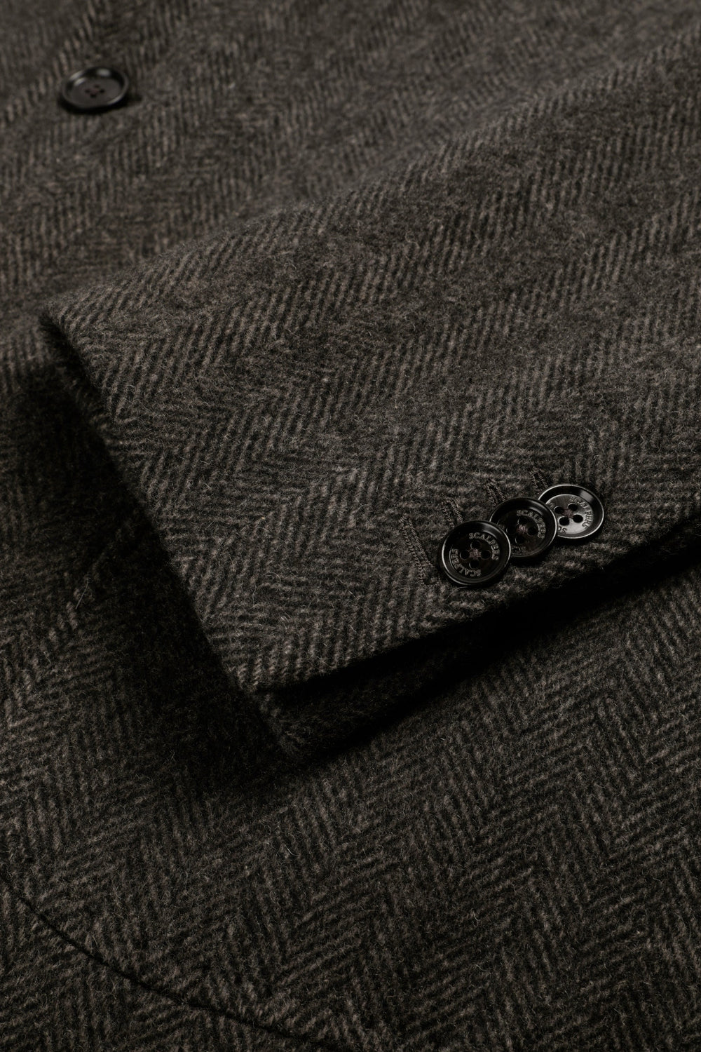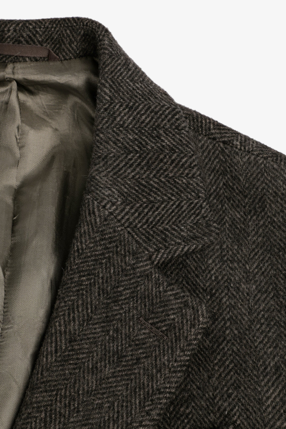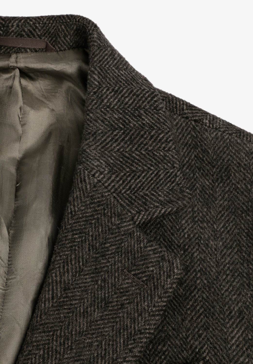 Abrigo de tejido espiga en tonos marrones. Cuello con solapa. Bolsillos con doble tapa, cierre frontal con botones. Tacto cepillado.