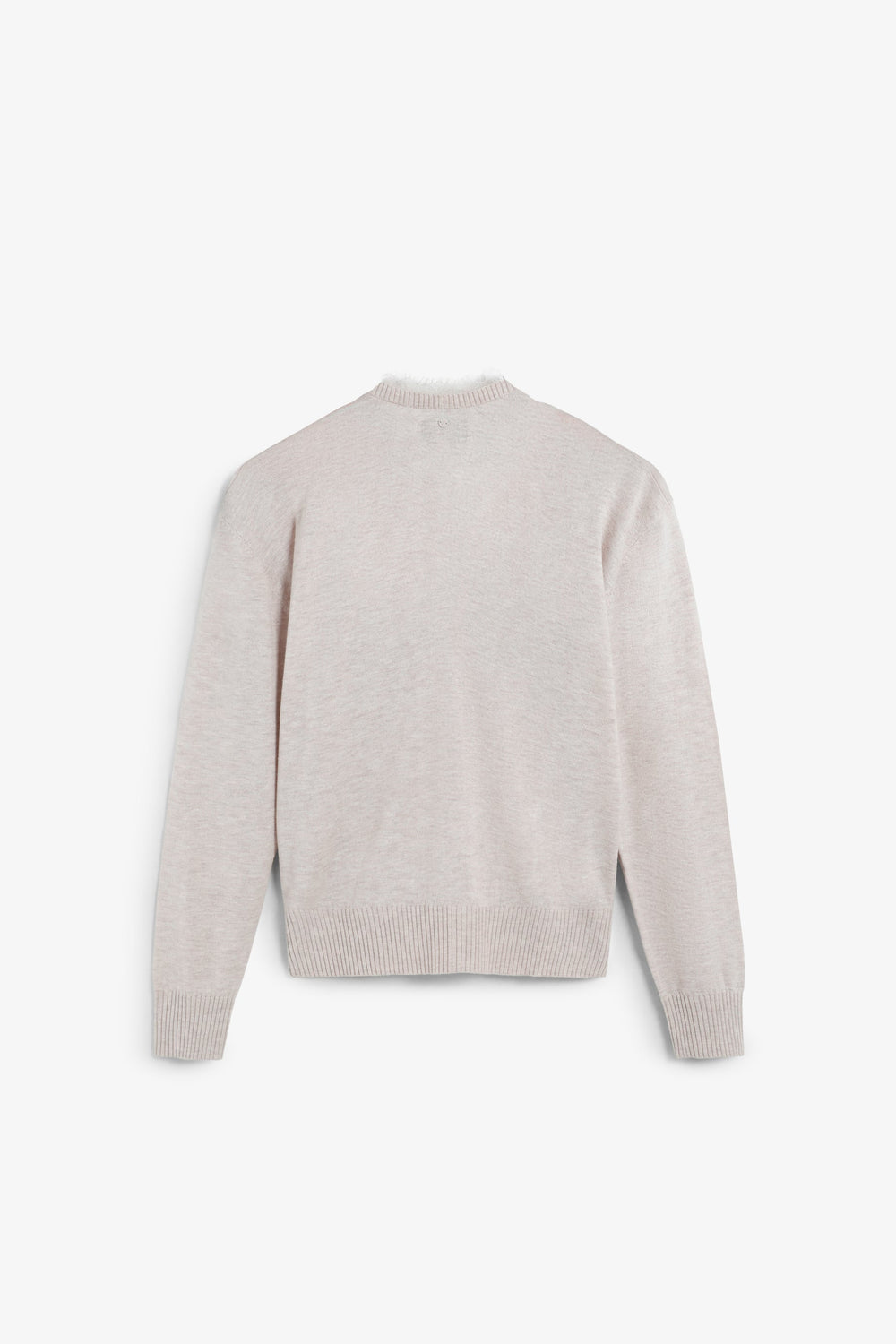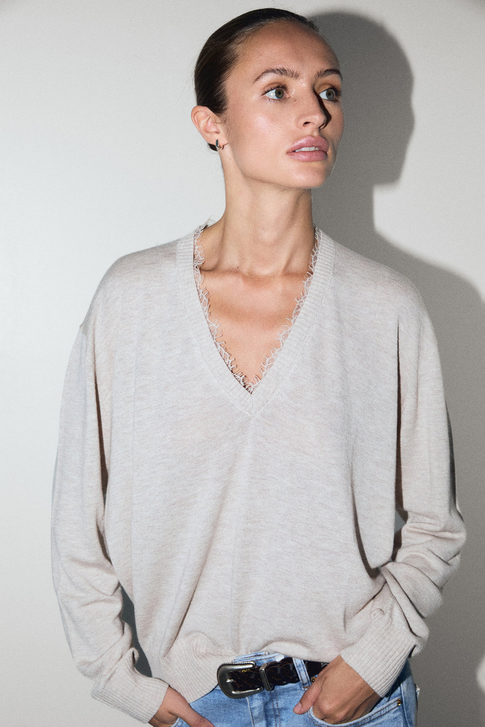 Jersey confeccionado en mezcla de lana y viscosa. Regular fit. Escote en V con detalles de encaje. Manga larga con puños y bajo acabados en rib.