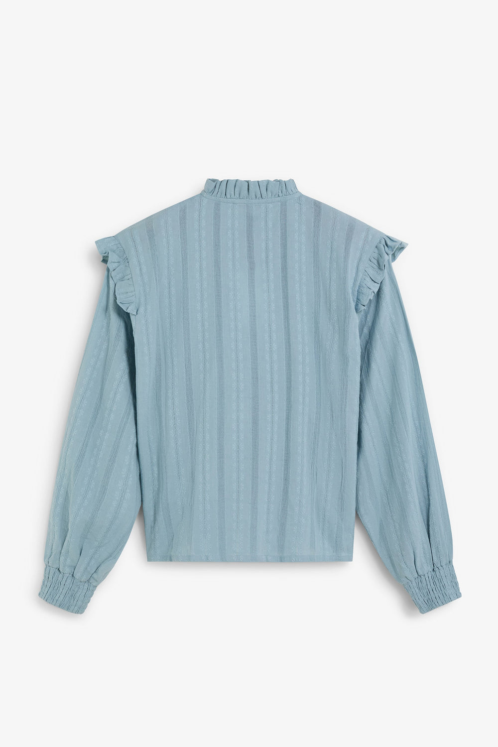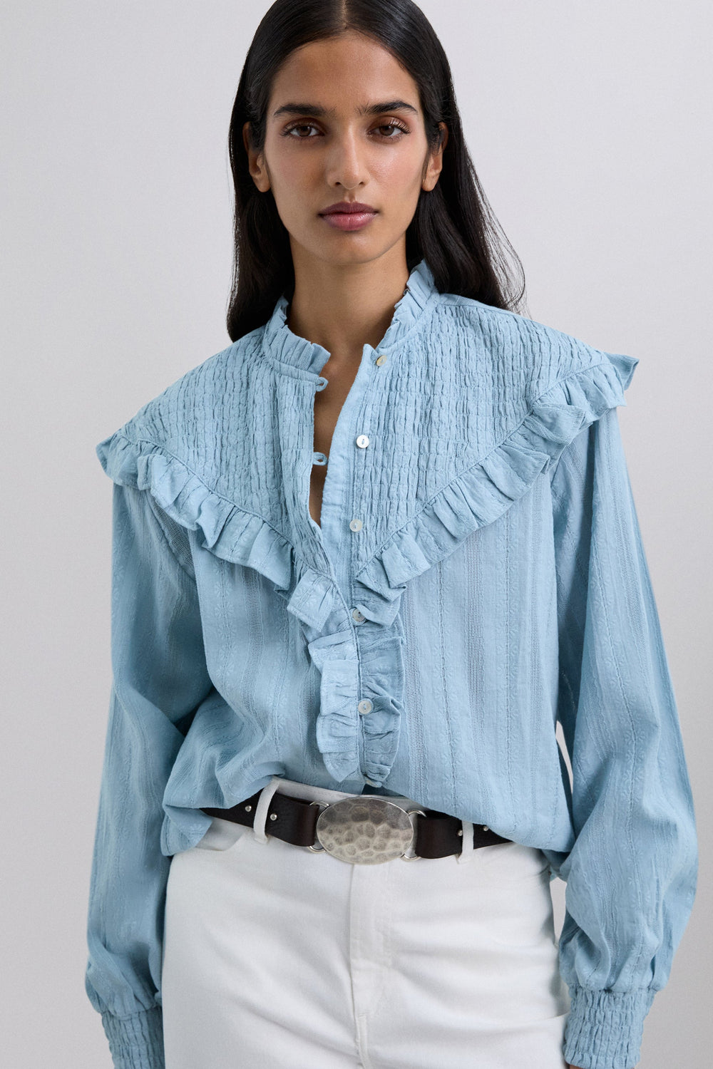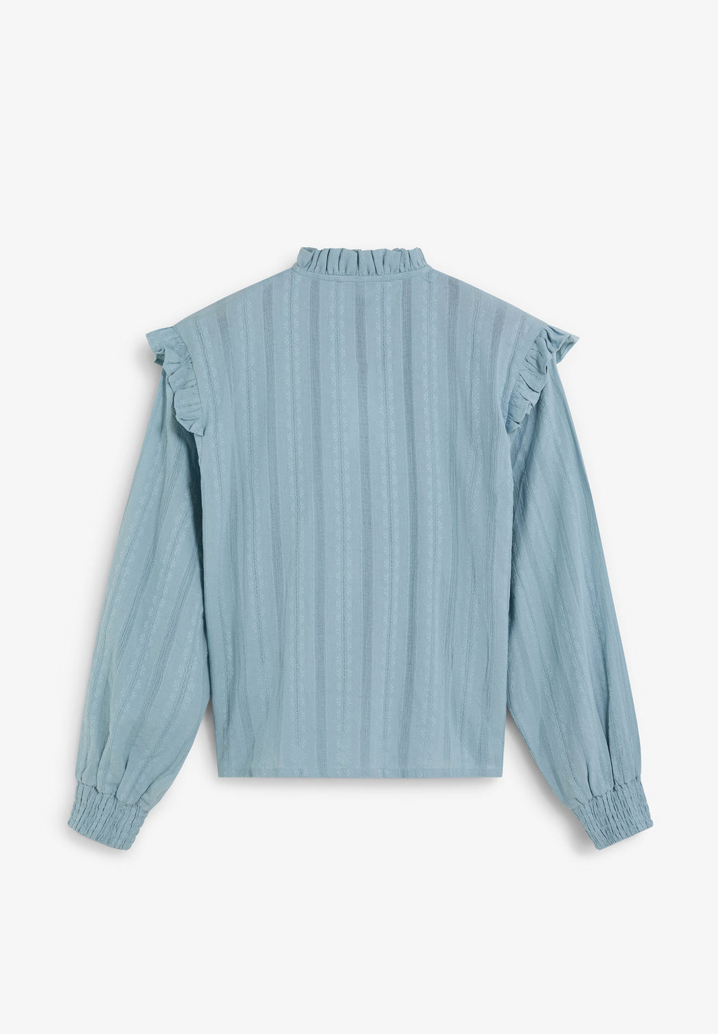 Blusa de manga larga confeccionada en 100% algodón. Cuello clásico y volante en tejido nido de abeja. Botones de nácar.