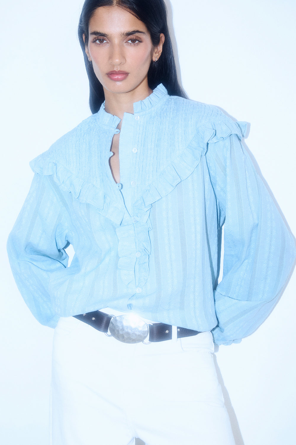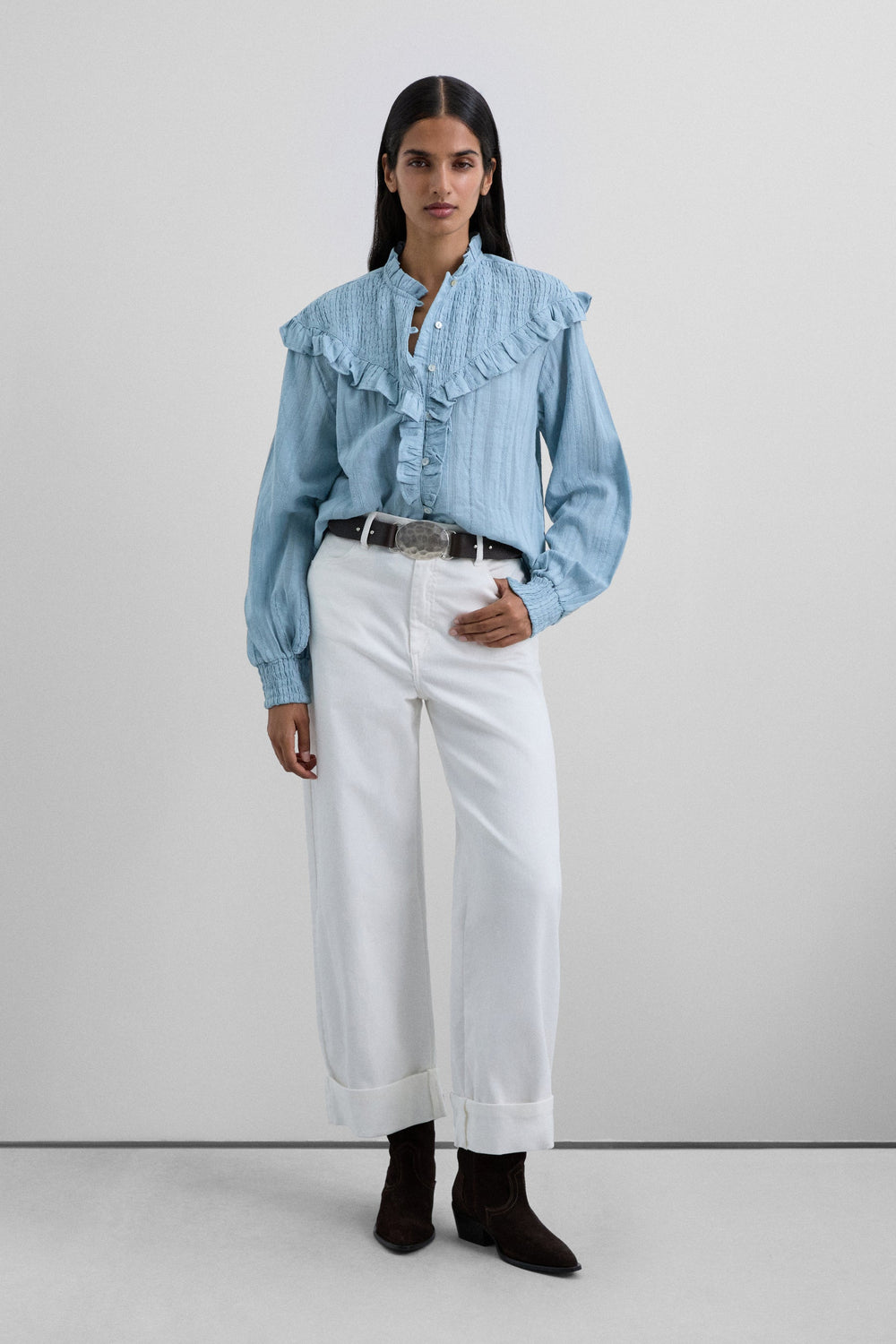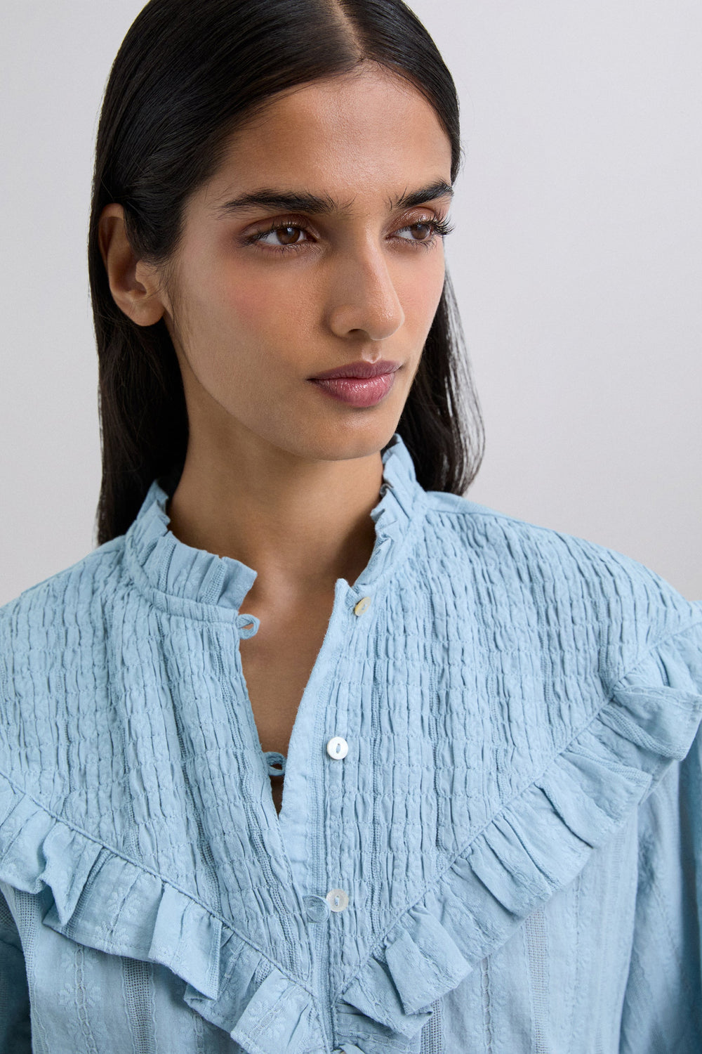 Blusa de manga larga confeccionada en 100% algodón. Cuello clásico y volante en tejido nido de abeja. Botones de nácar.