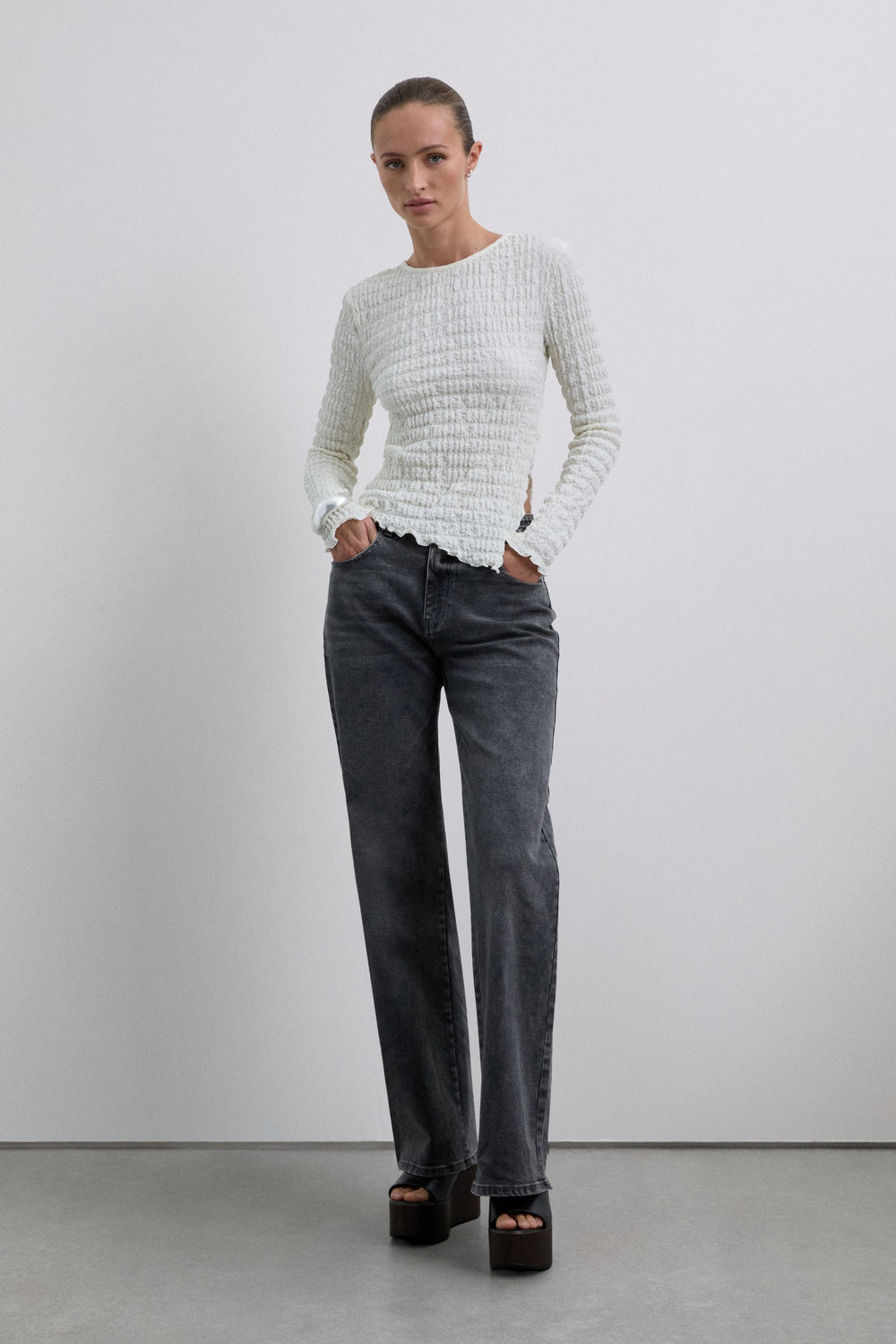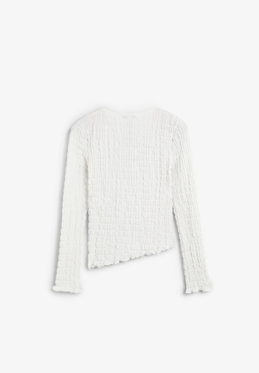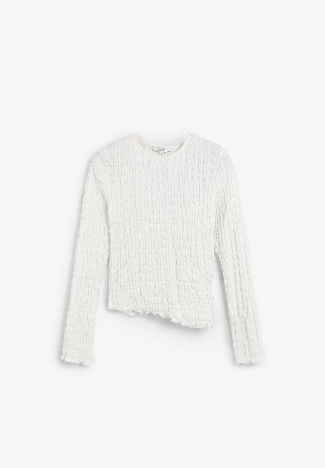 Top cuello redondo y manga larga. Tejido ligero con diseño con estructura fruncida.