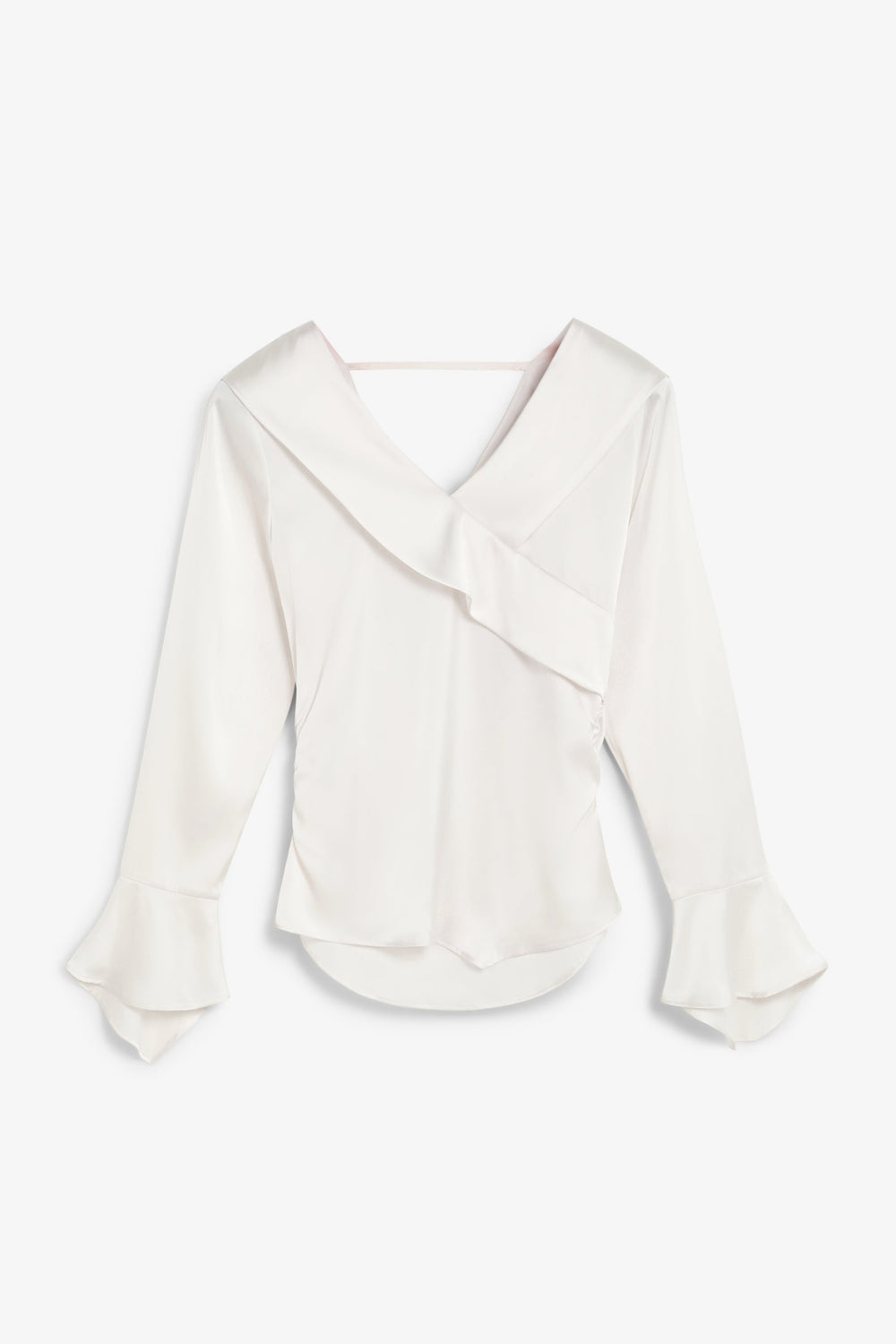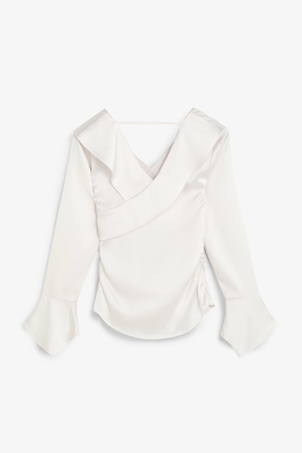 Blusa asimétrica de manga larga acabada en volante. Cintura fruncida y escote en pico con detalle volante.