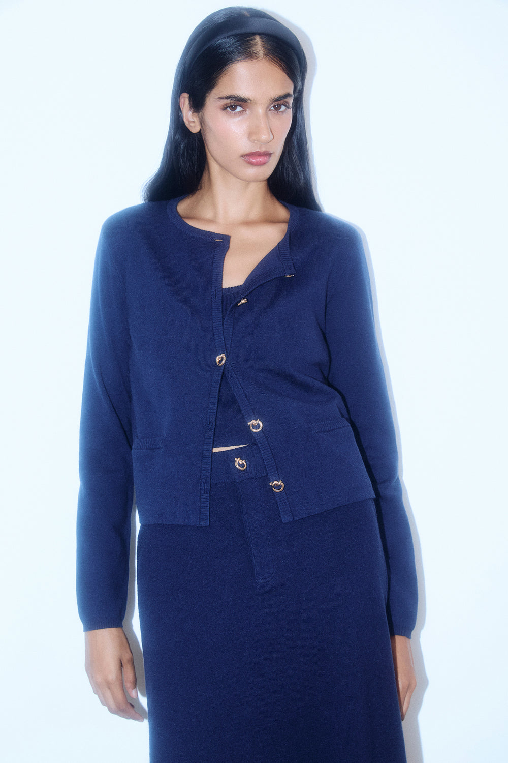 Cárdigan de punto fino confeccionado en mezcla de algodón y viscosa. Slim fit. Cuello redondo. Ligera hombrera. Manga larga. Bolsillos de vivo frontales. Cierre con botones con detalle de nudo dorados.