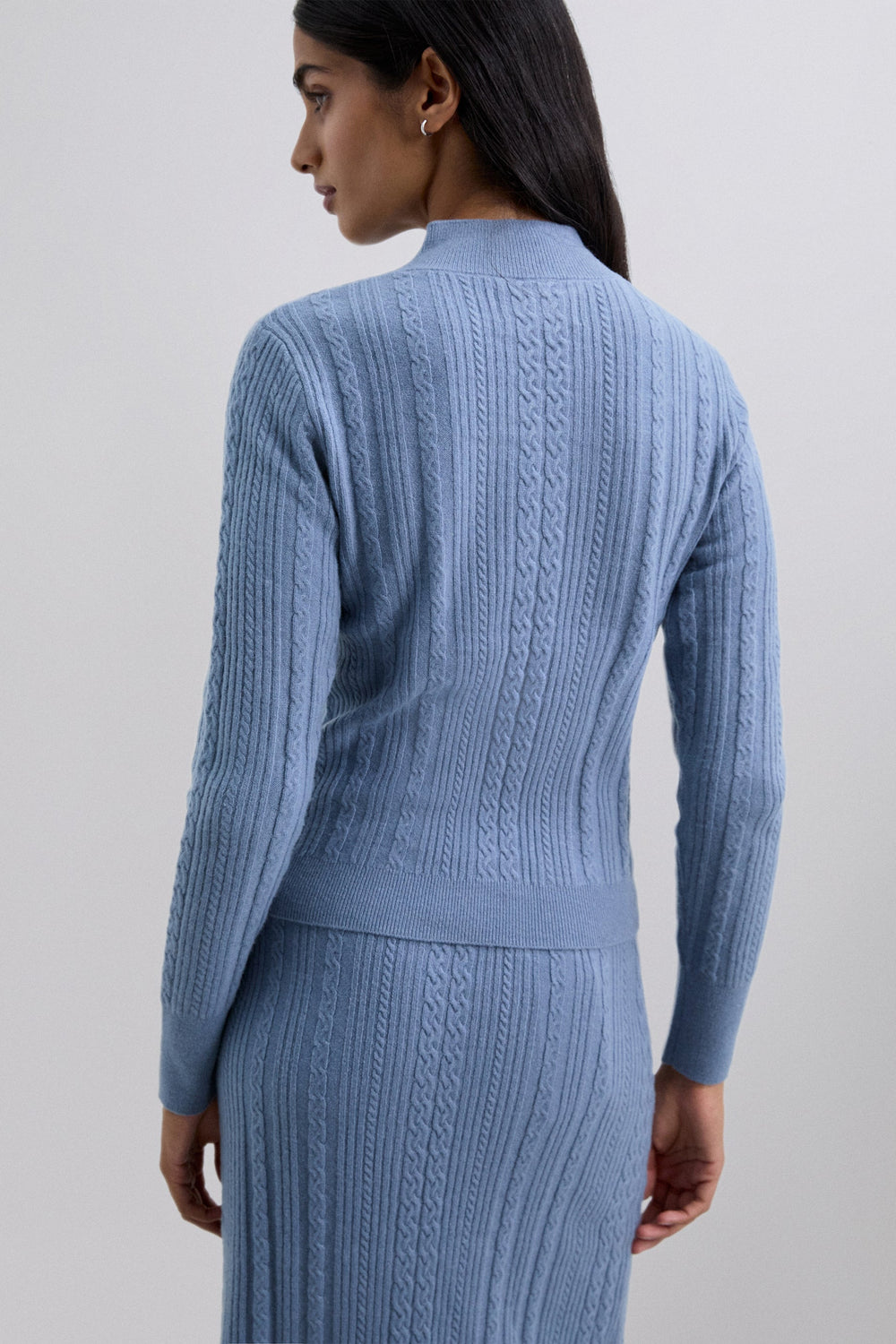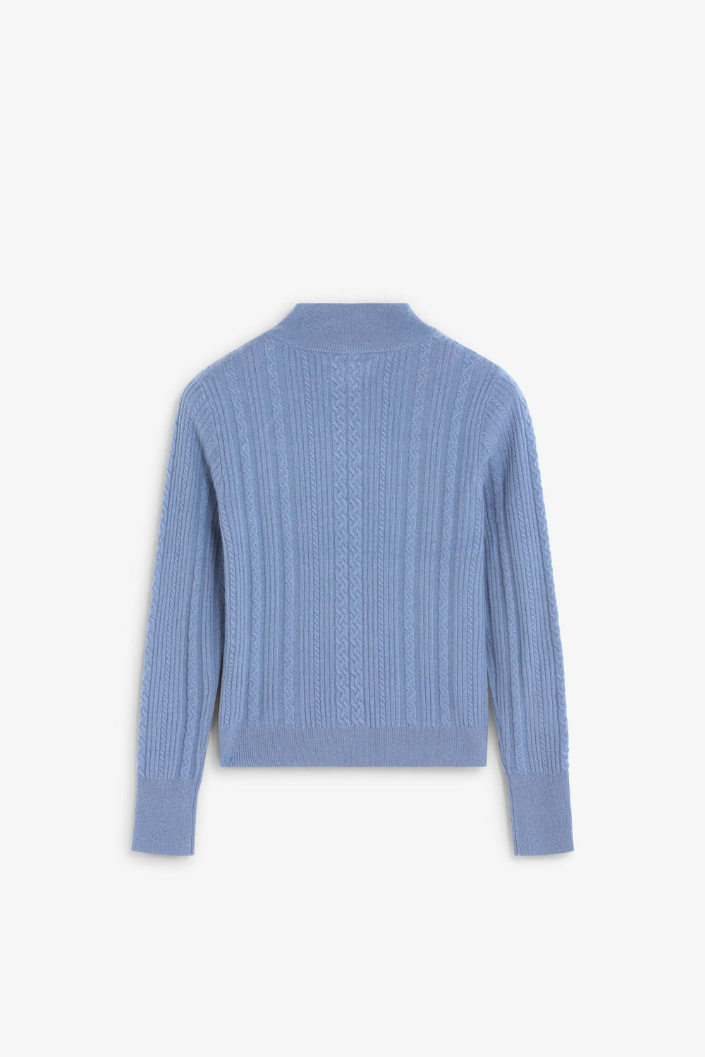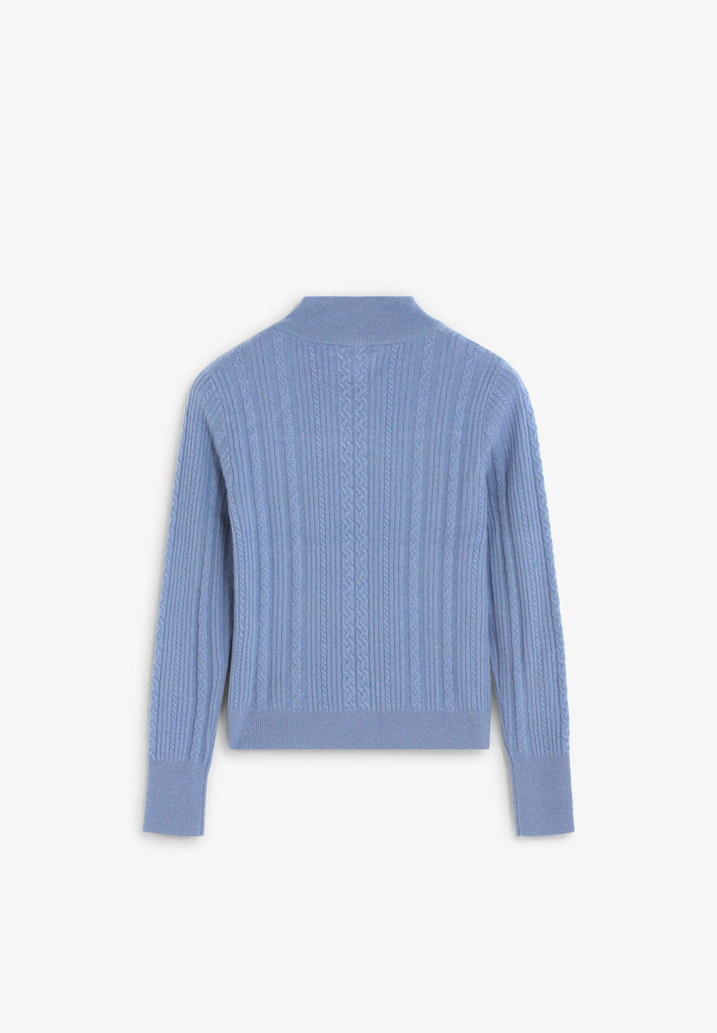 Jersey cable knit confeccionado en mezcla de lana y chachemira. Corte slim fit. Cuello subido con cierre de botones. Abertura en escote.