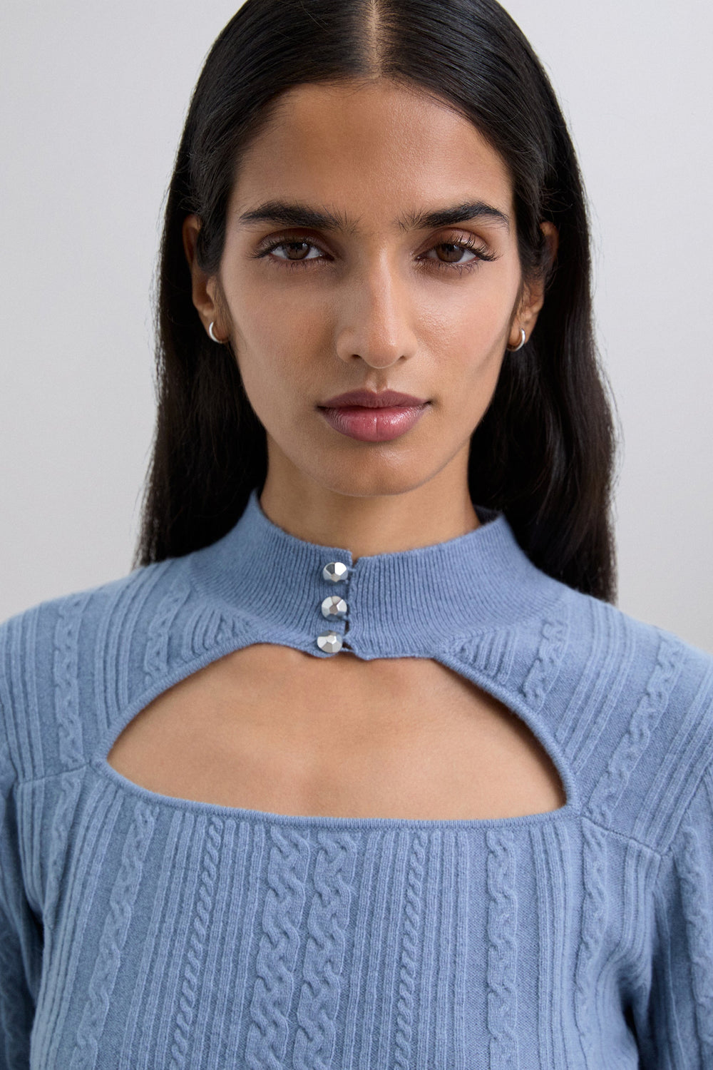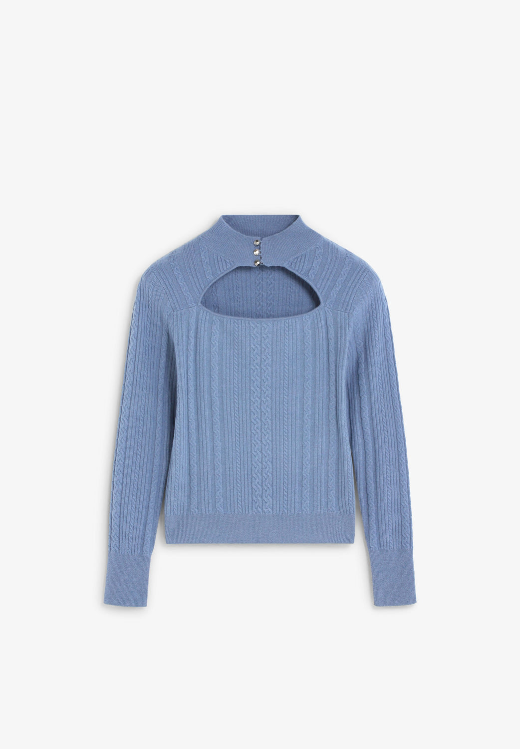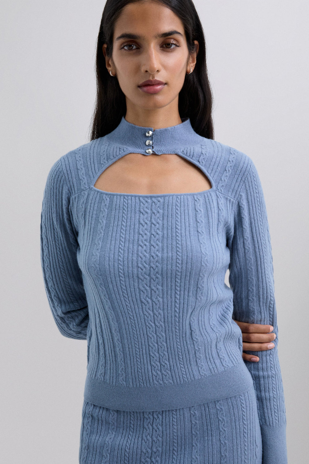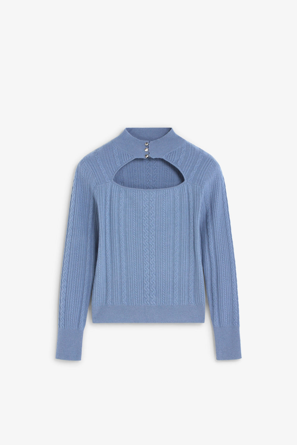 Jersey cable knit confeccionado en mezcla de lana y chachemira. Corte slim fit. Cuello subido con cierre de botones. Abertura en escote.