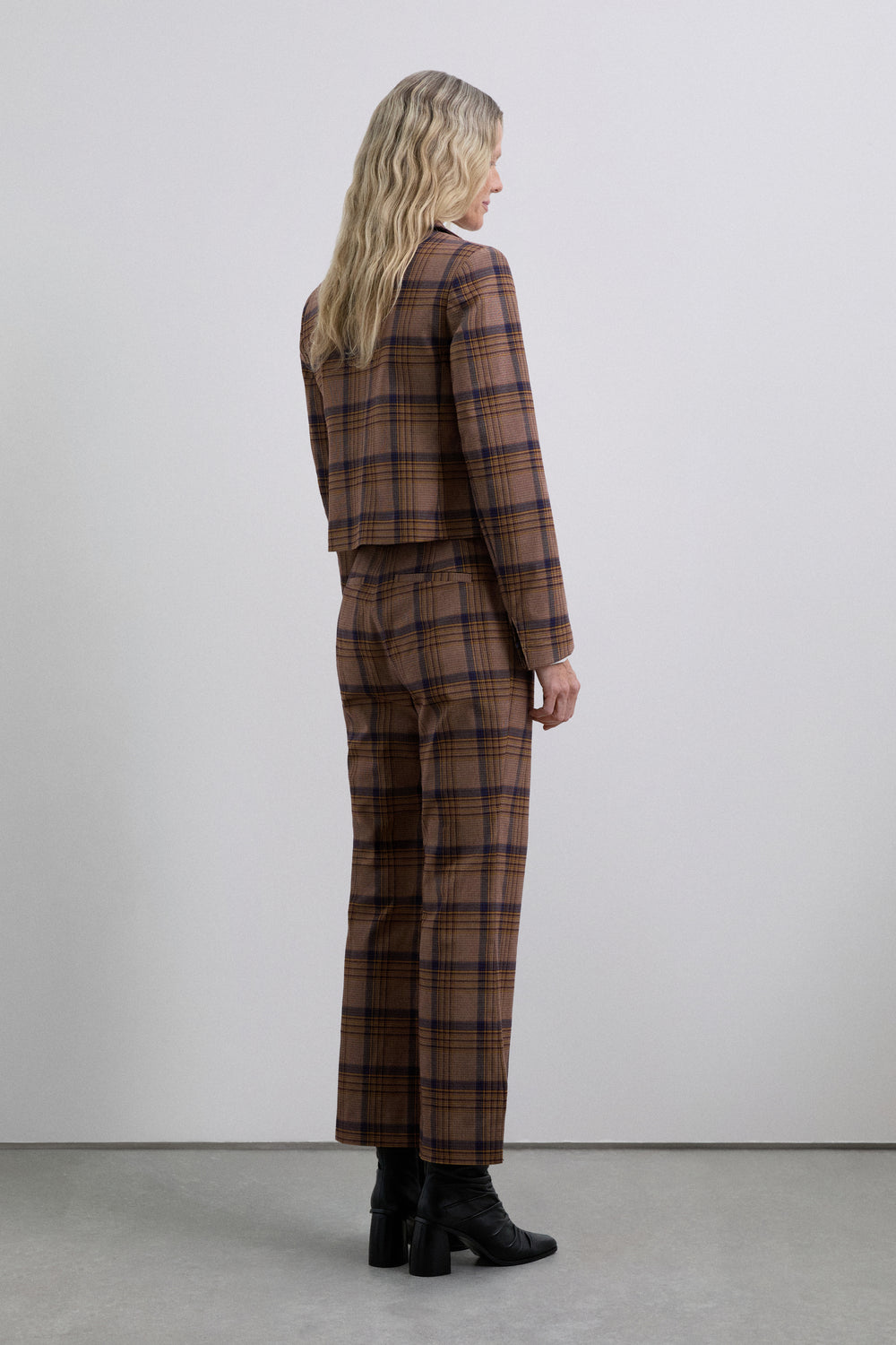 Pantalones ankle flare. Estampado de cuadros. Dos bolsillos laterales y en la parte posterior. Cierre oculto con cremallera y gancho. Trabillas en cintura.