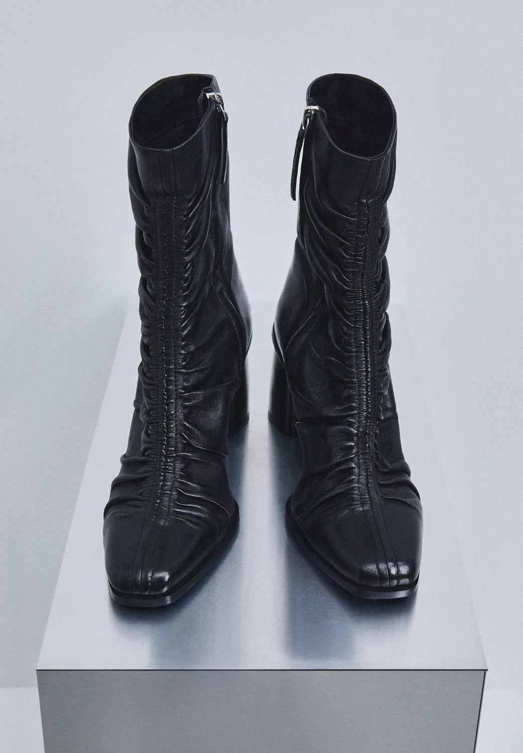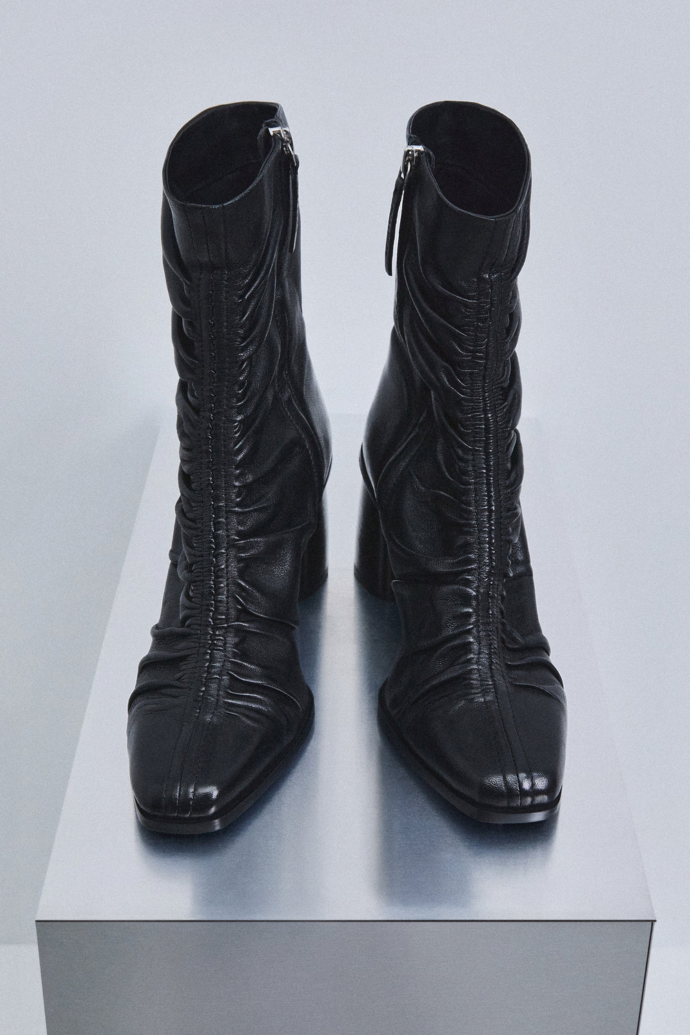 Botas confeccionadas en 100% piel. Tacón medio. Detalle de efecto drapeado en el centro delantero. Cierre con cremallera. Detalle de logo bordado en cremallera. Altura del tacón: 5 cm.