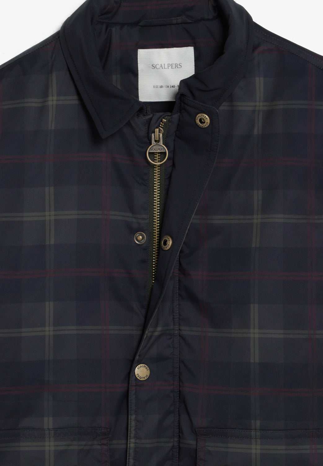Chaqueta de cuadros con cuello a contraste. Cierre principal por cremallera oculta con tirador personalizado y tapeta abotonada. Dos bolsillos laterales con cierre mediante botones a presión. Puños con cierre en punta con botones a presión ajustable.