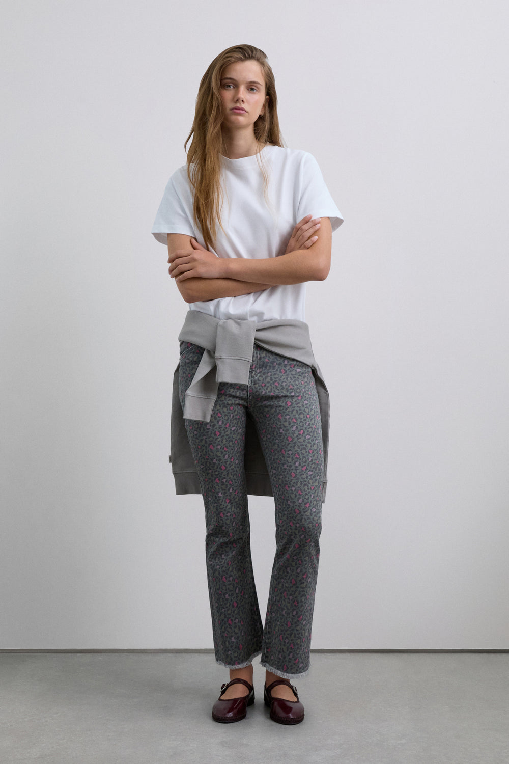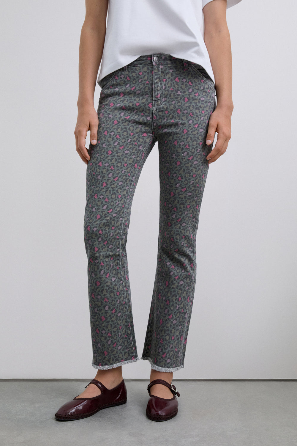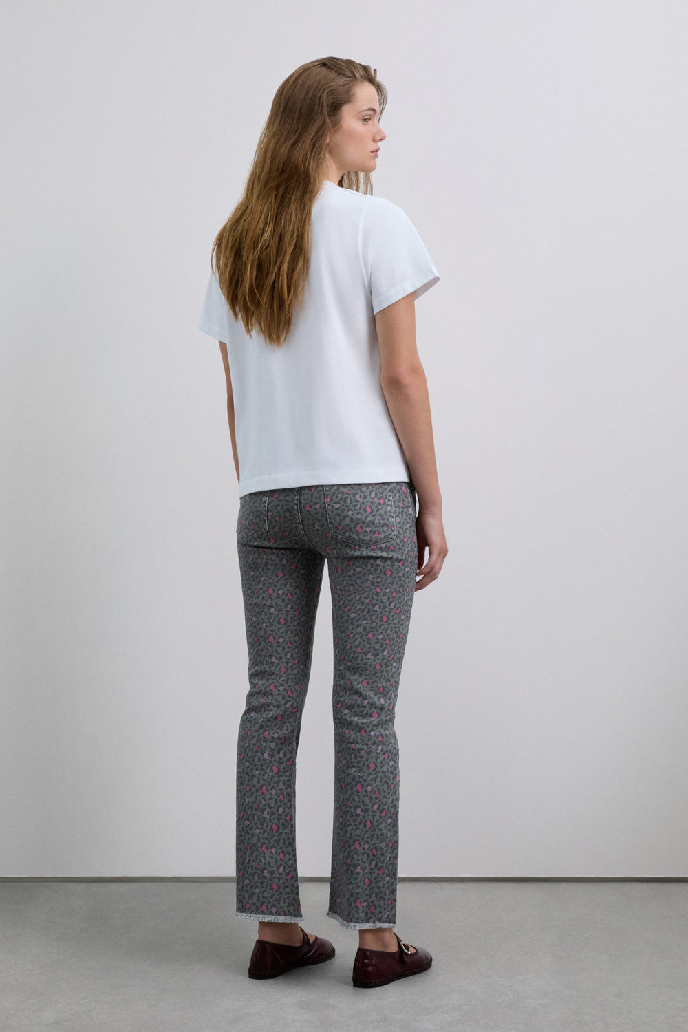Pantalón vaquero. Dos bolsillos en frontal. Dos bolsillos posteriores con detalle de etiqueta con logo y calavera. Motivo desflecado en bajos. Trabillas en cintura. Cierre mediante botón y cremallera. Animal print.